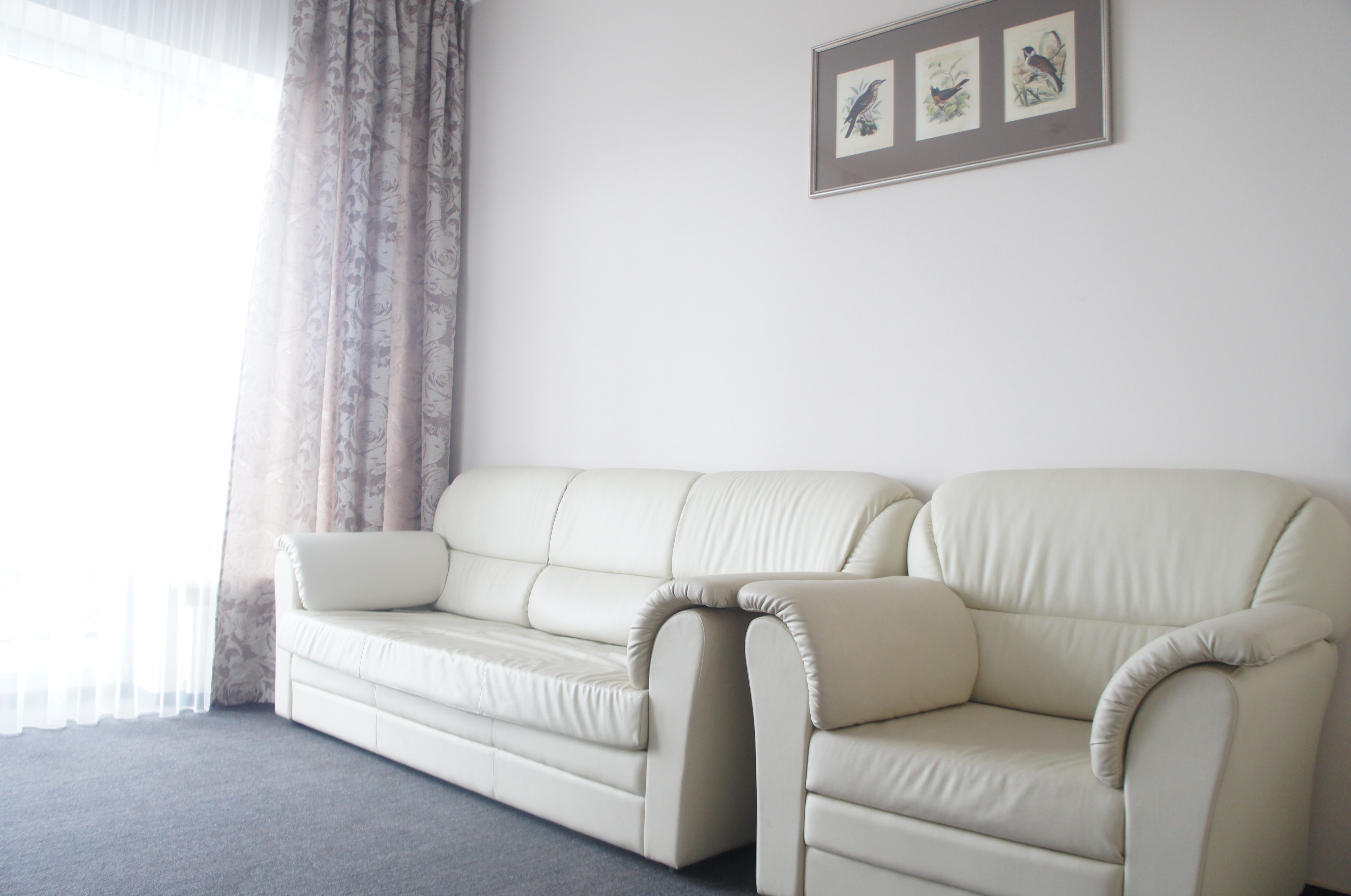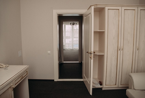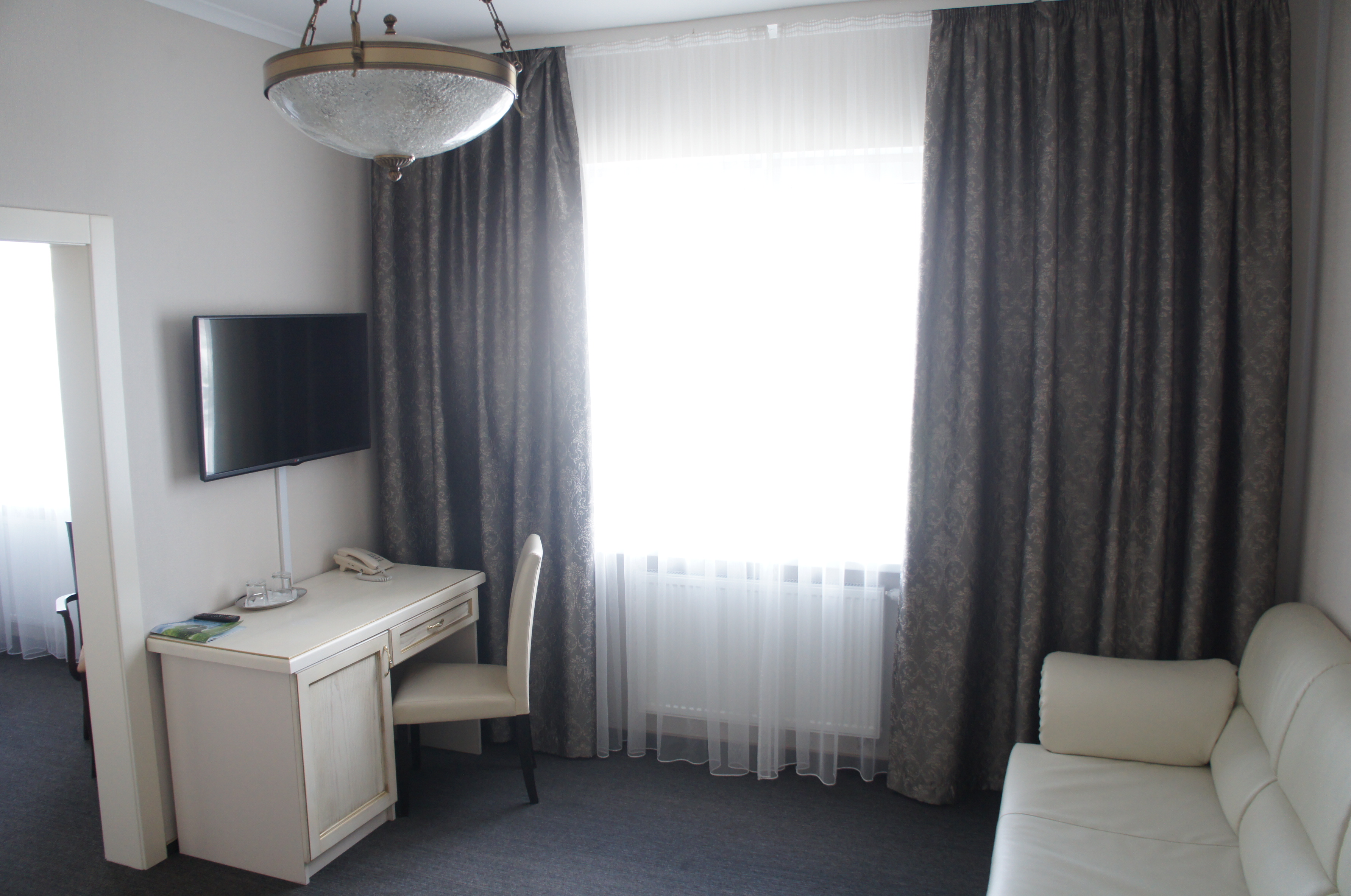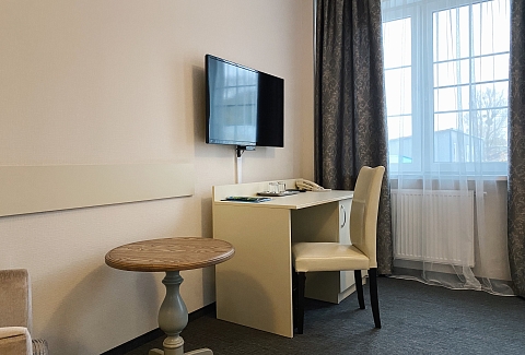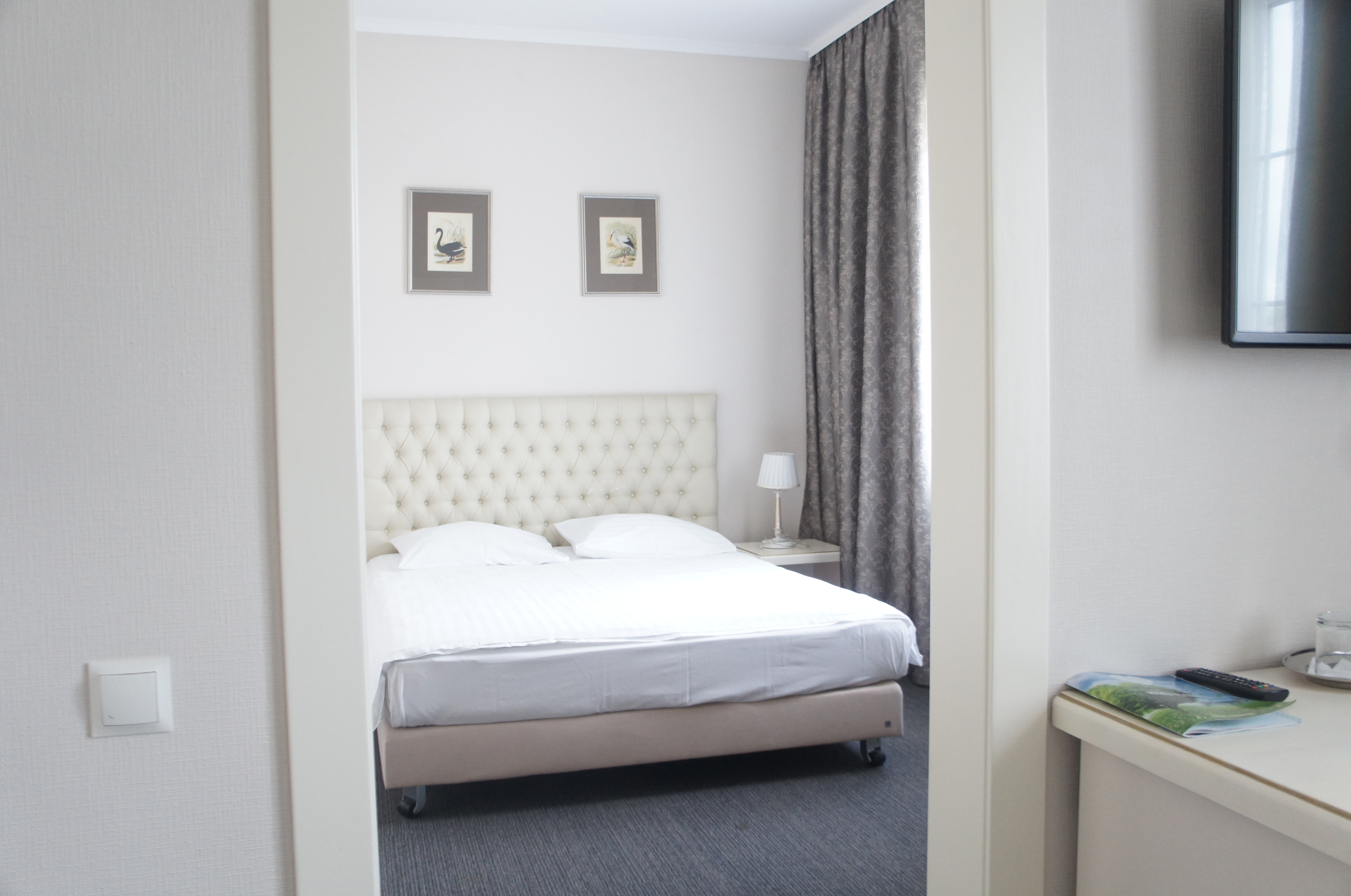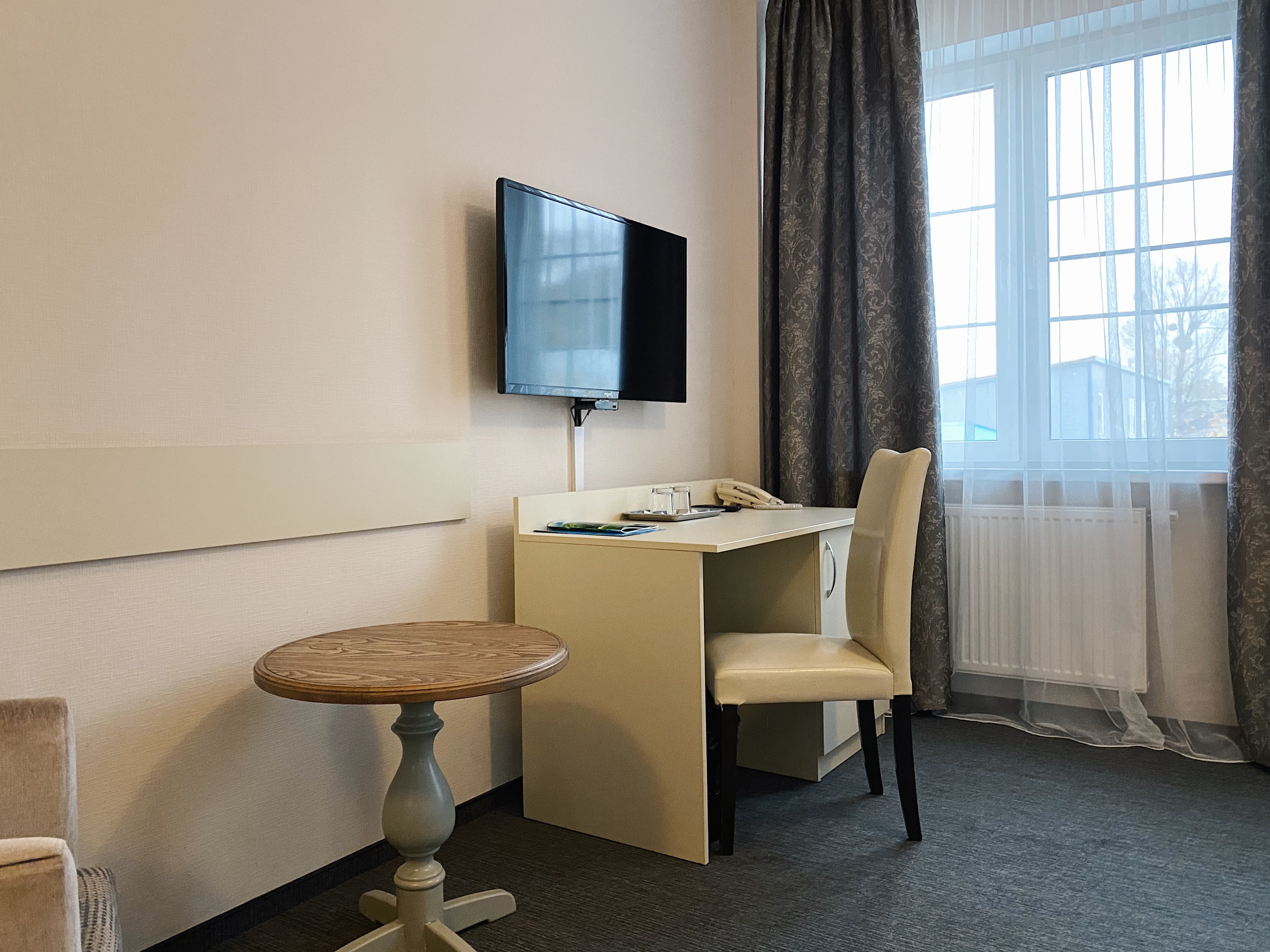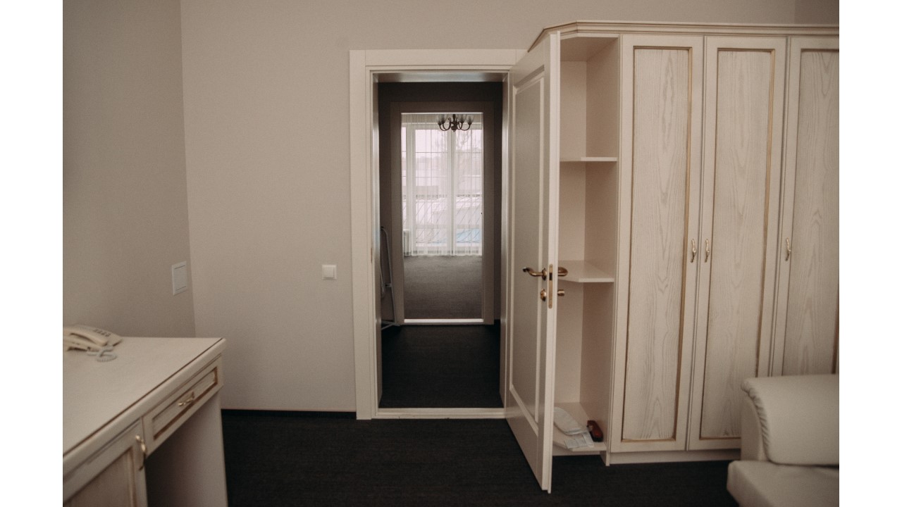 В номере: диван раскладной, зеркало, ковровое покрытие, кресла, кровать двуспальная, прикроватные тумбочки, стол, столик журнальный, стул, шкаф, телевизор, холодильник, чайный набор посуды, электрочайник