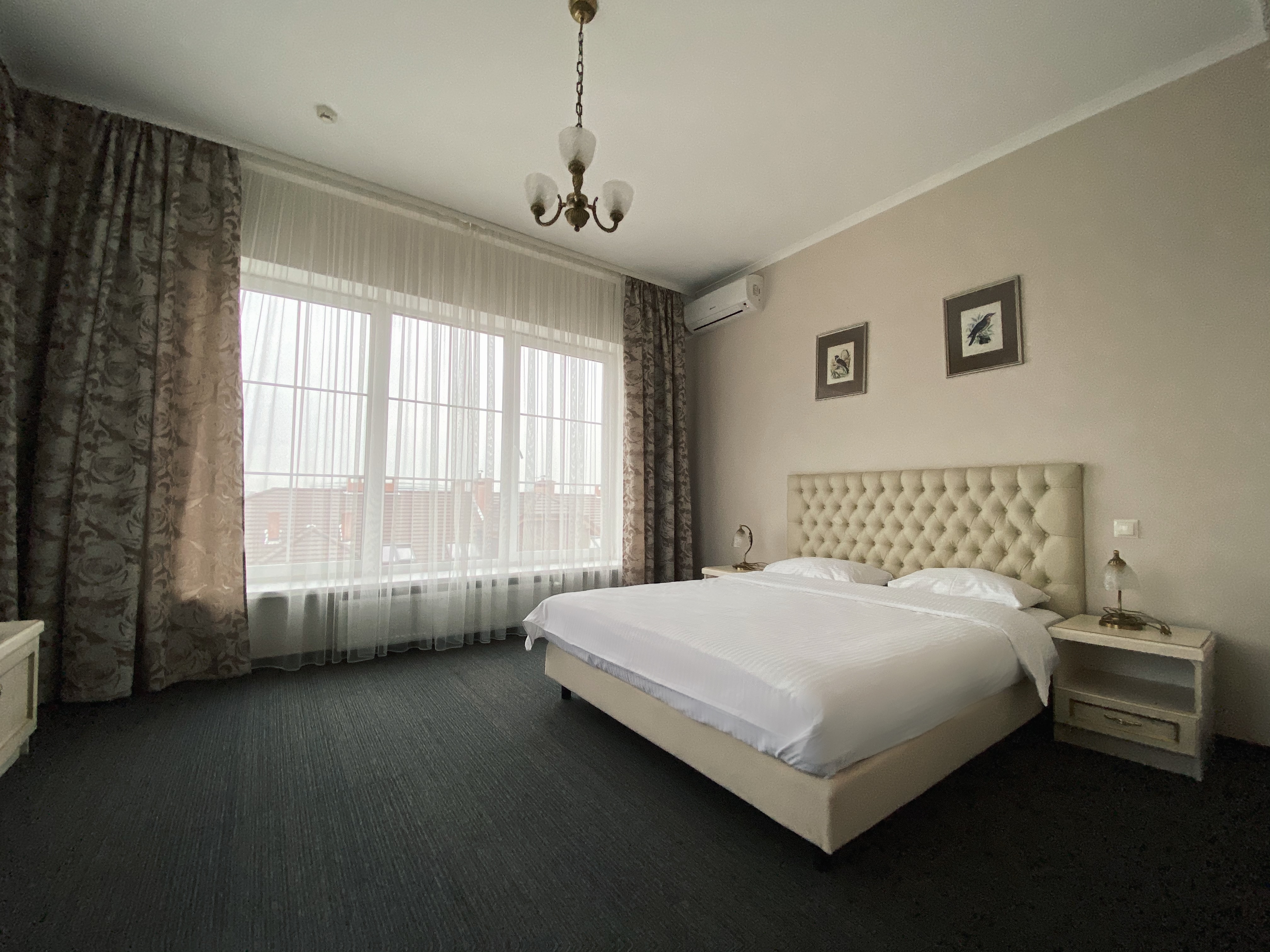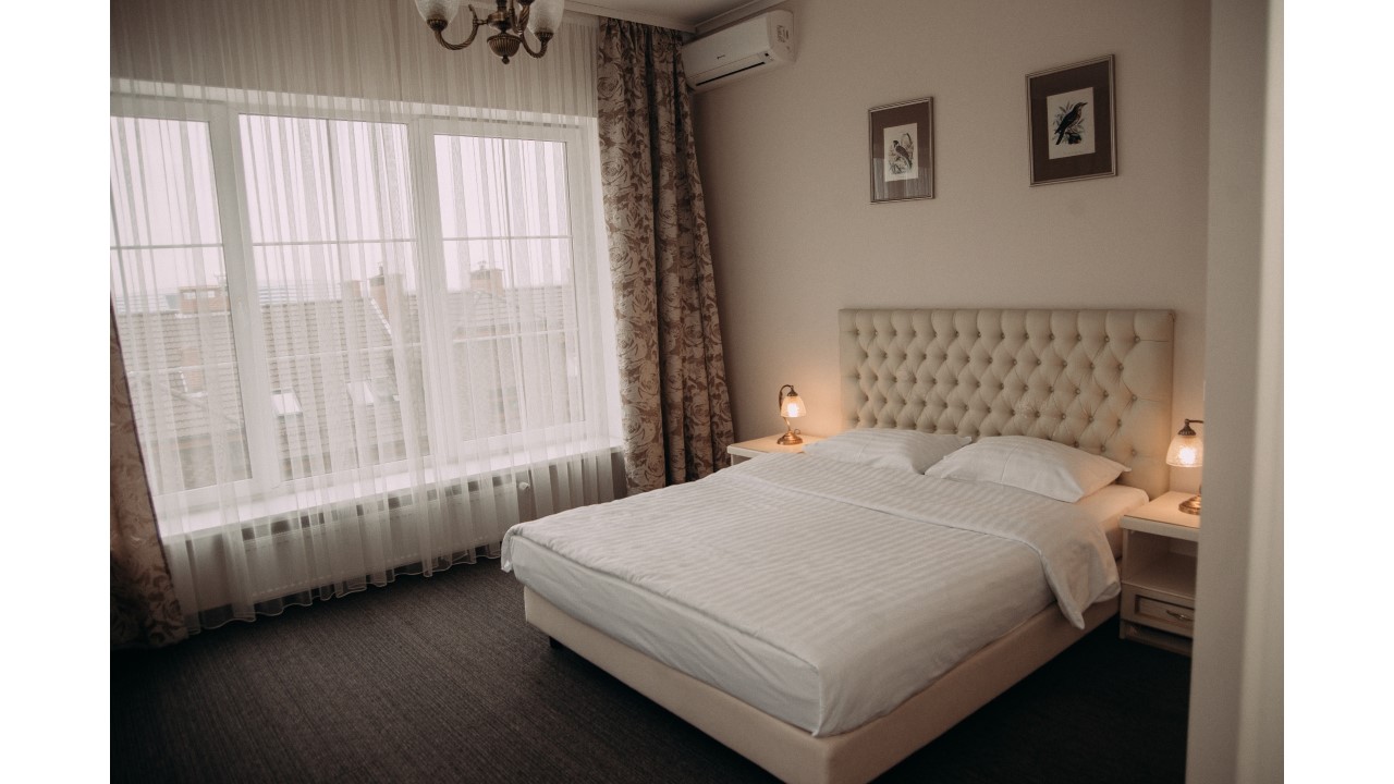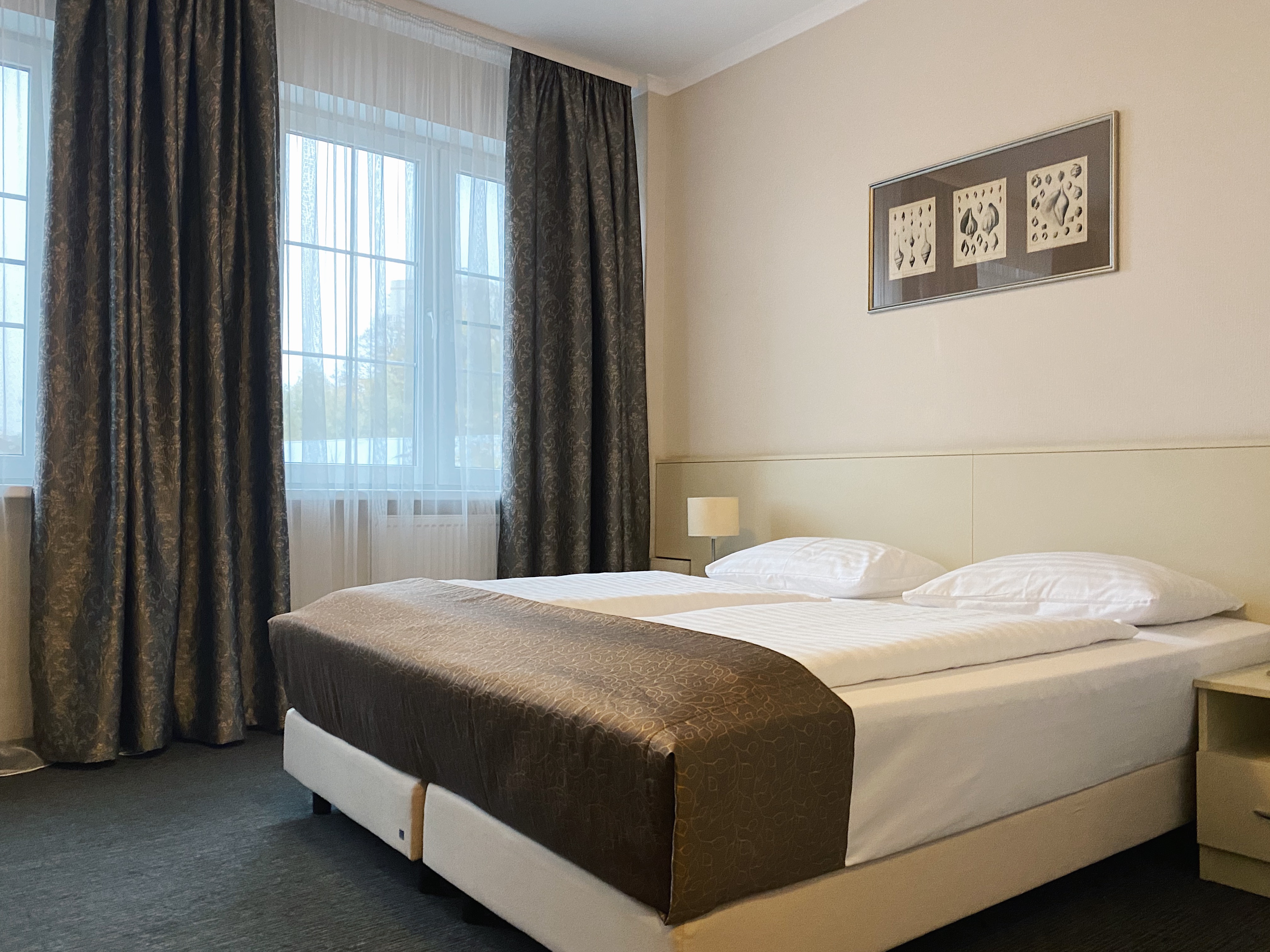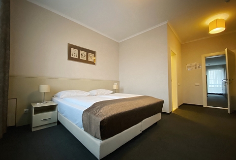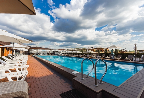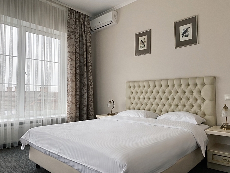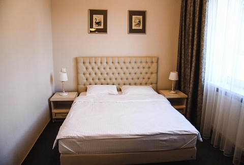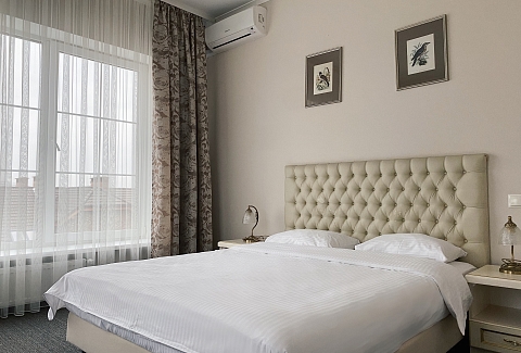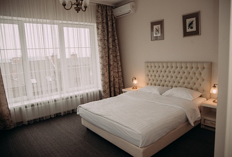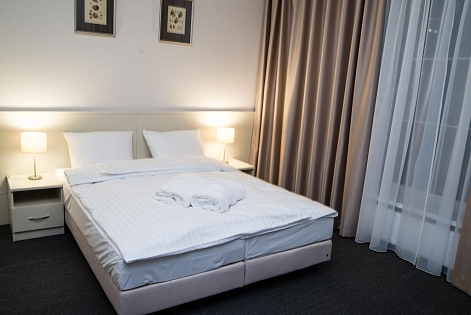 Современный трехэтажный корпус отеля с благоустроенным внутренним двором предлагает отдыхающим просторные светлые номера разных категорий комфорта. В каждом номере есть большая двуспальная кровать, ЖК-телевизор, холодильник, фен, санузел с душевой кабиной или ванной. В распоряжении гостей банный комплекс с баней, сауной и хаммамом и открытый бассейн с зоной отдыха по периметру. Возле корпуса организована охраняемая автостоянка, на территории работает беспроводной интернет, гостям доступна аренда автомобиля.