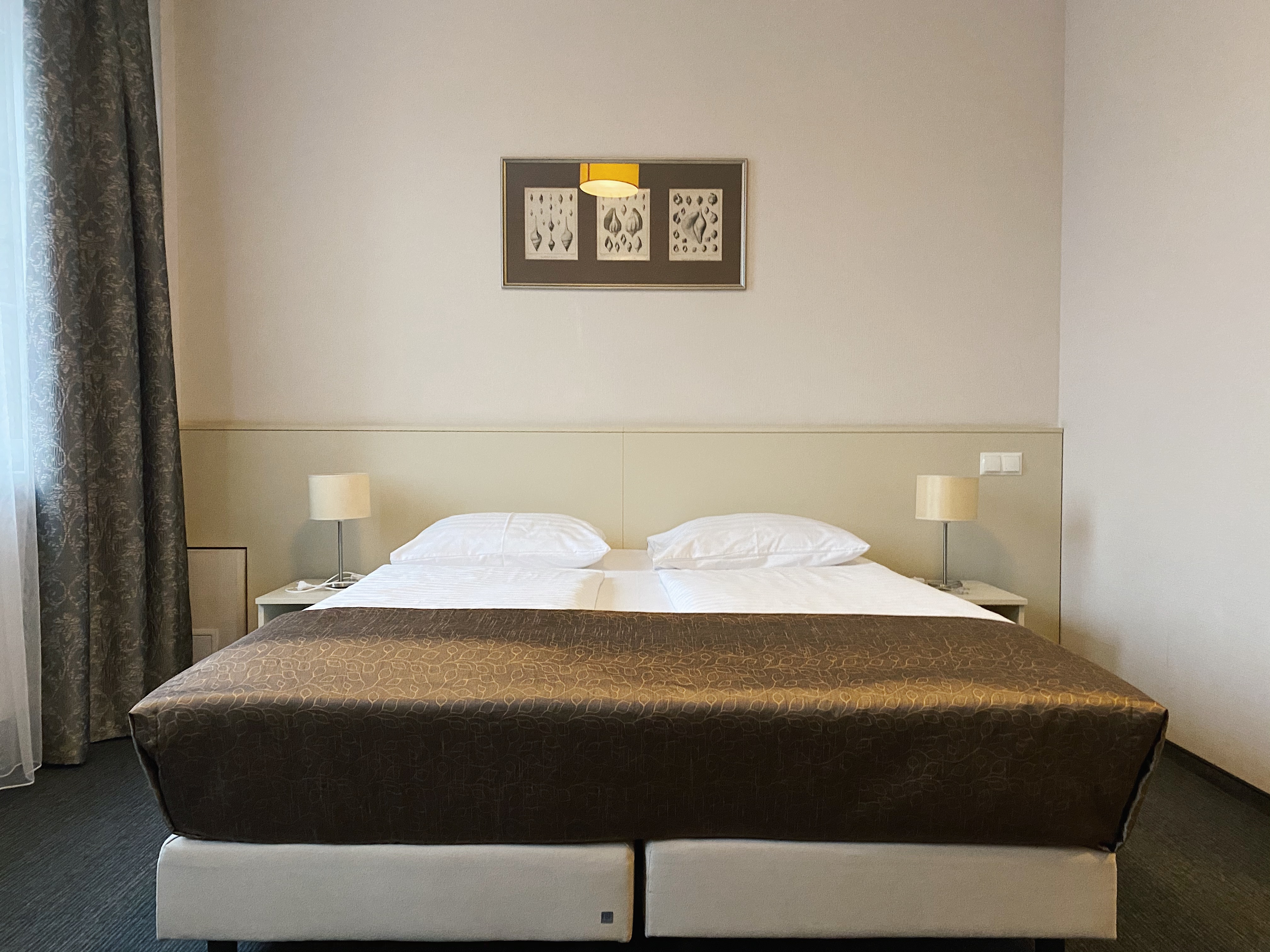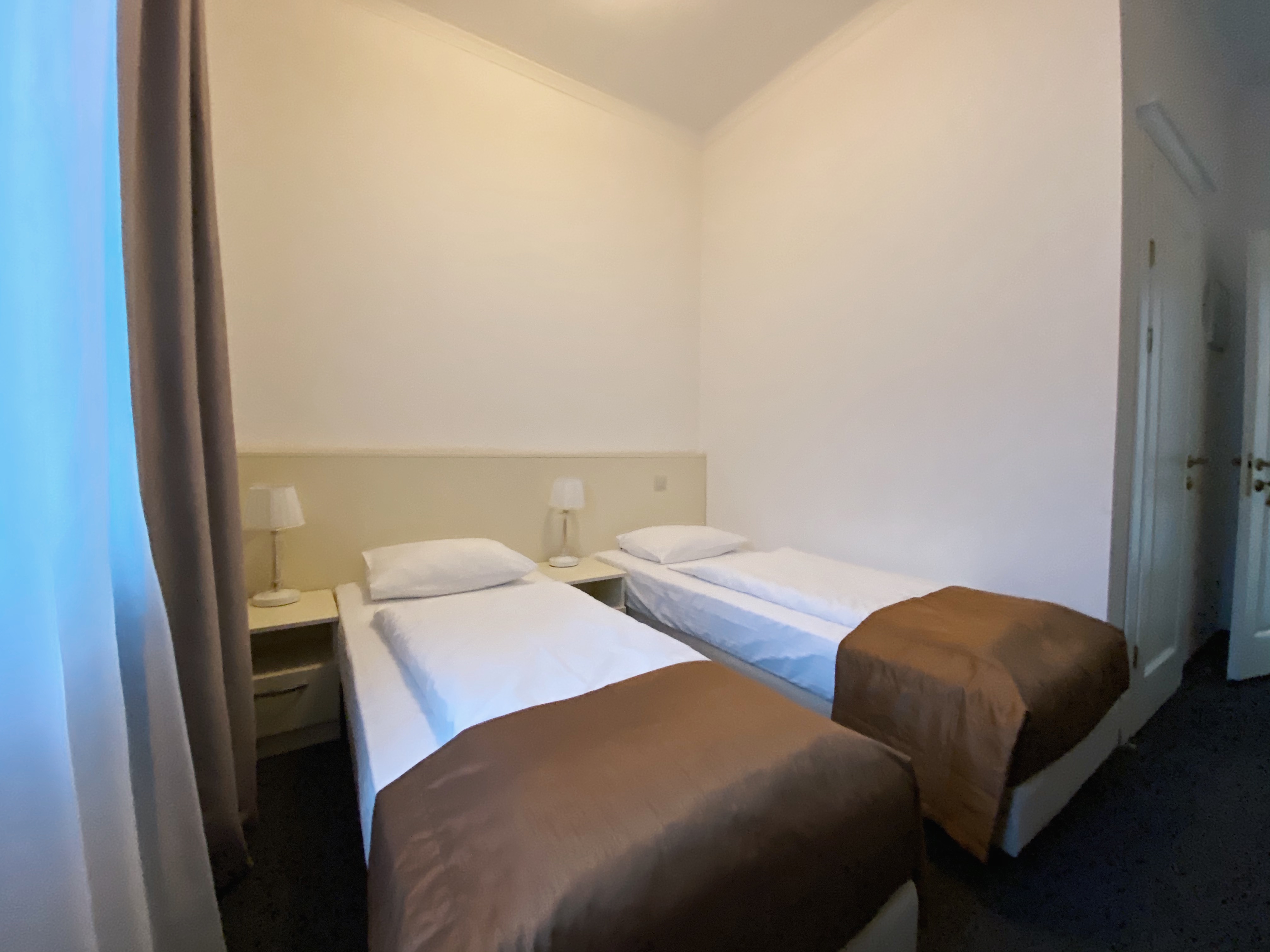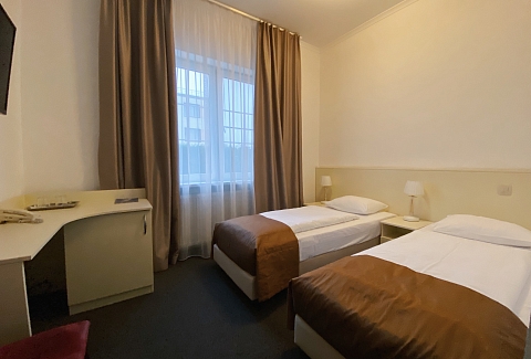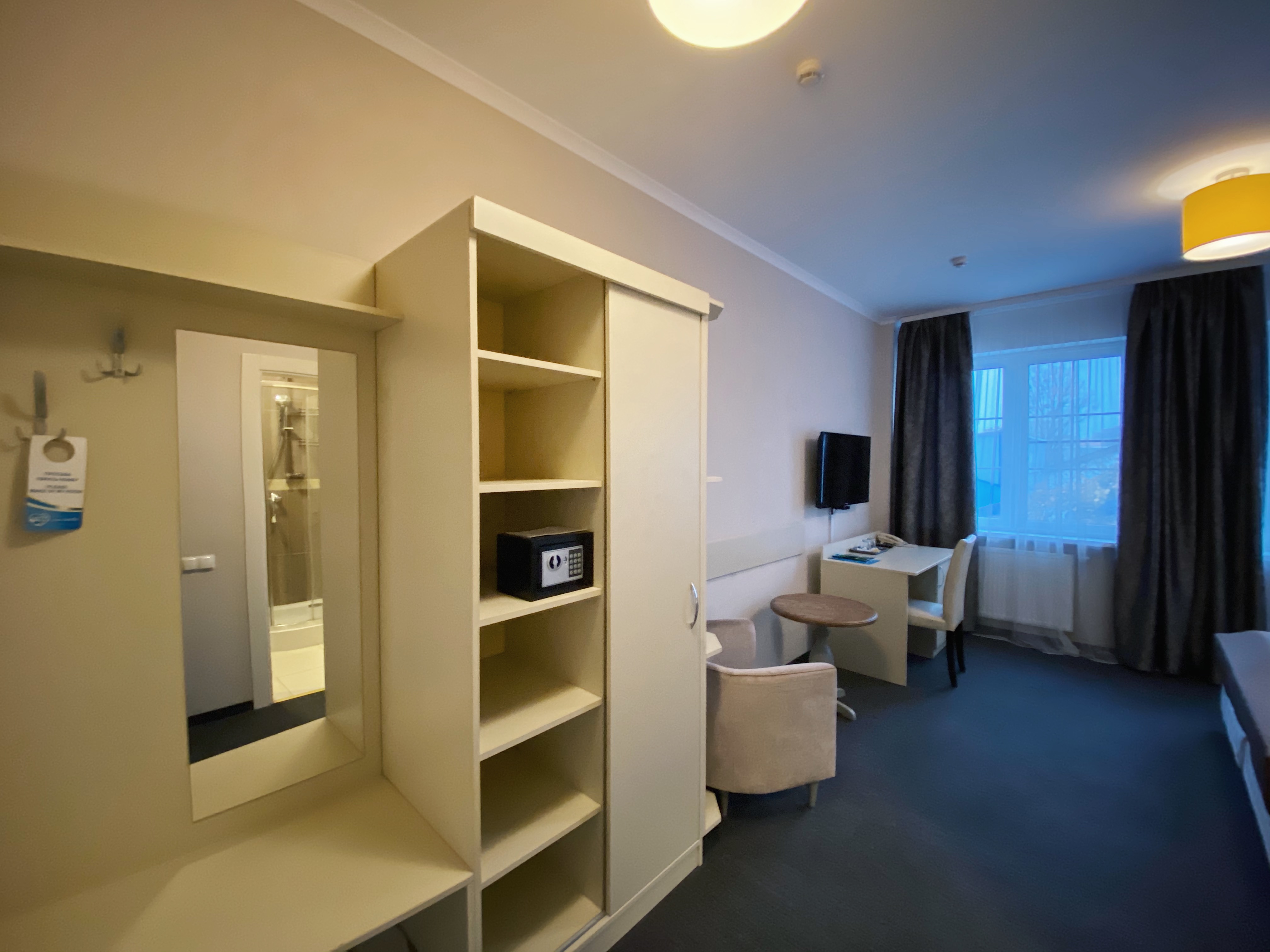 В номере: вешалка, зеркало, ковровое покрытие, кровати односпальные /одна двуспальная кровать, прикроватные тумбочки, стол, шкаф, телевизор ЖК, холодильник