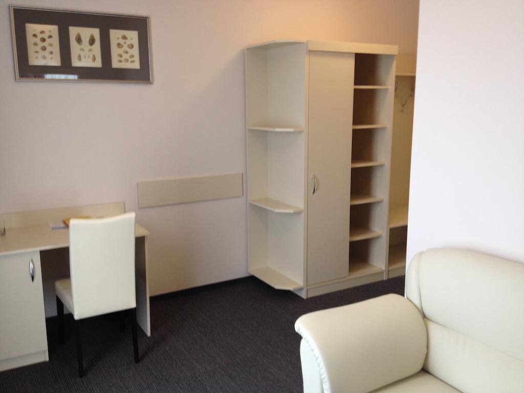 В номере: вешалка, диван раскладной, зеркало, ковровое покрытие, кровать двуспальная, прикроватные тумбочки, стол, стул, шкаф, кондиционер, телевизор ЖК, холодильник