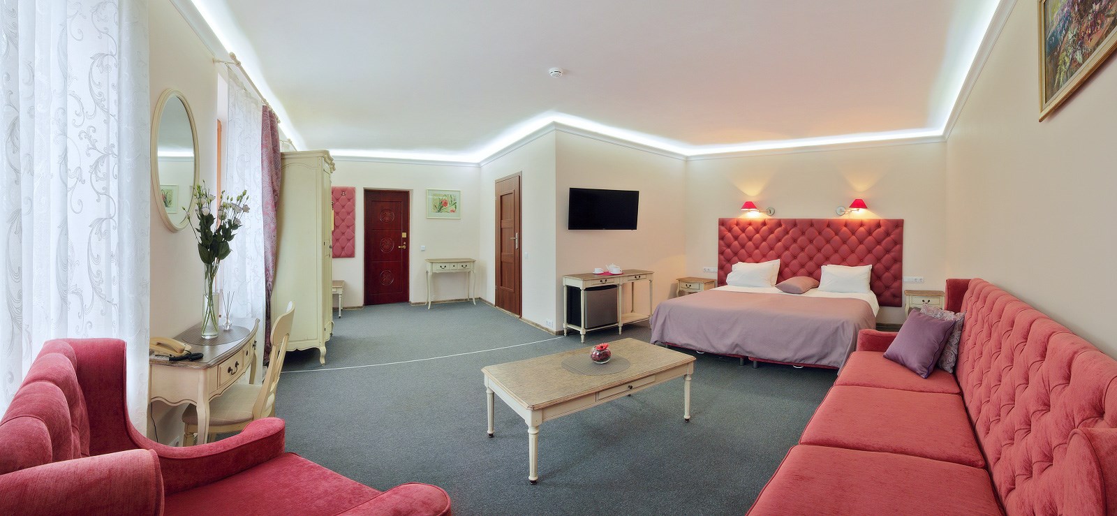 В номере: зеркало, кровать двуспальная, стол, стулья, шкаф, кондиционер, телевизор ЖК, электрочайник