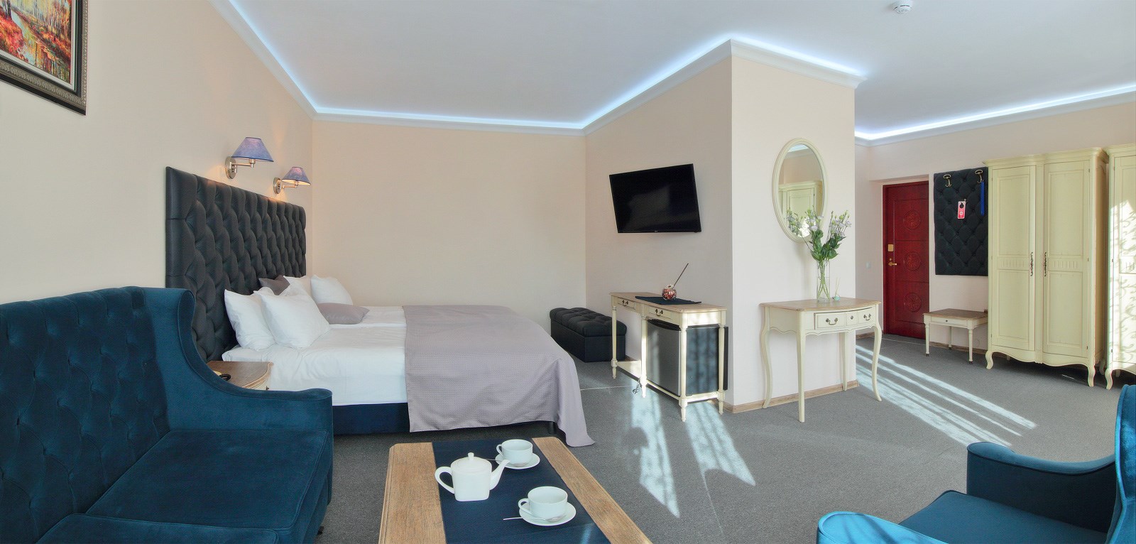 В номере: зеркало, кровать двуспальная, стол, стул, шкаф, кондиционер, телевизор ЖК, электрочайник