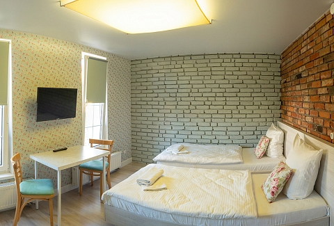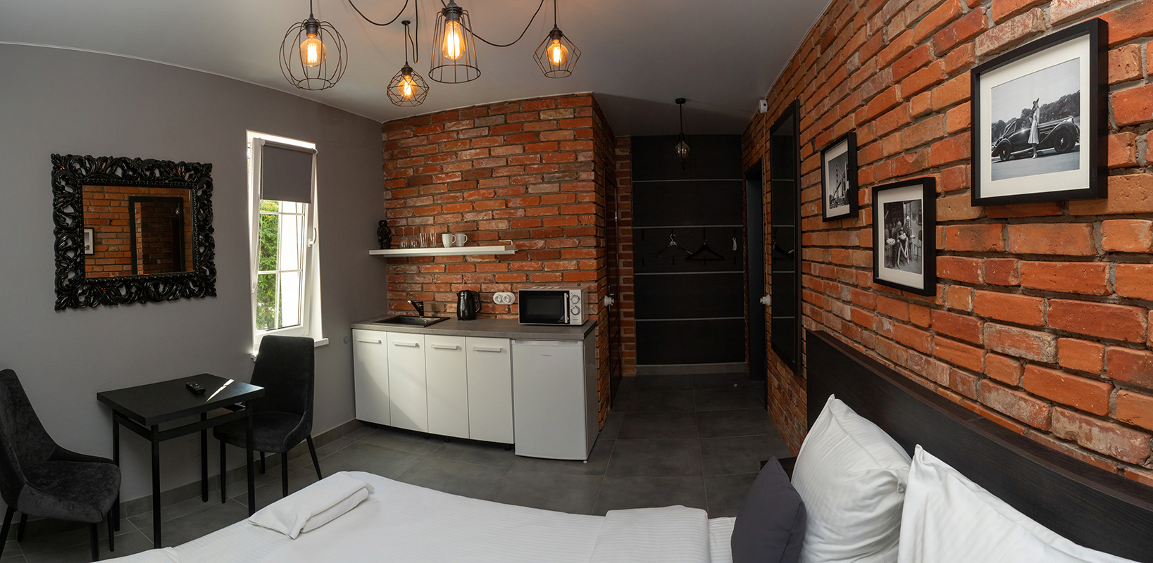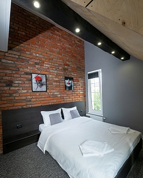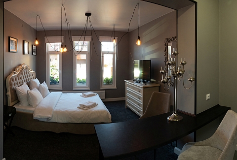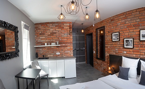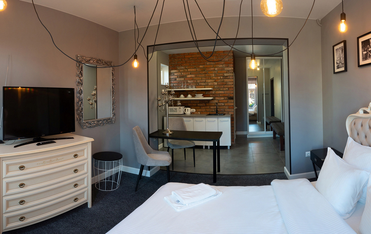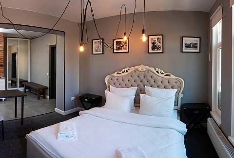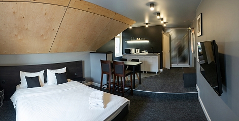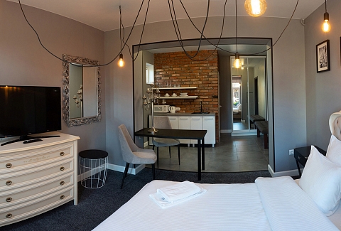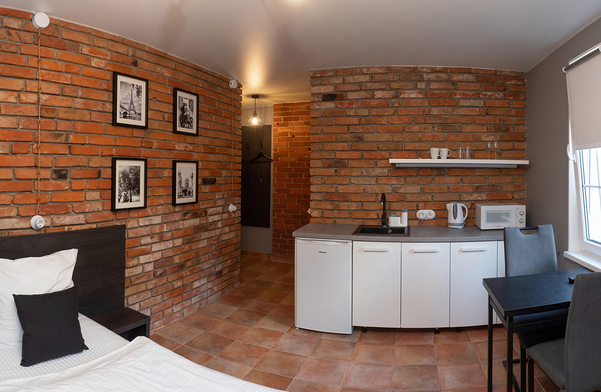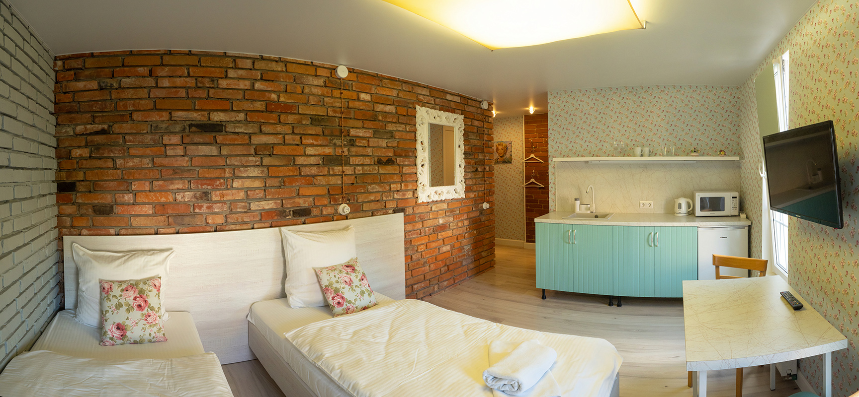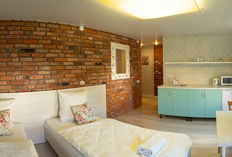Во всех номерах стильный современный интерьер, выдержанный в интересной цветовой гамме с использованием как традиционных пастельных тонов, так и современных стальных и глубоких синих оттенков, в некоторых комнатах прослеживаются элементы популярного стиля лофт. Все номера оснащены кухней, оборудованной посудой и техникой, в ванных комнатах установлена душевая кабина, а для гостей подготовлены косметические наборы.Для отдыхающих во внутреннем дворике организована зона барбекю с мангалами, также в распоряжении гостей банный комплекс с парилкой, сауной и бассейном, где можно отдохнуть или расслабиться после активного дня.