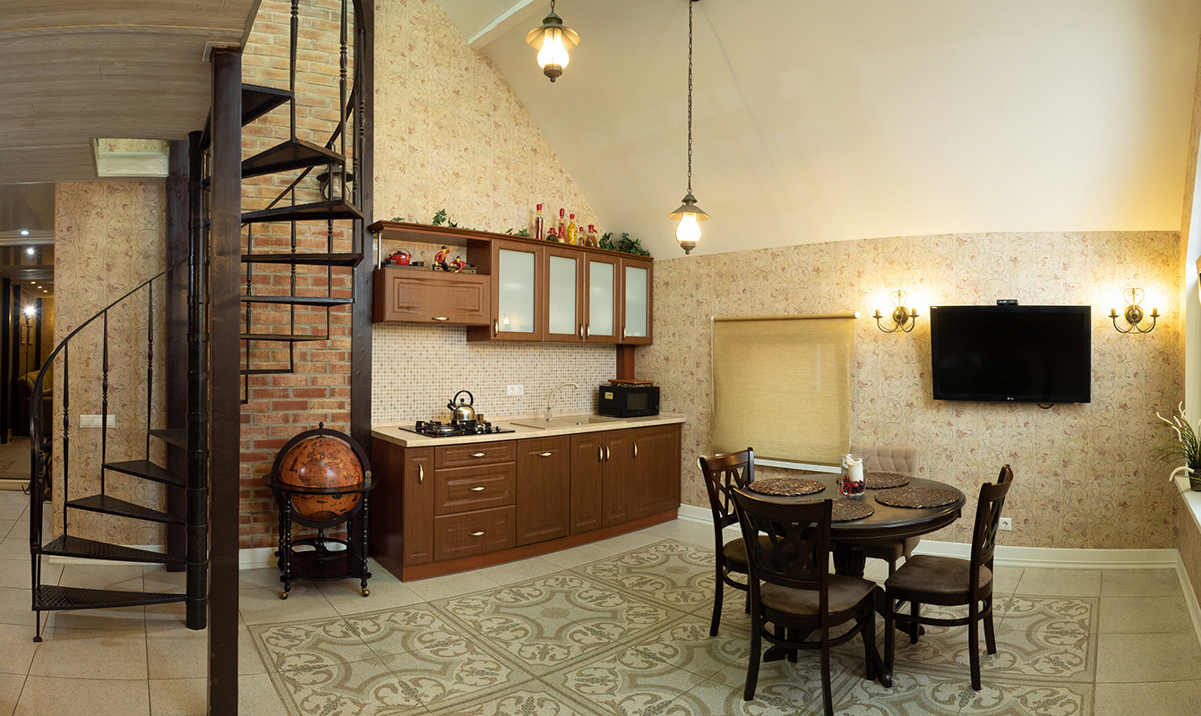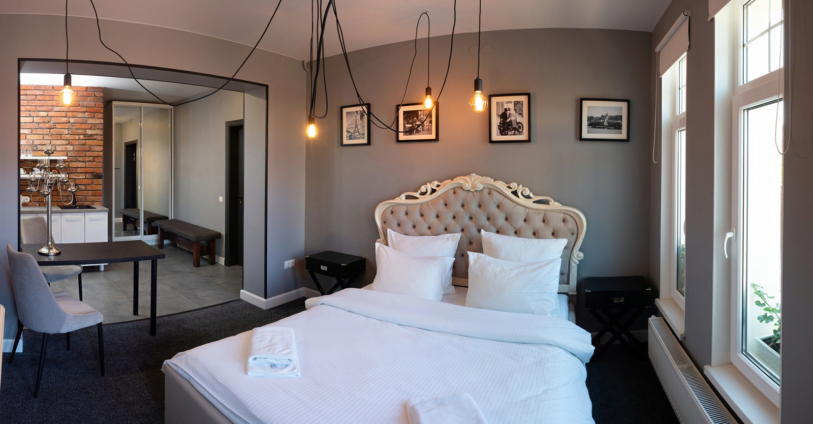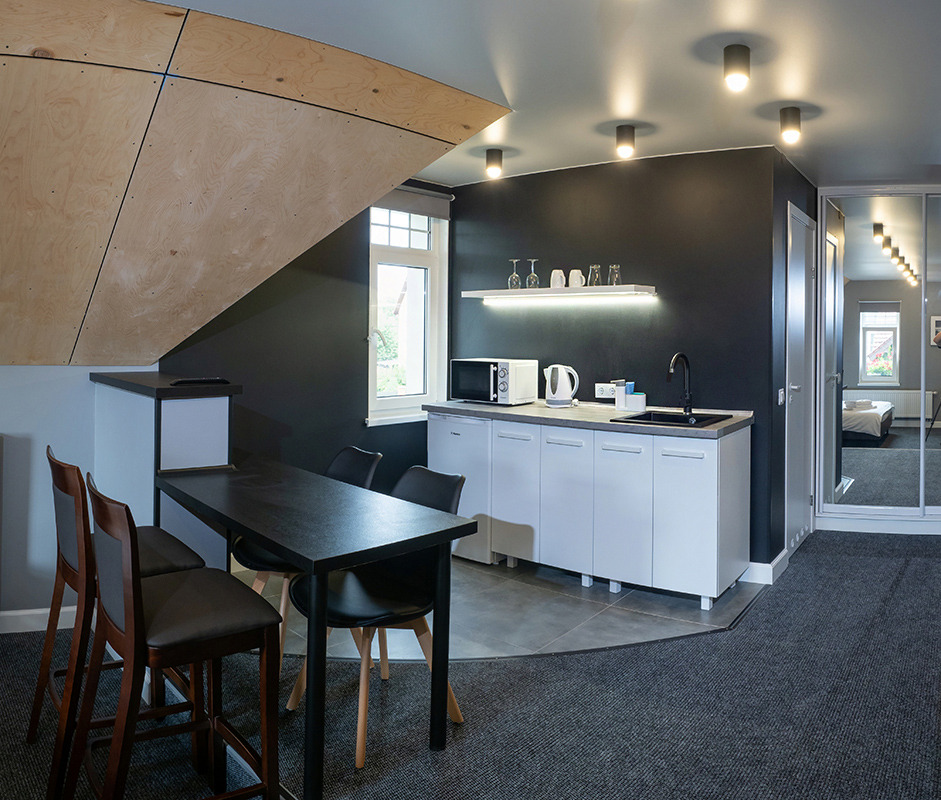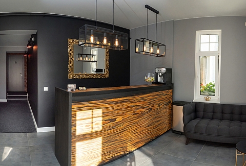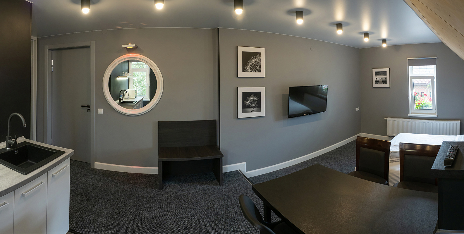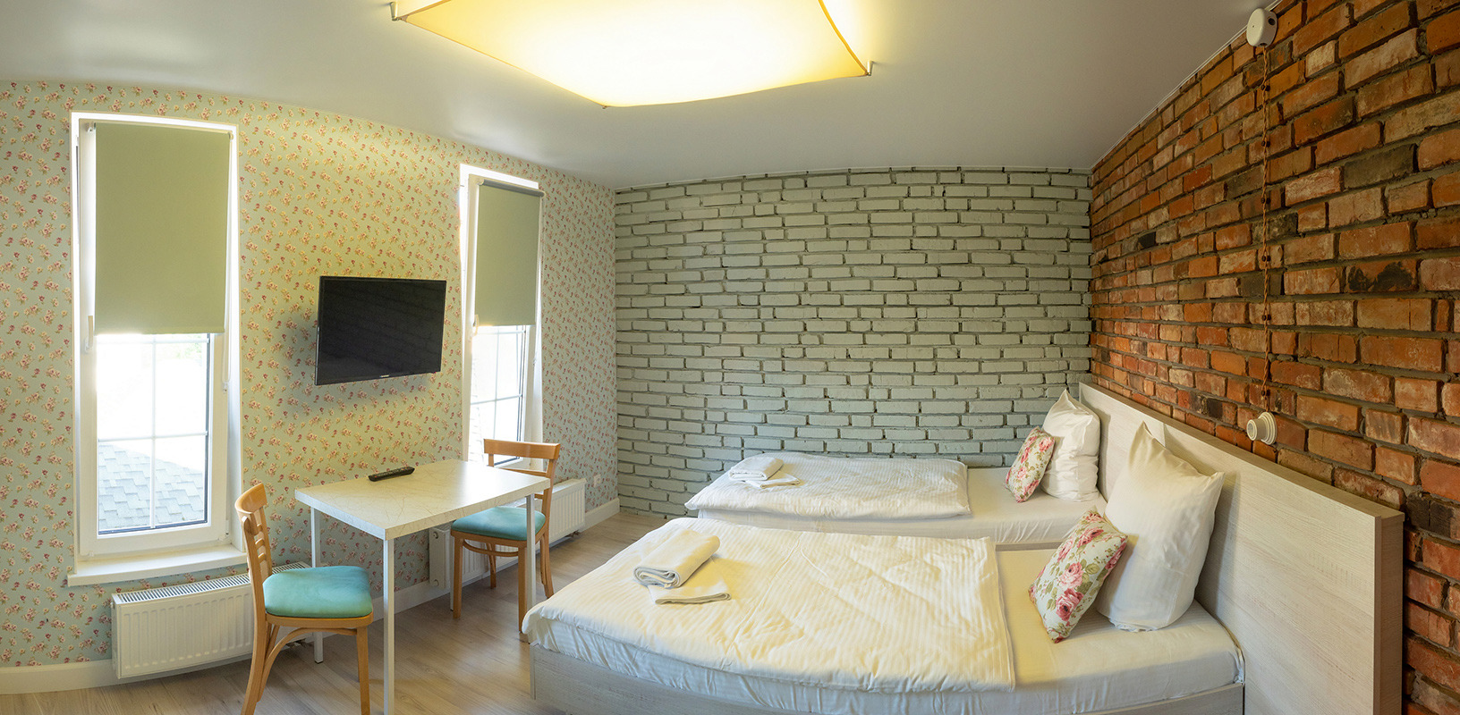 Во всех номерах стильный современный интерьер, выдержанный в интересной цветовой гамме с использованием как традиционных пастельных тонов, так и современных стальных и глубоких синих оттенков, в некоторых комнатах прослеживаются элементы популярного стиля лофт. Все номера оснащены кухней, оборудованной посудой и техникой, в ванных комнатах установлена душевая кабина, а для гостей подготовлены косметические наборы.Для отдыхающих во внутреннем дворике организована зона барбекю с мангалами, также в распоряжении гостей банный комплекс с парилкой, сауной и бассейном, где можно отдохнуть или расслабиться после активного дня.