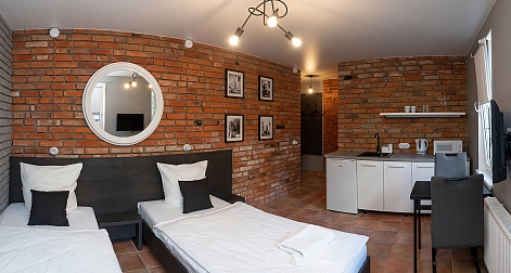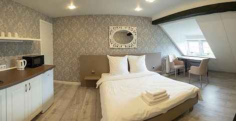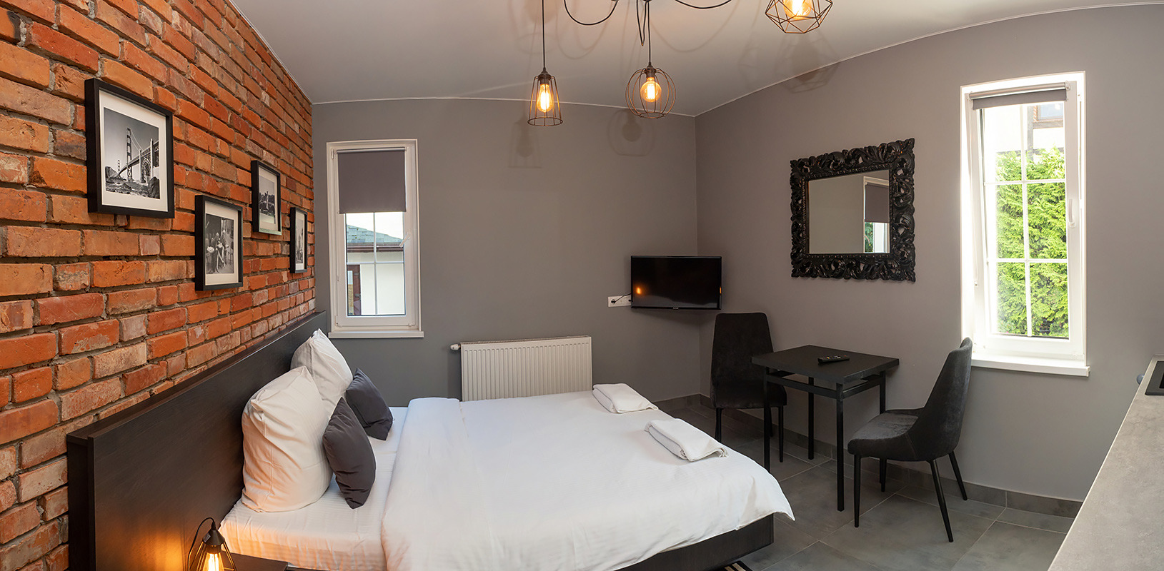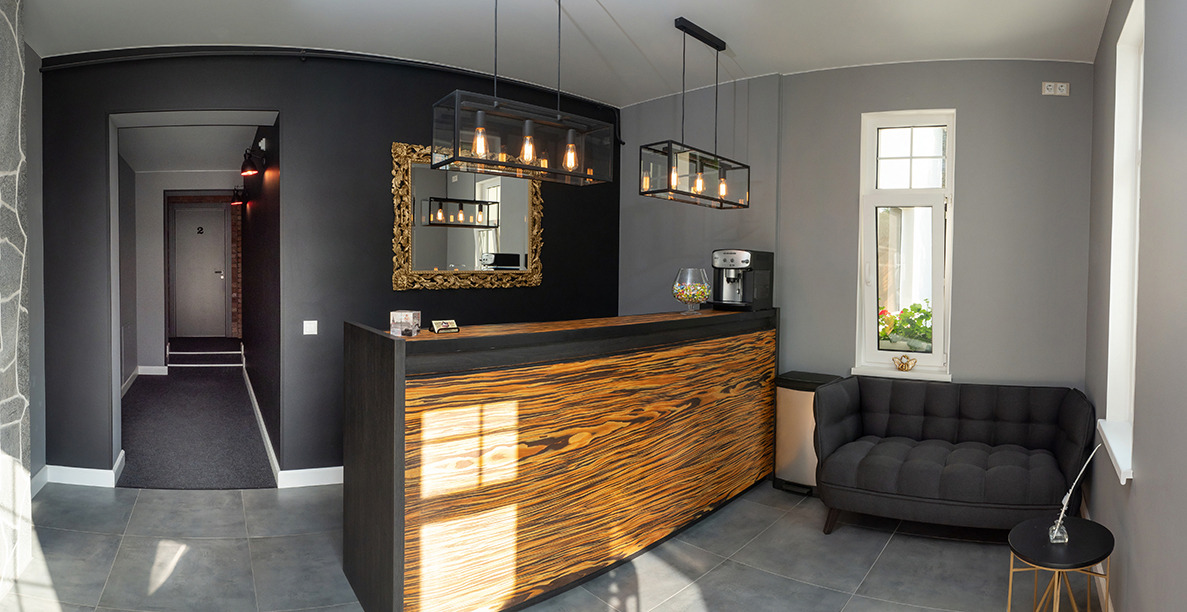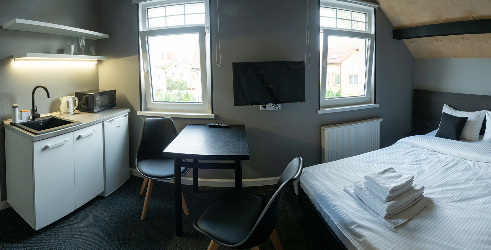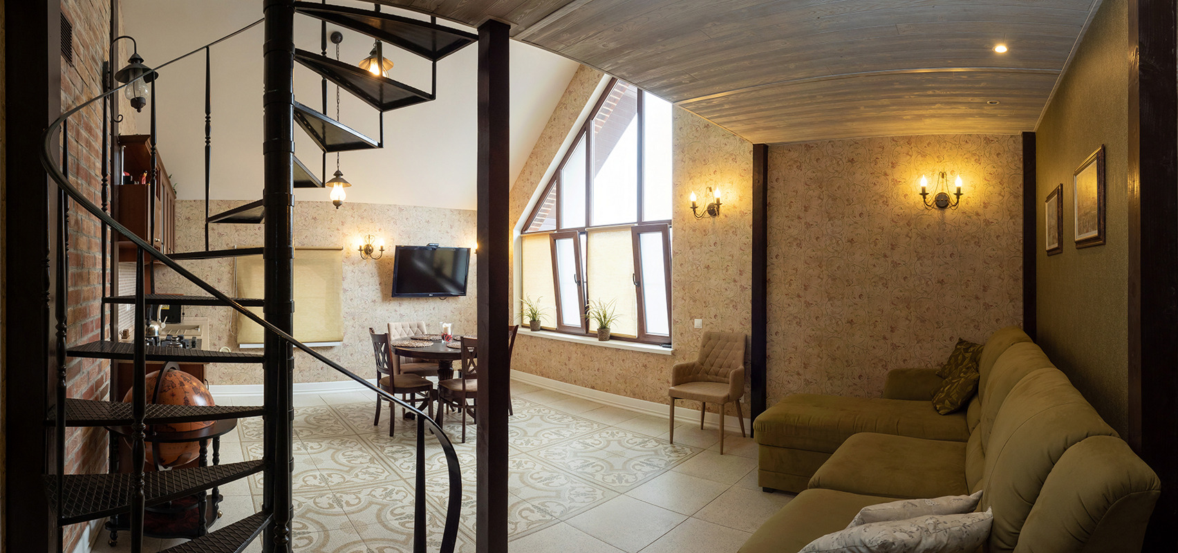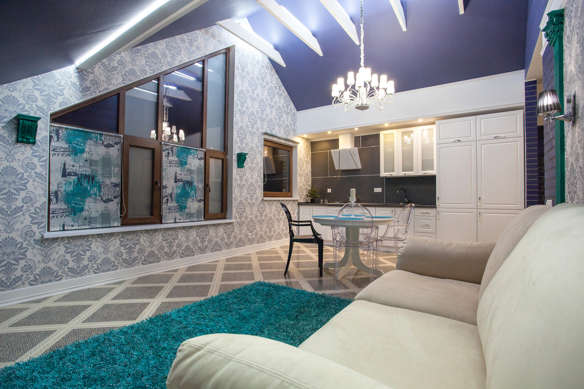Во всех номерах стильный современный интерьер, выдержанный в интересной цветовой гамме с использованием как традиционных пастельных тонов, так и современных стальных и глубоких синих оттенков, в некоторых комнатах прослеживаются элементы популярного стиля лофт. Все номера оснащены кухней, оборудованной посудой и техникой, в ванных комнатах установлена душевая кабина, а для гостей подготовлены косметические наборы.Для отдыхающих во внутреннем дворике организована зона барбекю с мангалами, также в распоряжении гостей банный комплекс с парилкой, сауной и бассейном, где можно отдохнуть или расслабиться после активного дня.