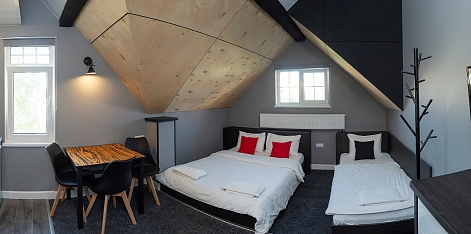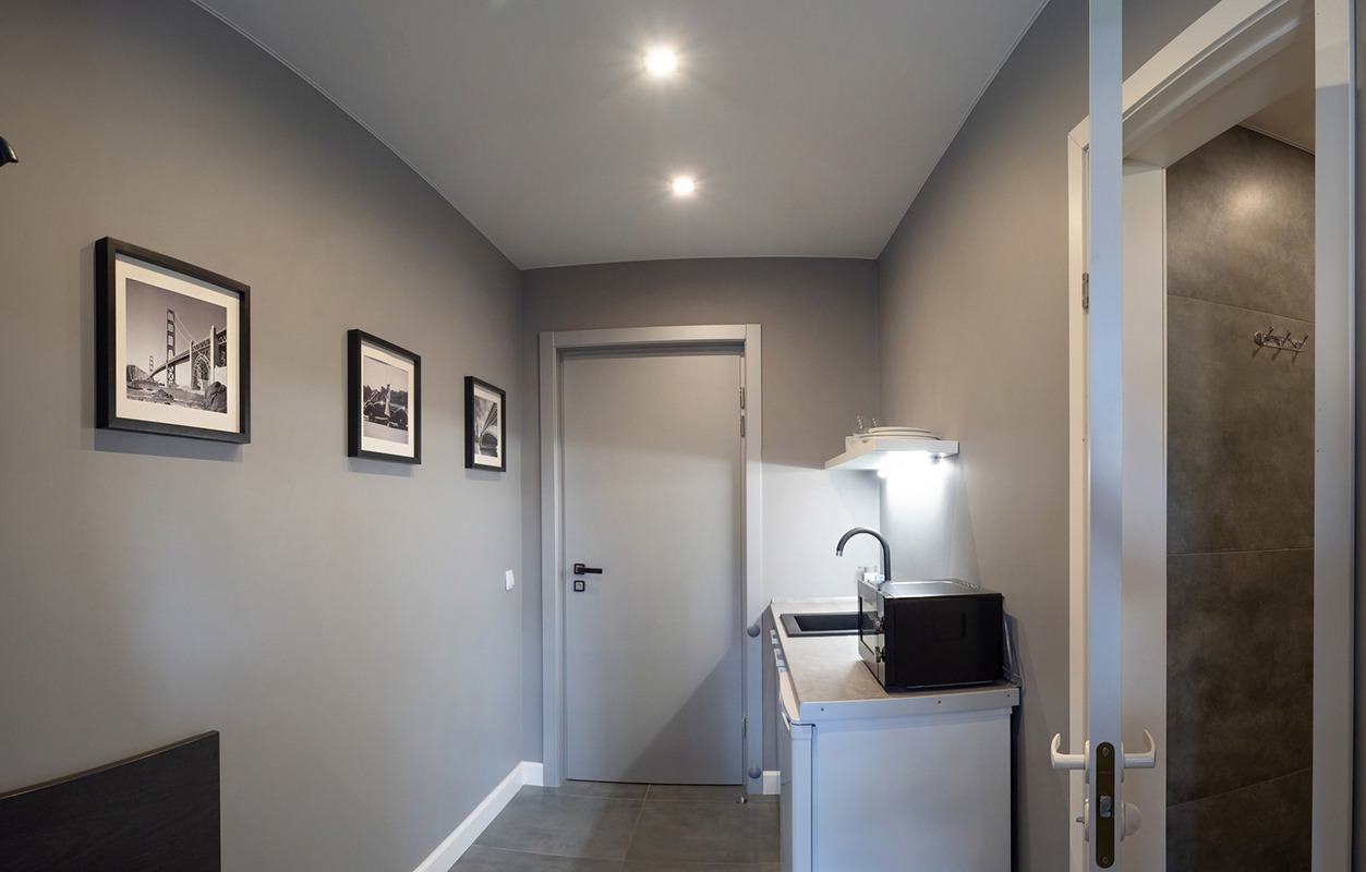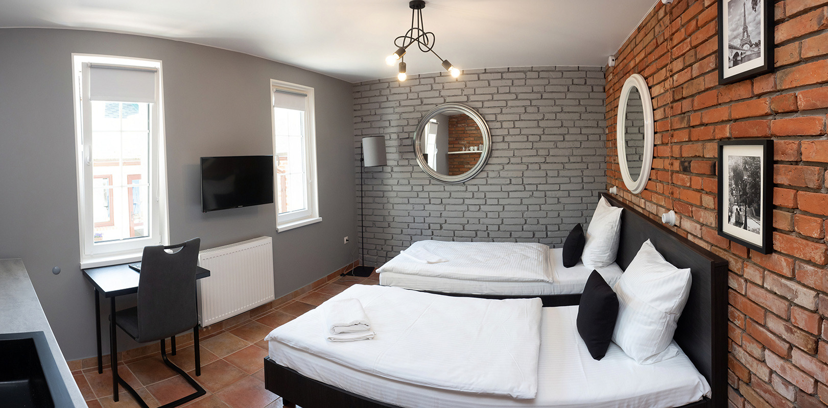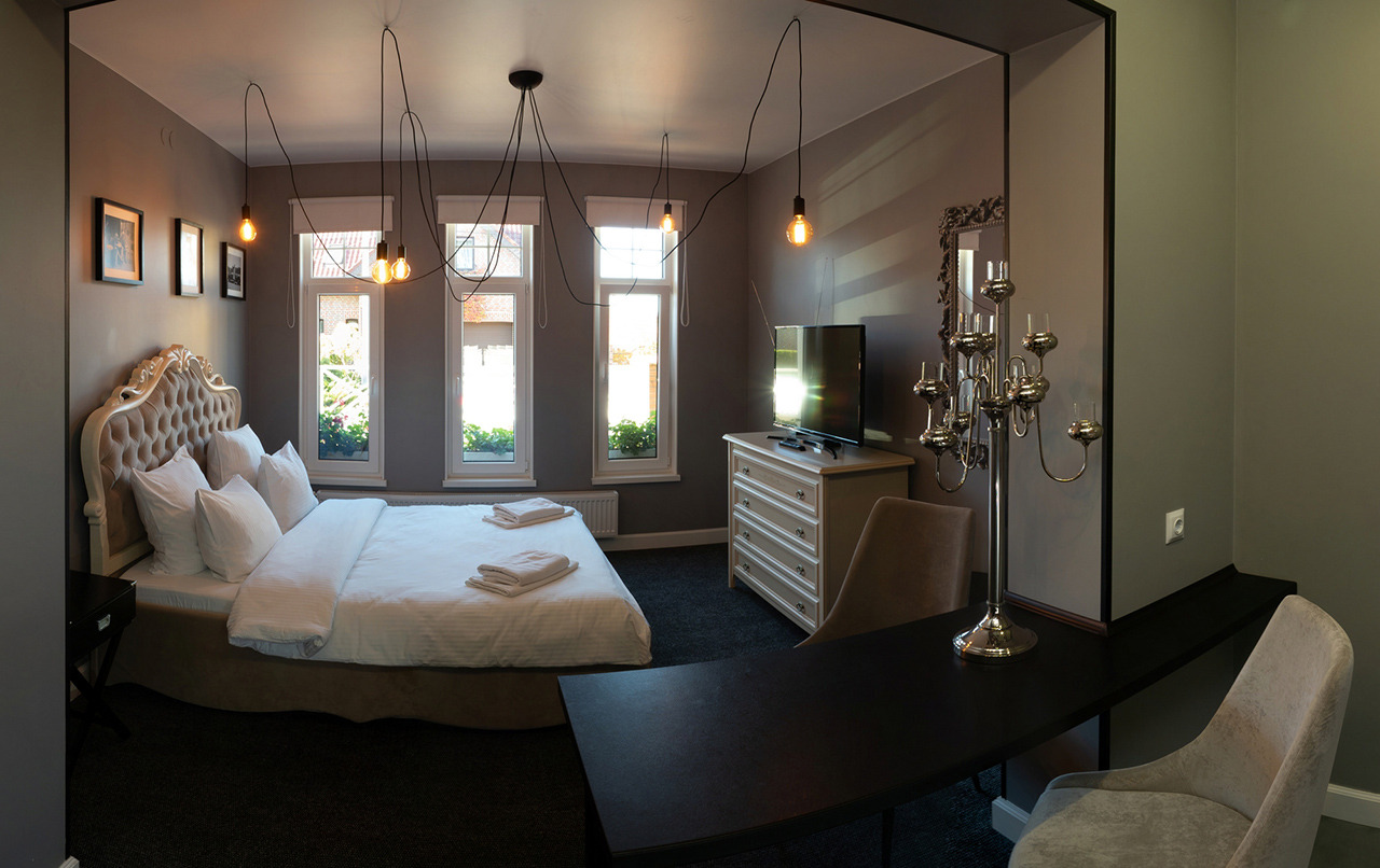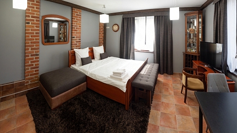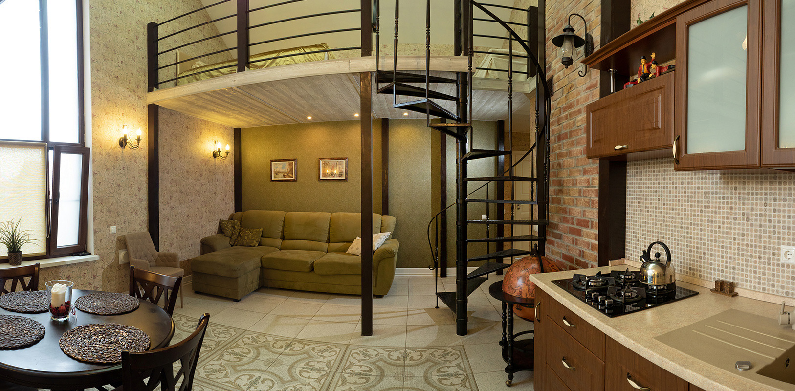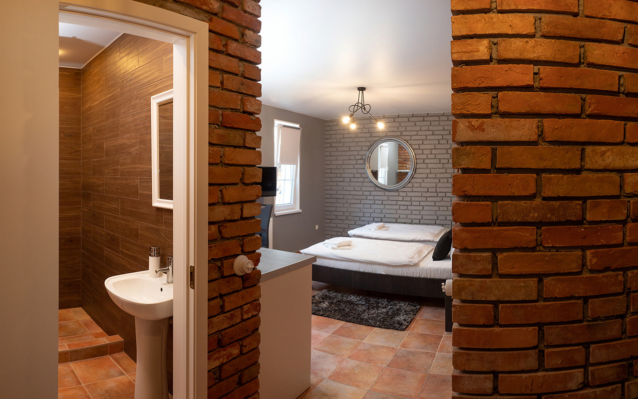 Во всех номерах стильный современный интерьер, выдержанный в интересной цветовой гамме с использованием как традиционных пастельных тонов, так и современных стальных и глубоких синих оттенков, в некоторых комнатах прослеживаются элементы популярного стиля лофт. Все номера оснащены кухней, оборудованной посудой и техникой, в ванных комнатах установлена душевая кабина, а для гостей подготовлены косметические наборы.Для отдыхающих во внутреннем дворике организована зона барбекю с мангалами, также в распоряжении гостей банный комплекс с парилкой, сауной и бассейном, где можно отдохнуть или расслабиться после активного дня.