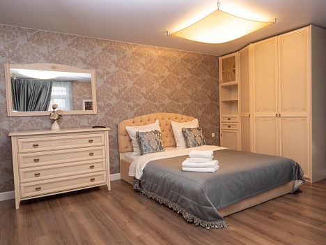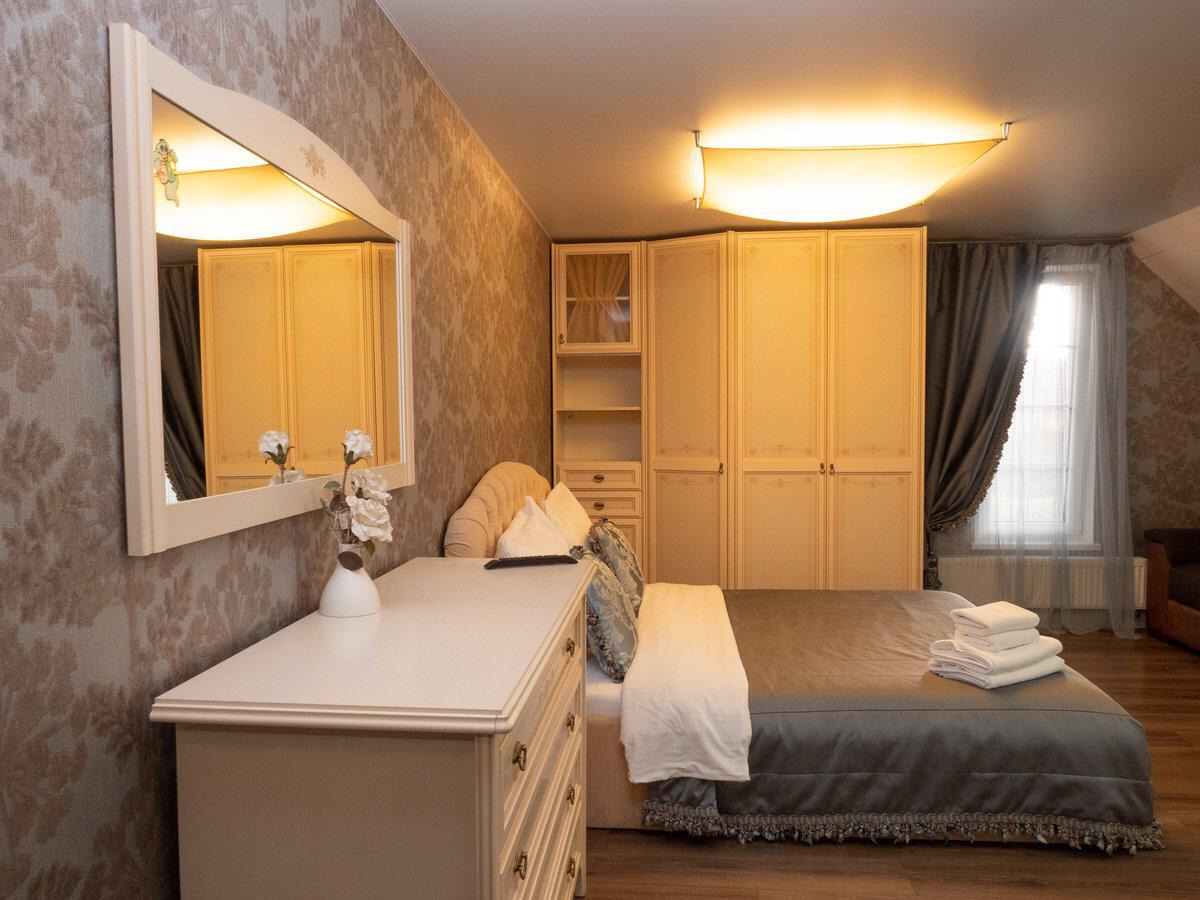 В номере: диван раскладной, зеркало, кровать двуспальная, стол, стулья, тумба, шкаф, шкаф для посуды, микроволновая печь, набор посуды, плита электрическая, посудомоечная машина, телевизор ЖК, холодильник, чайный набор посуды, электрочайник