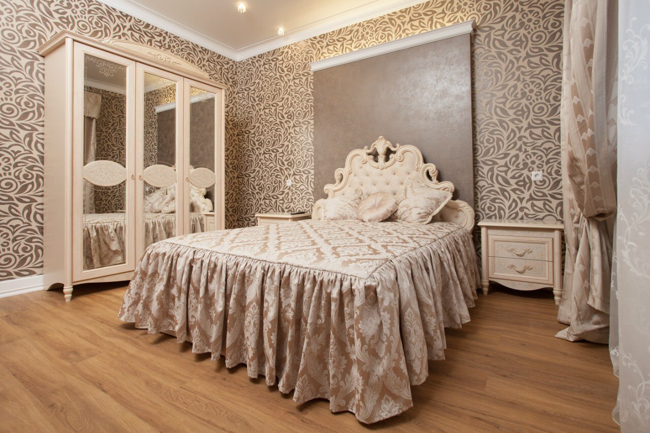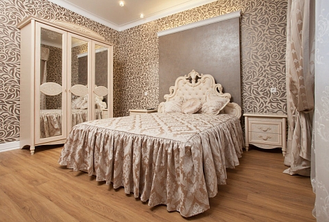 В номере: диван, зеркало, комод, кровать двуспальная, столик кофейный, стулья, шкаф, шкаф для посуды, микроволновая печь, набор посуды, плита электрическая, телевизор ЖК, холодильник, электрочайник