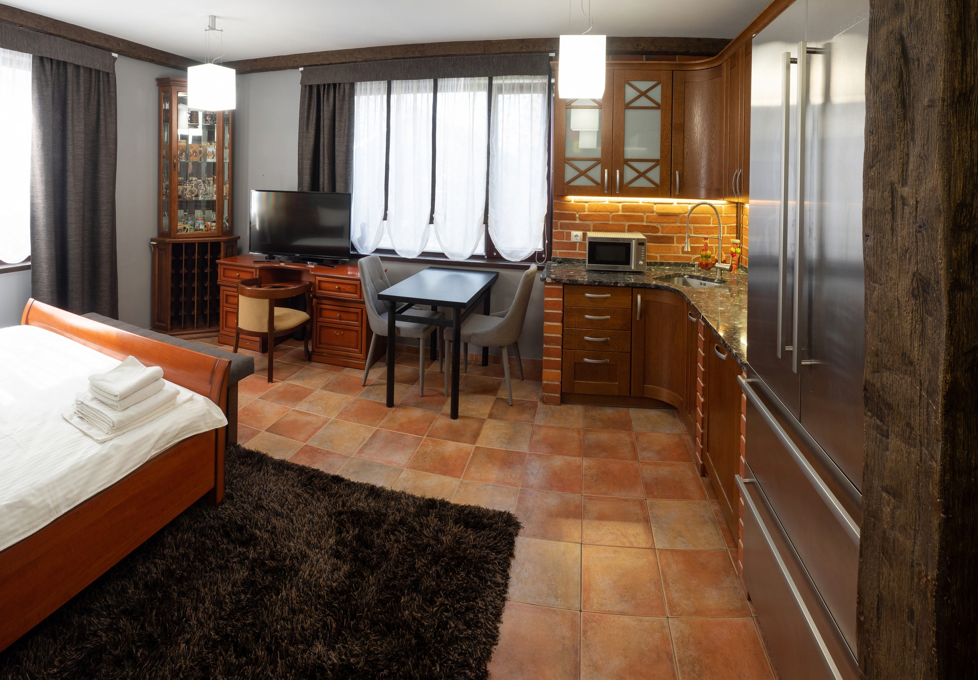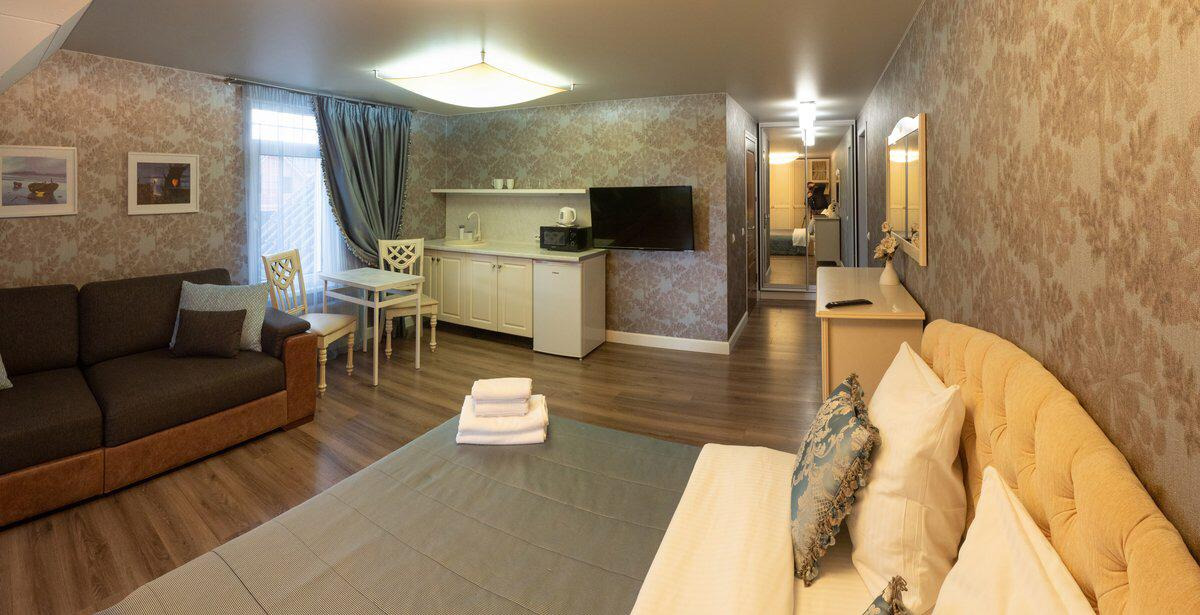 В номере: зеркало, кровать двуспальная, столик кофейный, стулья, тахта, тумба под телевизор, шкаф для посуды, микроволновая печь, набор посуды, плита электрическая, телевизор ЖК, холодильник, электрочайник