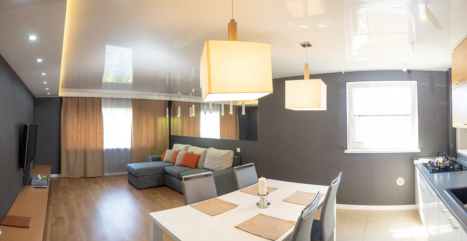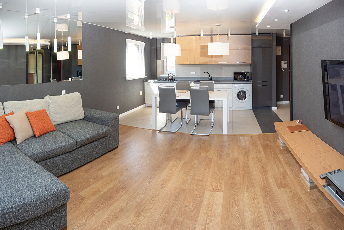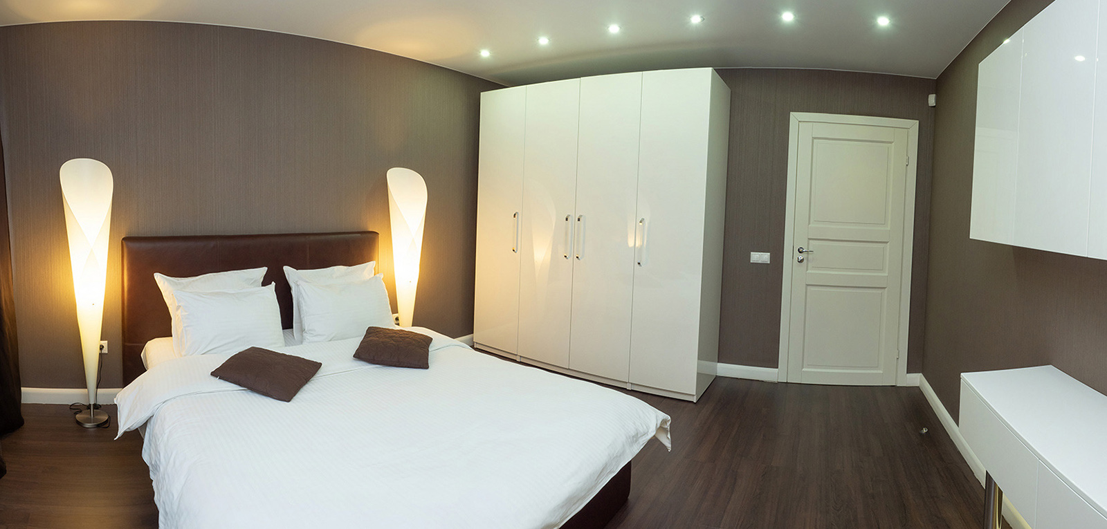 В номере: диван раскладной, зеркало, кровать двуспальная, стол, стулья, шкаф, шкаф для посуды, микроволновая печь, набор посуды, плита электрическая, посудомоечная машина, телевизор ЖК, холодильник, чайный набор посуды