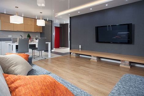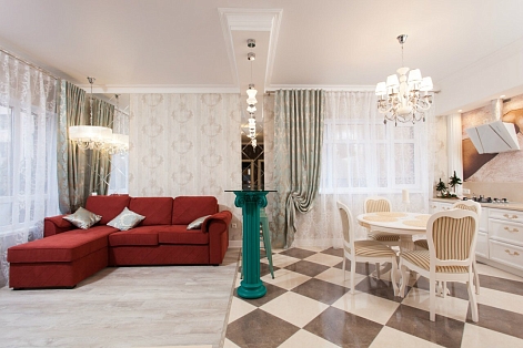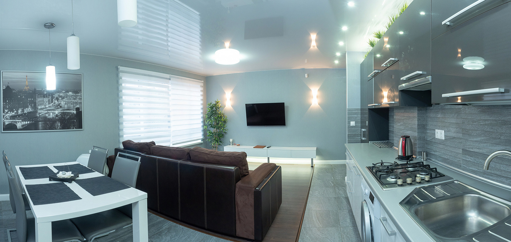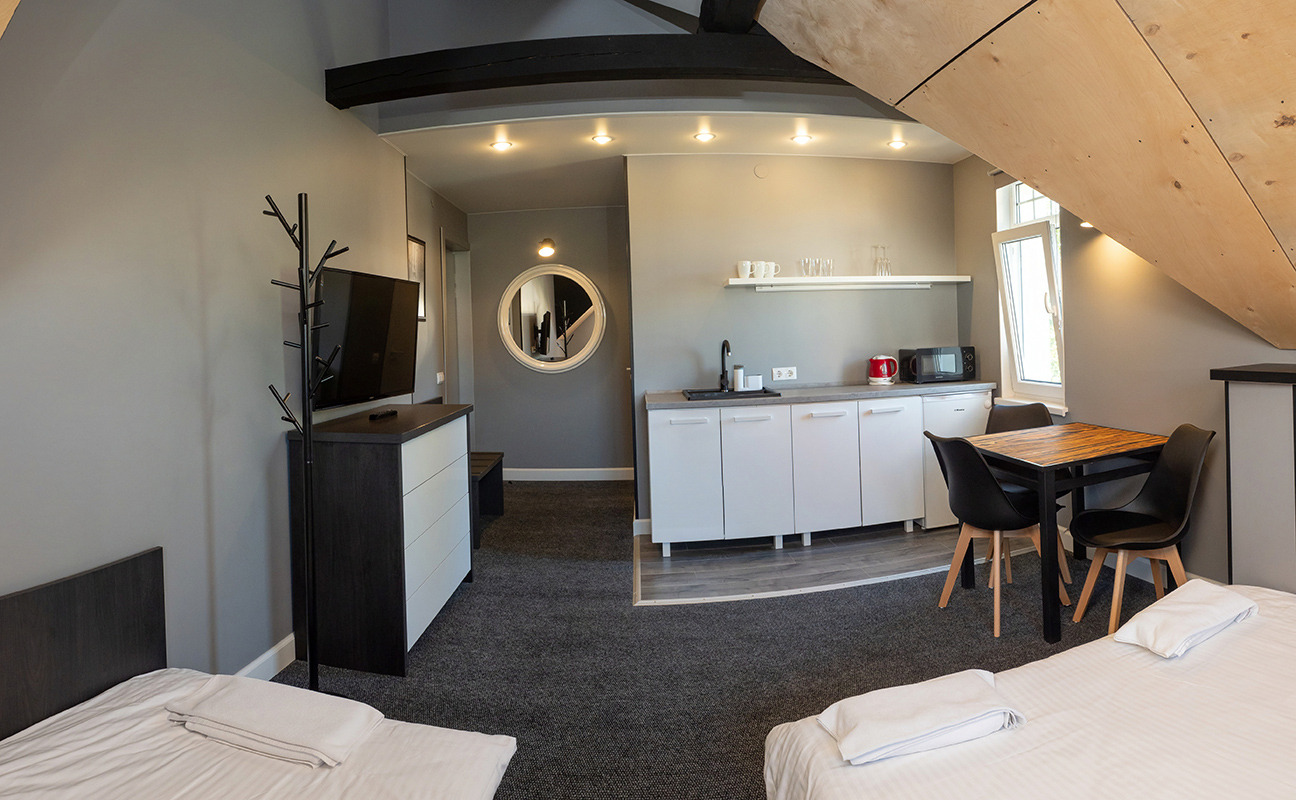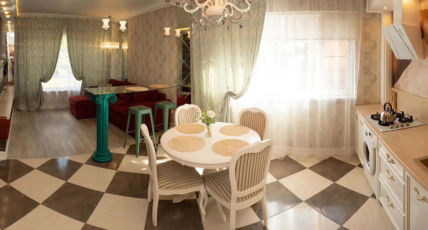 В номере: диван раскладной, зеркало, кровать двуспальная, стол, стулья, шкаф, шкаф для посуды, микроволновая печь, набор посуды, плита электрическая, посудомоечная машина, телевизор ЖК, холодильник, чайный набор посуды