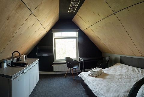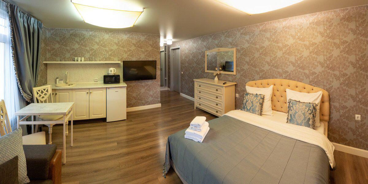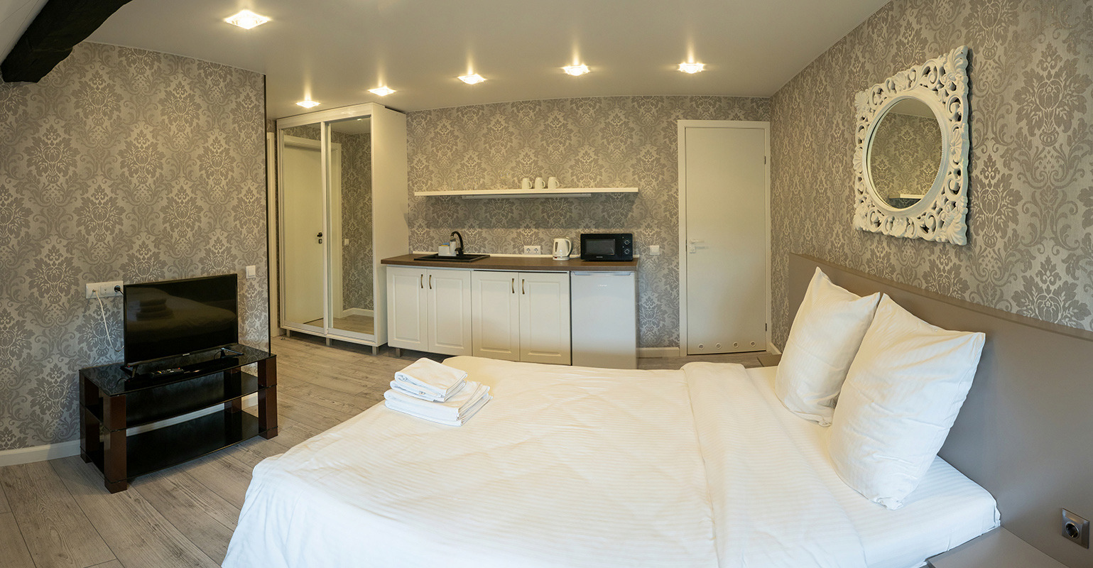 В номере: зеркало, кровать двуспальная, стол, стулья, тумба под телевизор, шкаф, шкаф для посуды, микроволновая печь, набор посуды, плита электрическая, телевизор ЖК, холодильник, электрочайник
