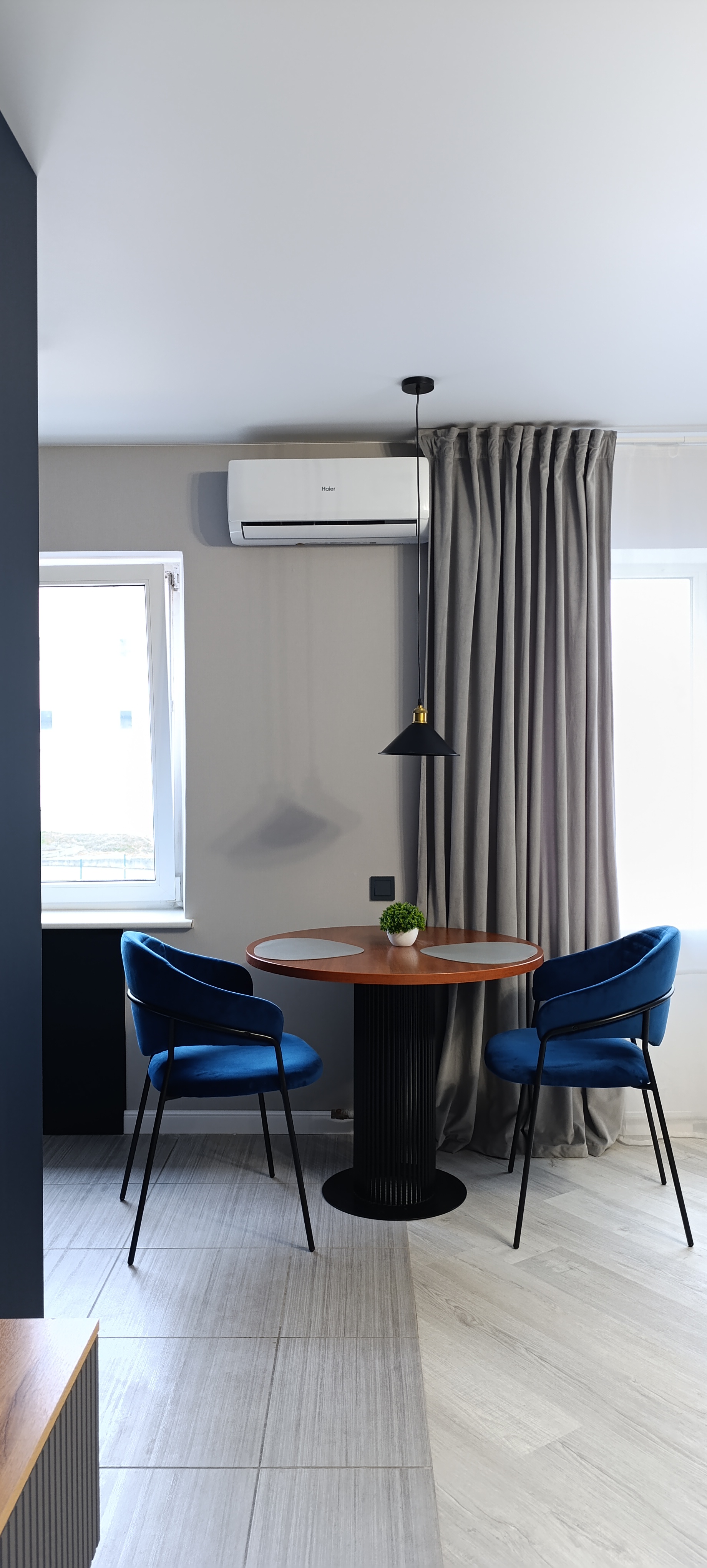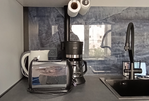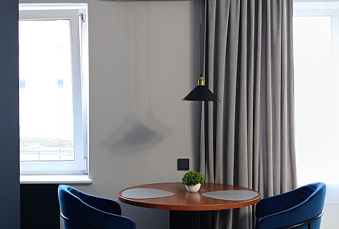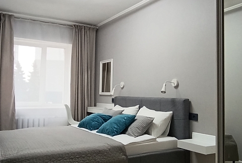В номере: диван, зеркало, кровать двуспальная, стол, стулья, шкаф, гладильная доска, кондиционер, микроволновая печь, набор посуды, плита электрическая, стиральная машина, сушилка для белья, телевизор ЖК, утюг, холодильник, чайный набор посуды, электрочайник
