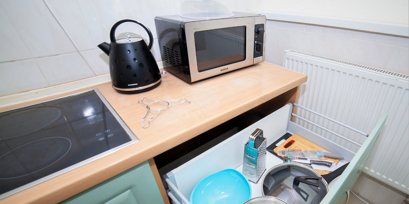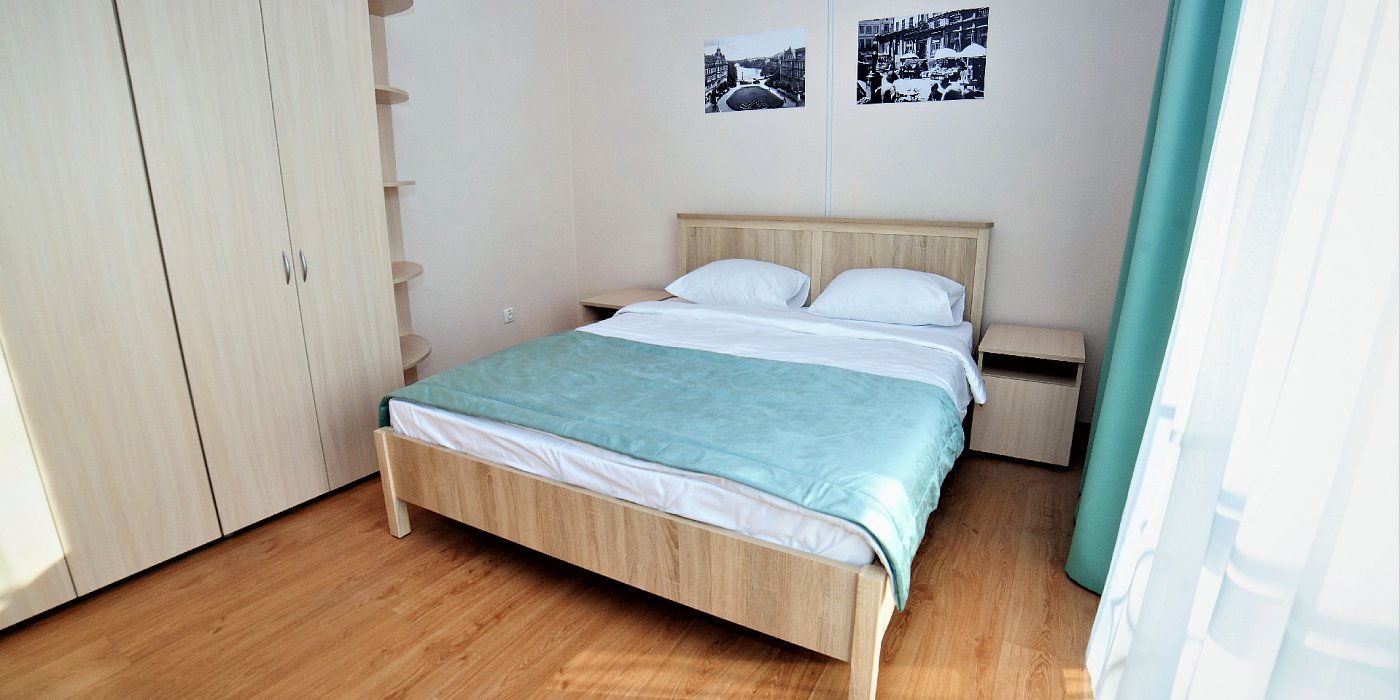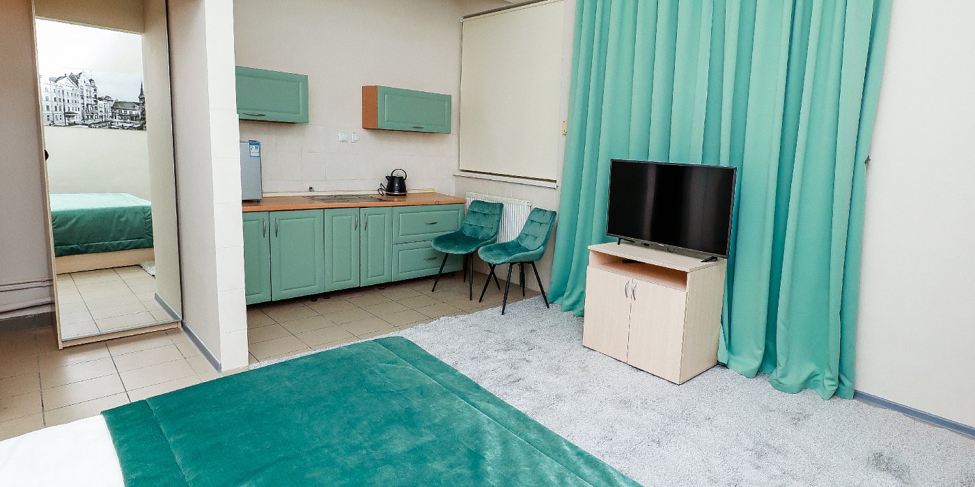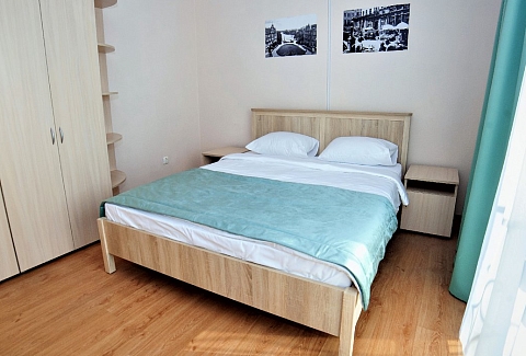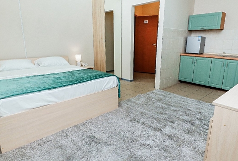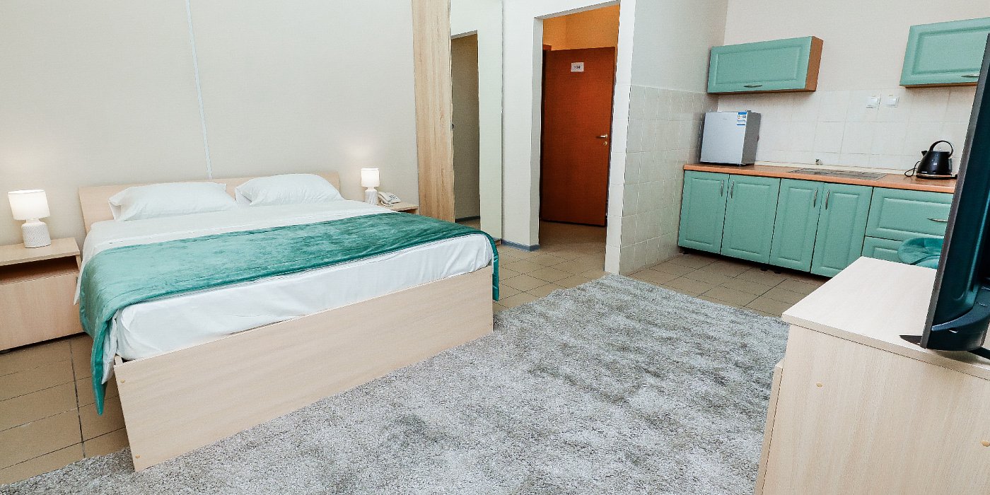В номере: кровать двуспальная, прикроватные тумбочки, стол, стулья, шкаф, набор посуды, плита электрическая, телевизор, телефон, холодильник, чайный набор посуды, электрочайник