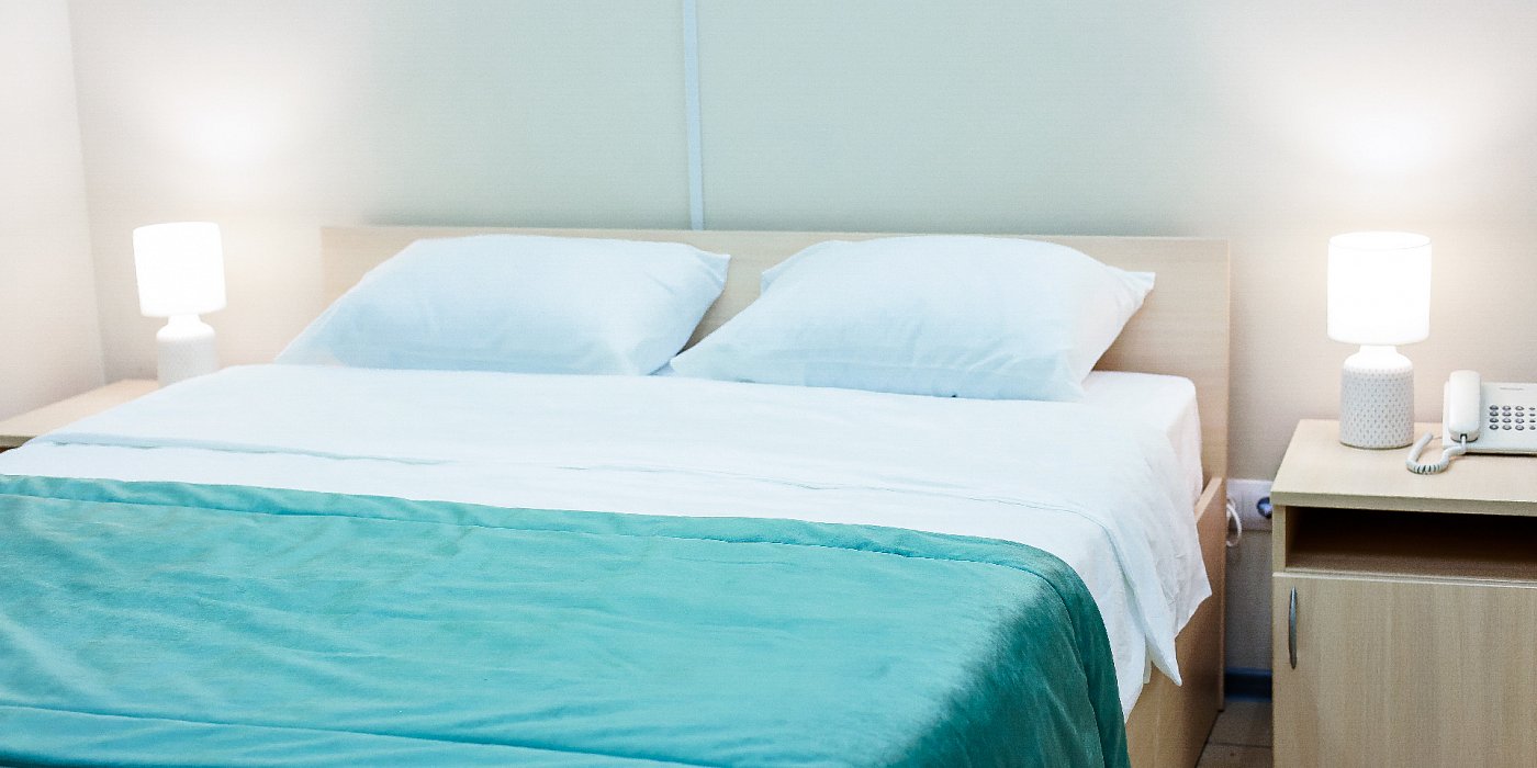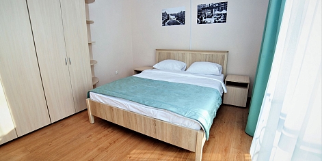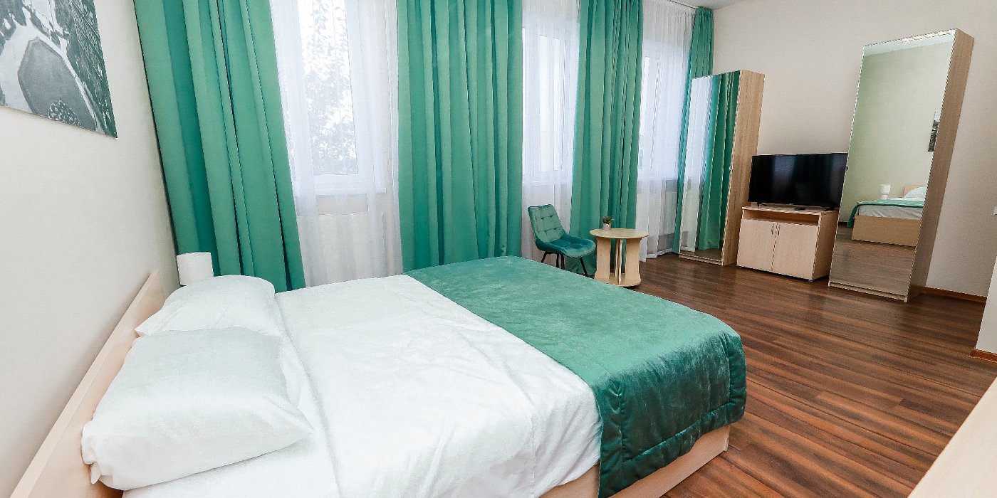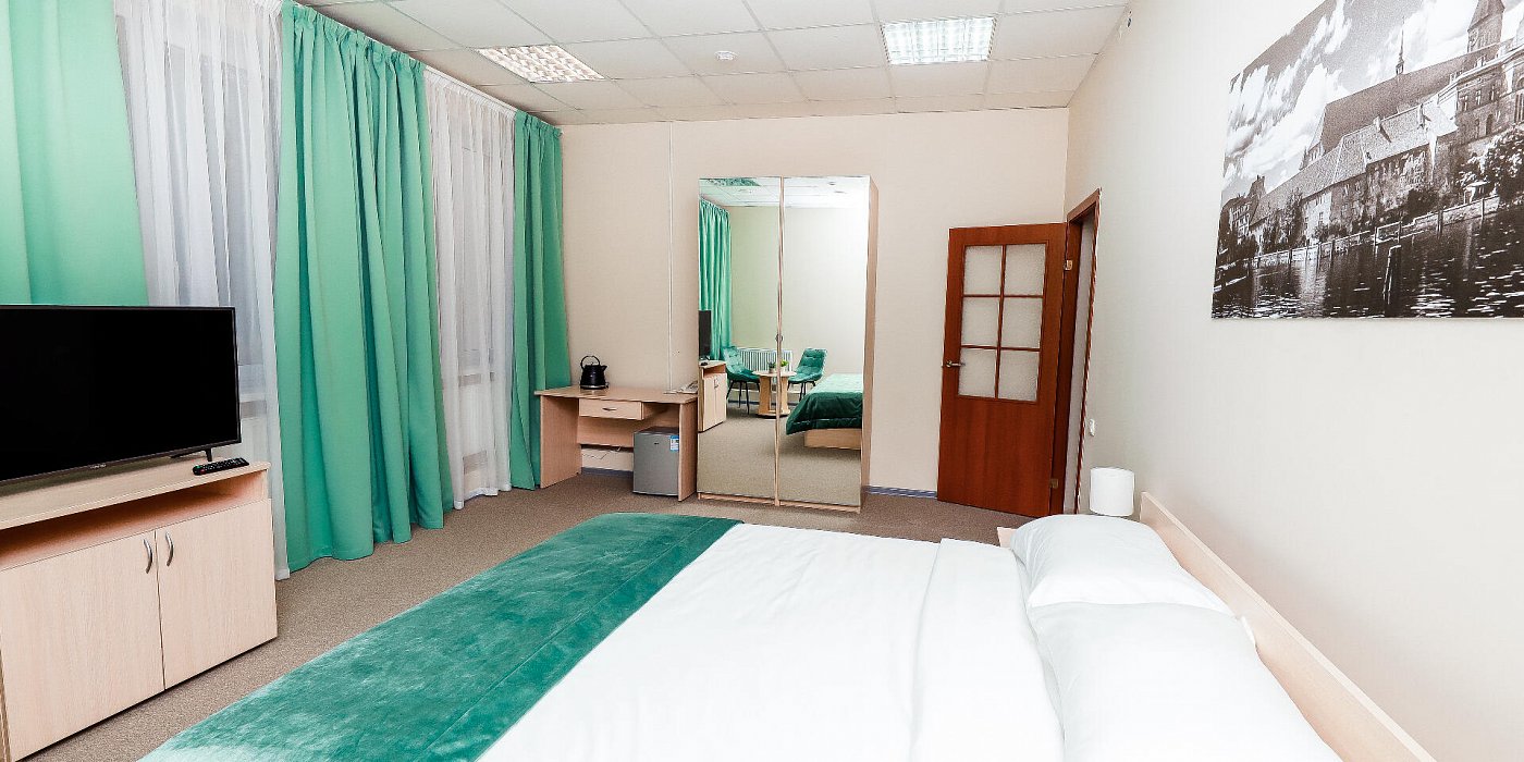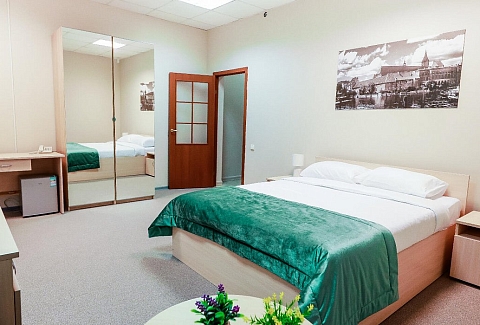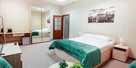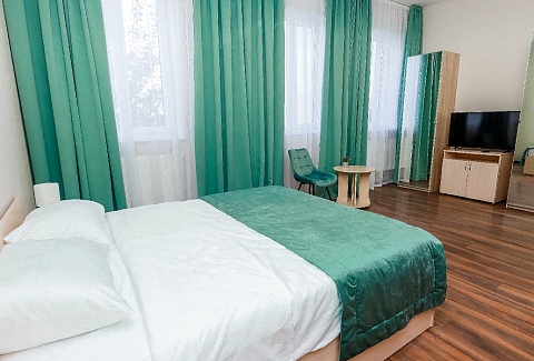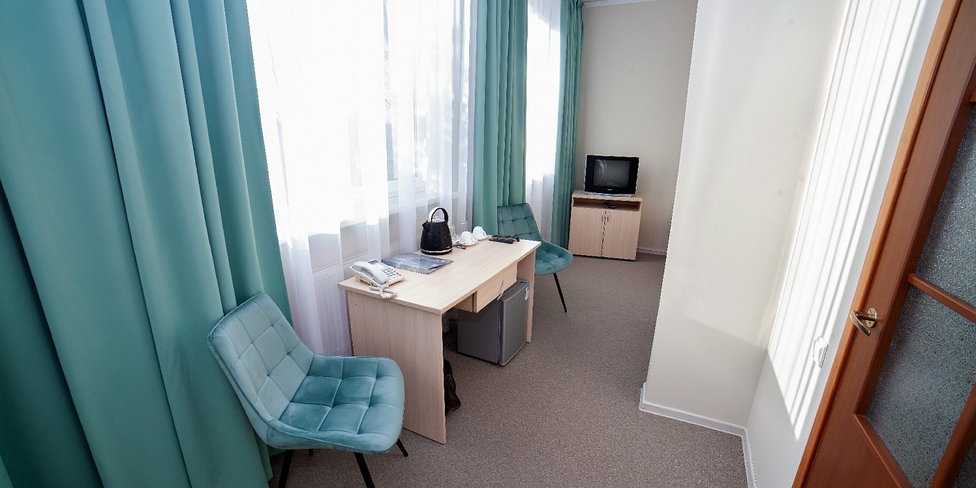 В номере: кровать двуспальная, прикроватные тумбочки, стол, стулья, шкаф, набор посуды, сейф, телевизор, телефон, холодильник, электрочайник