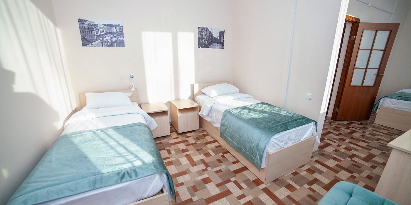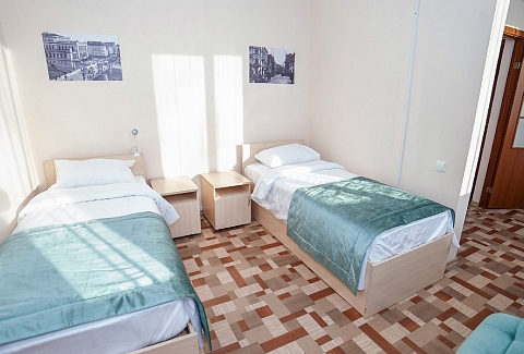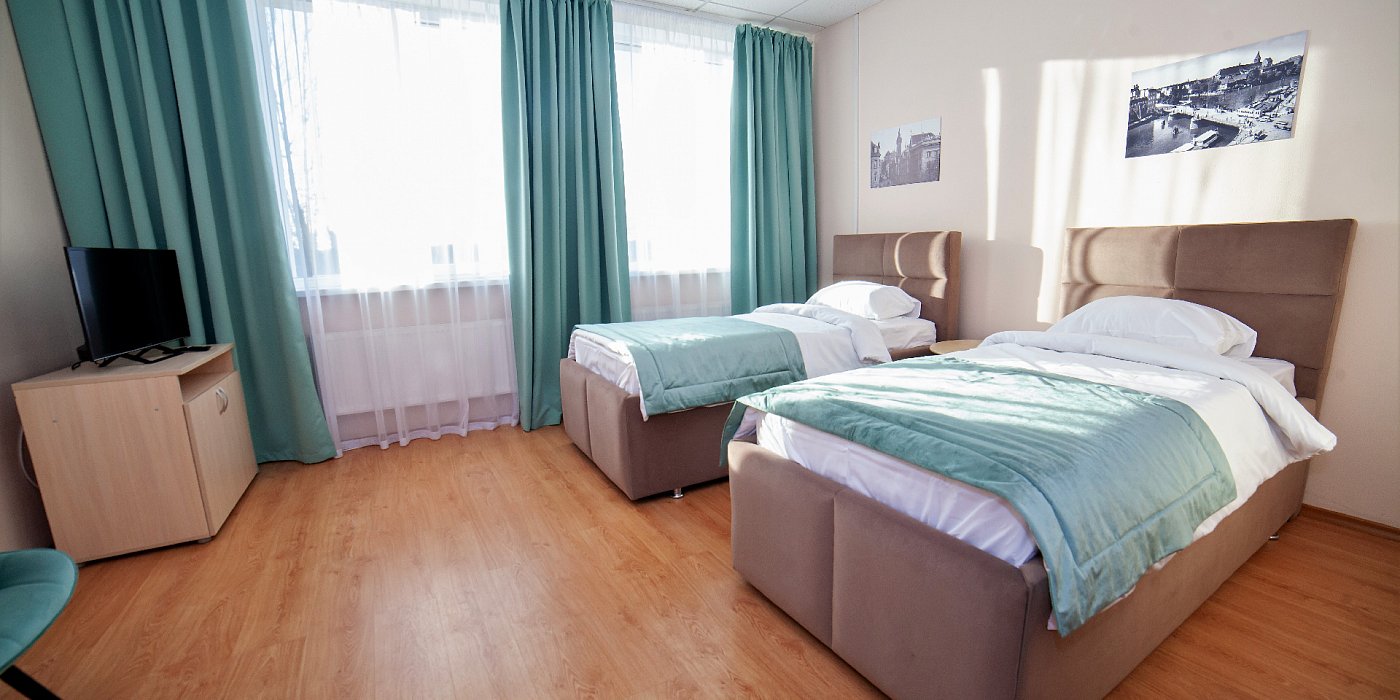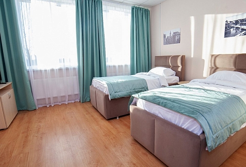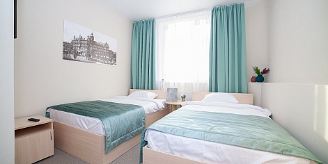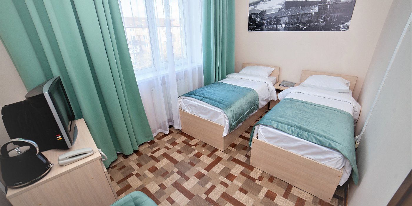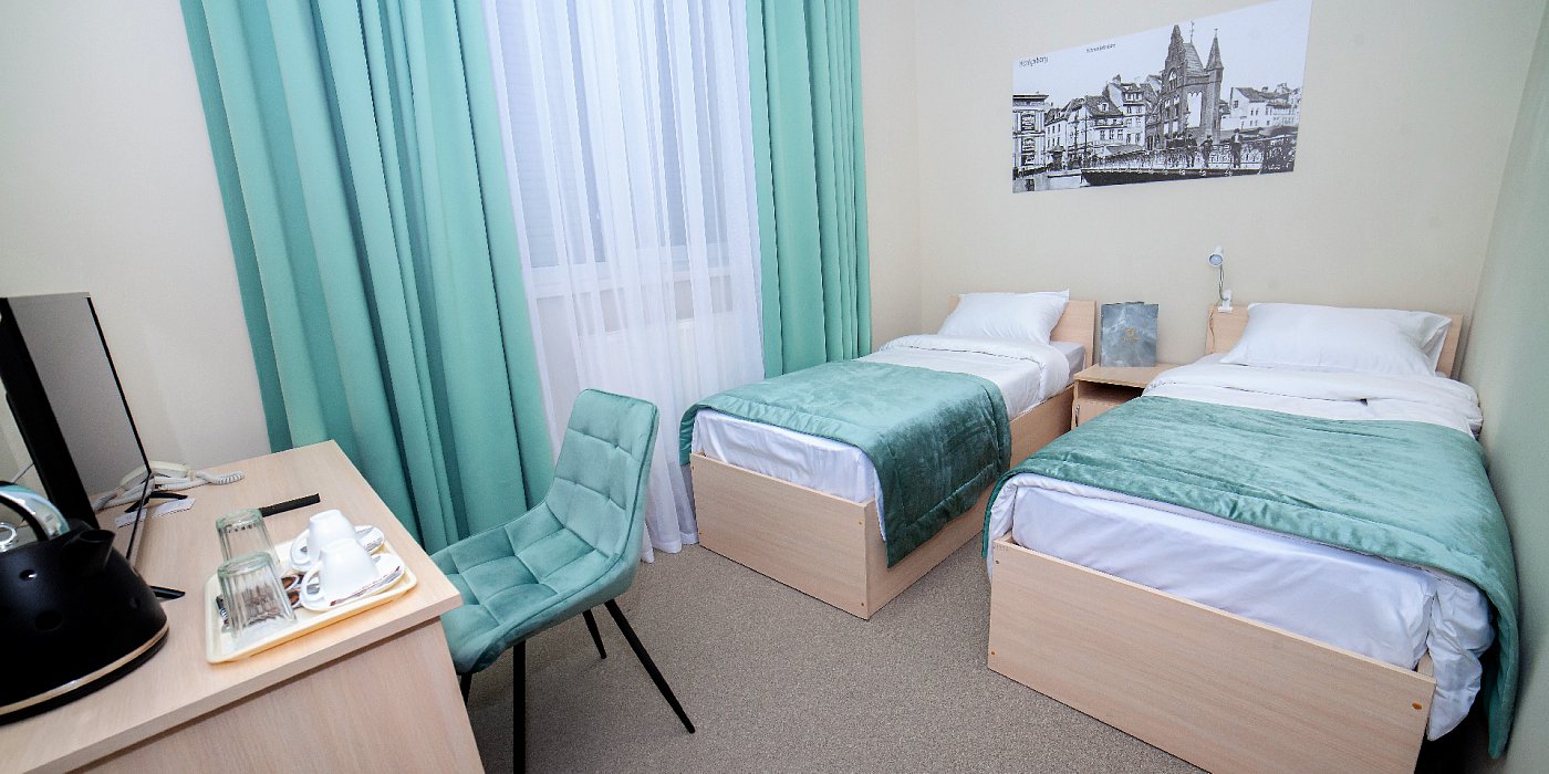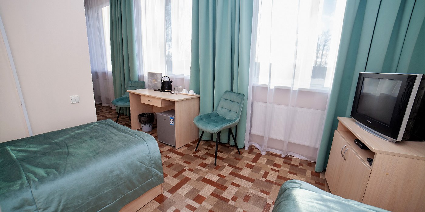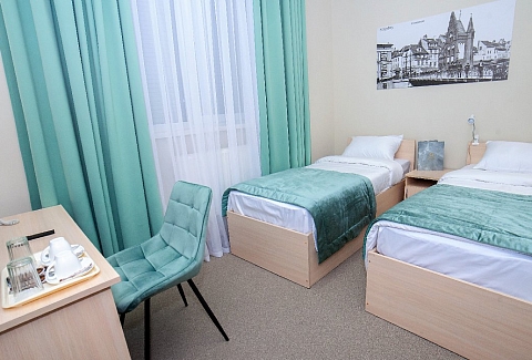 В номере: кровати односпальные, прикроватные тумбочки, стол, стул, шкаф, сейф, телевизор, телефон, холодильник, чайный набор посуды, электрочайник