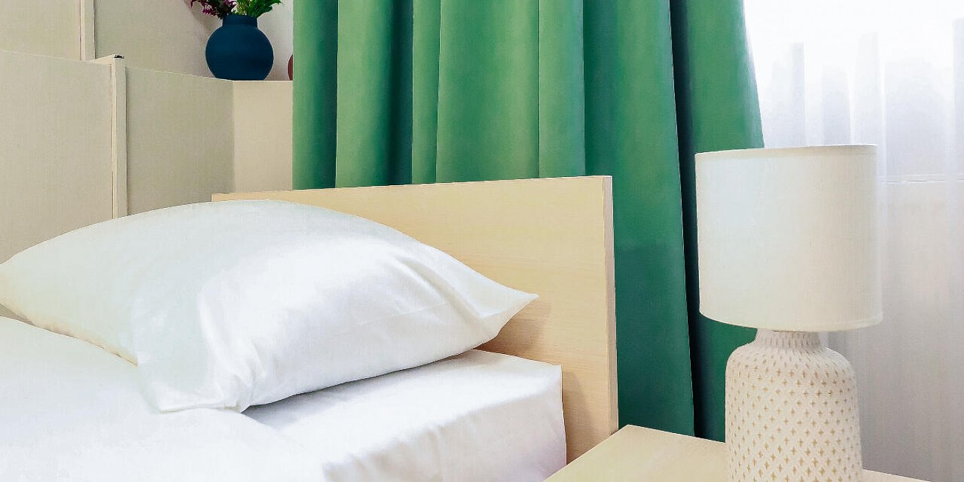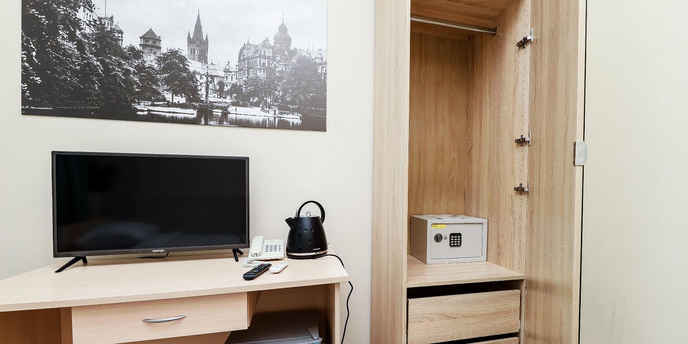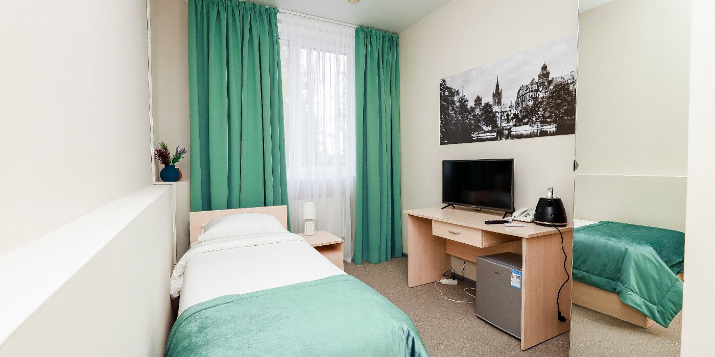 В номере: кровать односпальная, прикроватная тумбочка, стул, шкаф, сейф, телевизор, телефон, холодильник, чайный набор посуды, электрочайник