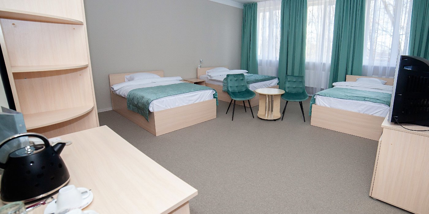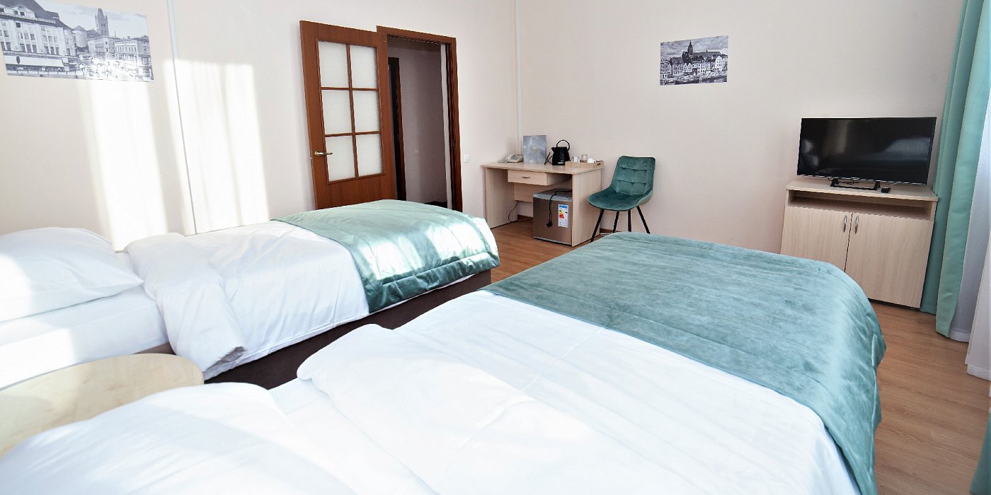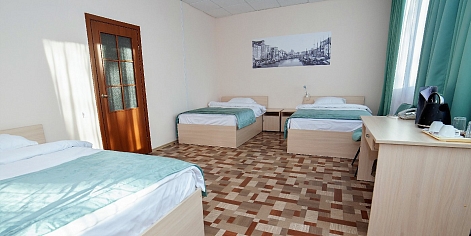 В номере: кровати односпальные, кровать двуспальная, прикроватные тумбочки, стол, стулья, шкаф, сейф, телевизор, телефон, холодильник