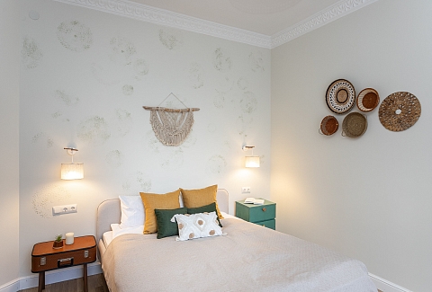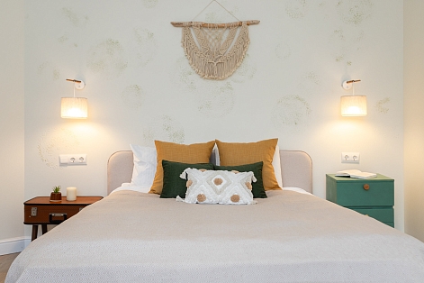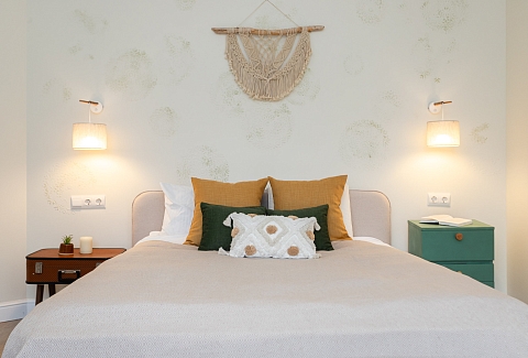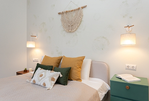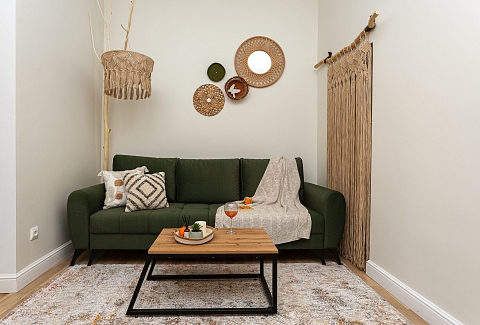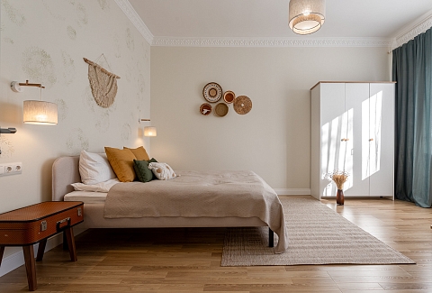 В номере: диван, зеркало, кресло, кровать двуспальная, прикроватные тумбочки, стол, стулья, шкаф, гладильная доска, духовой шкаф, кондиционер, микроволновая печь, набор посуды, плита электрическая, стиральная машина, сушилка для белья, телевизор ЖК, утюг, холодильник, чайный набор посуды, электрочайник