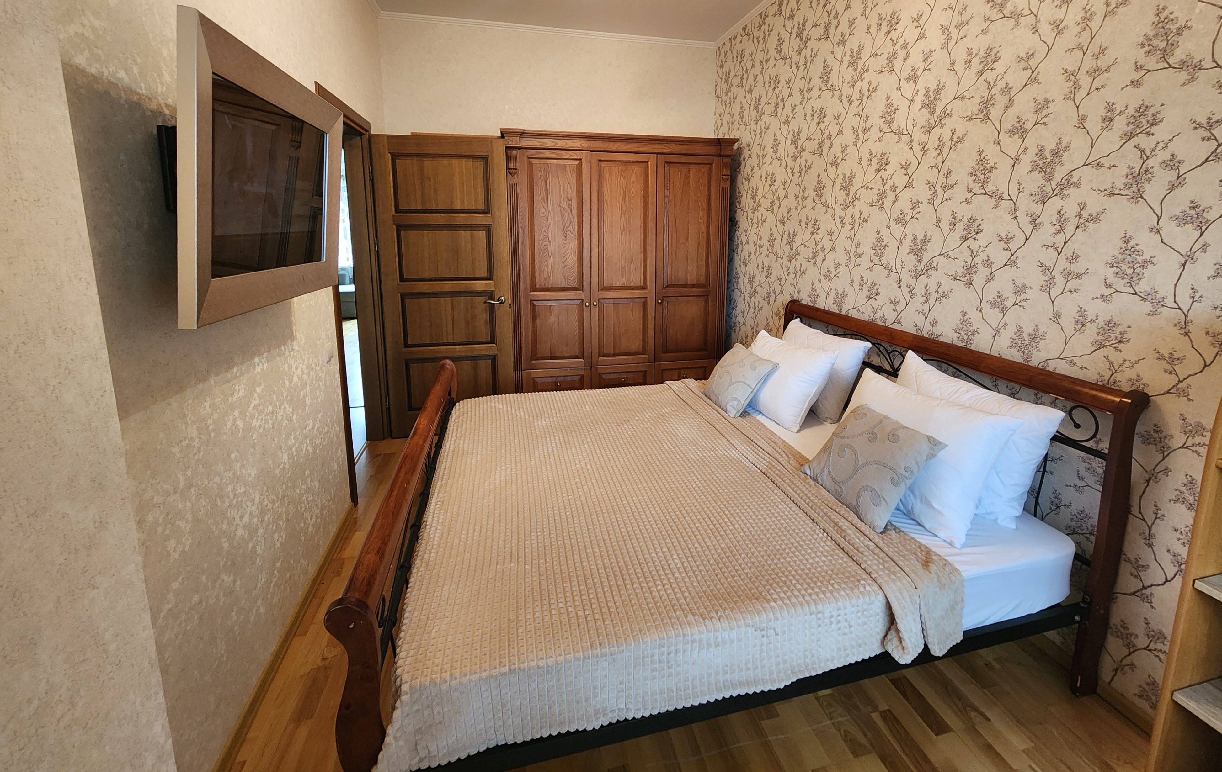 В номере: вешалка, диван раскладной, зеркало, кровать двуспальная, прикроватные тумбочки, стол, стулья, шкаф, гладильная доска, духовой шкаф, камин, кондиционер, микроволновая печь, набор посуды, плита электрическая, посудомоечная машина, стиральная машина, сушилка для белья, телевизор ЖК, утюг, холодильник, чайный набор посуды, электрочайник