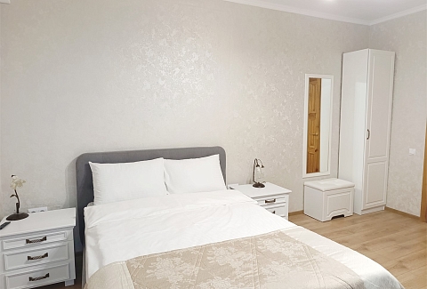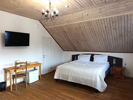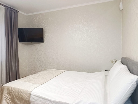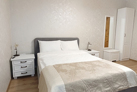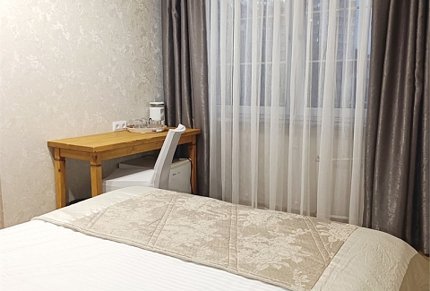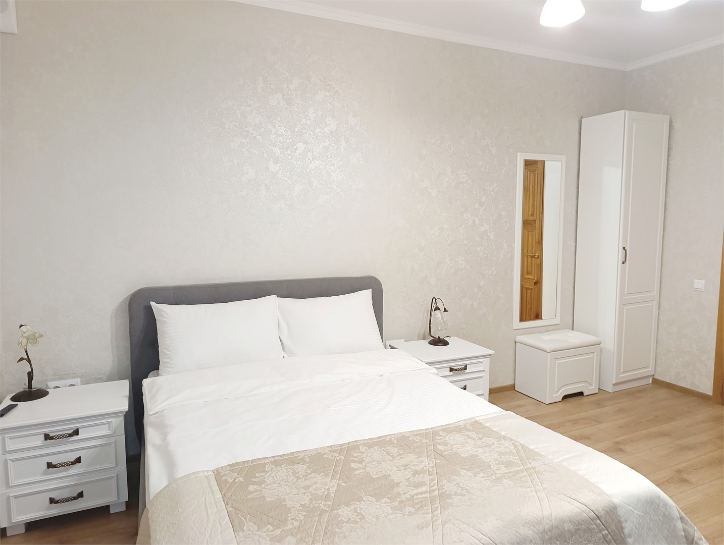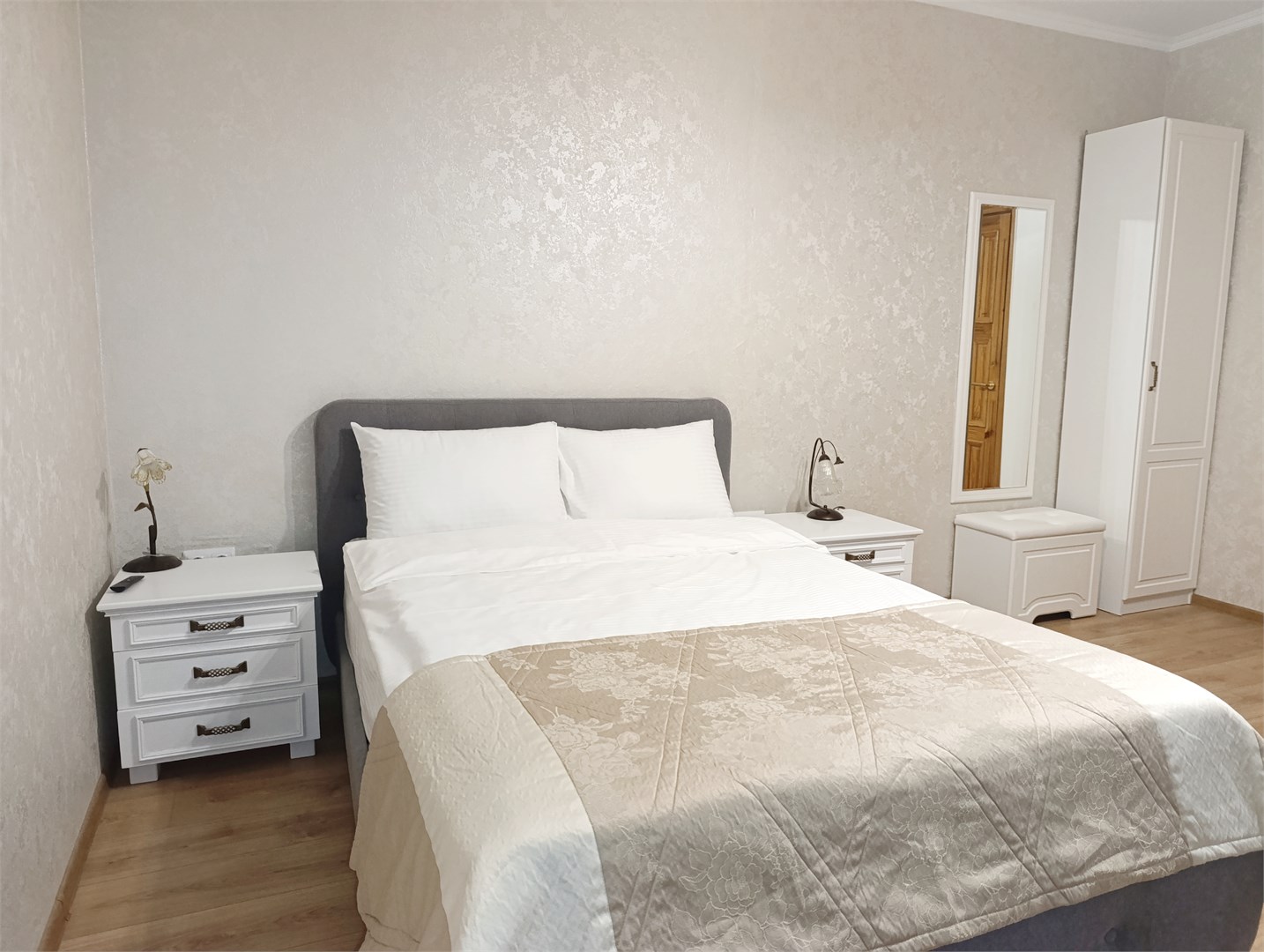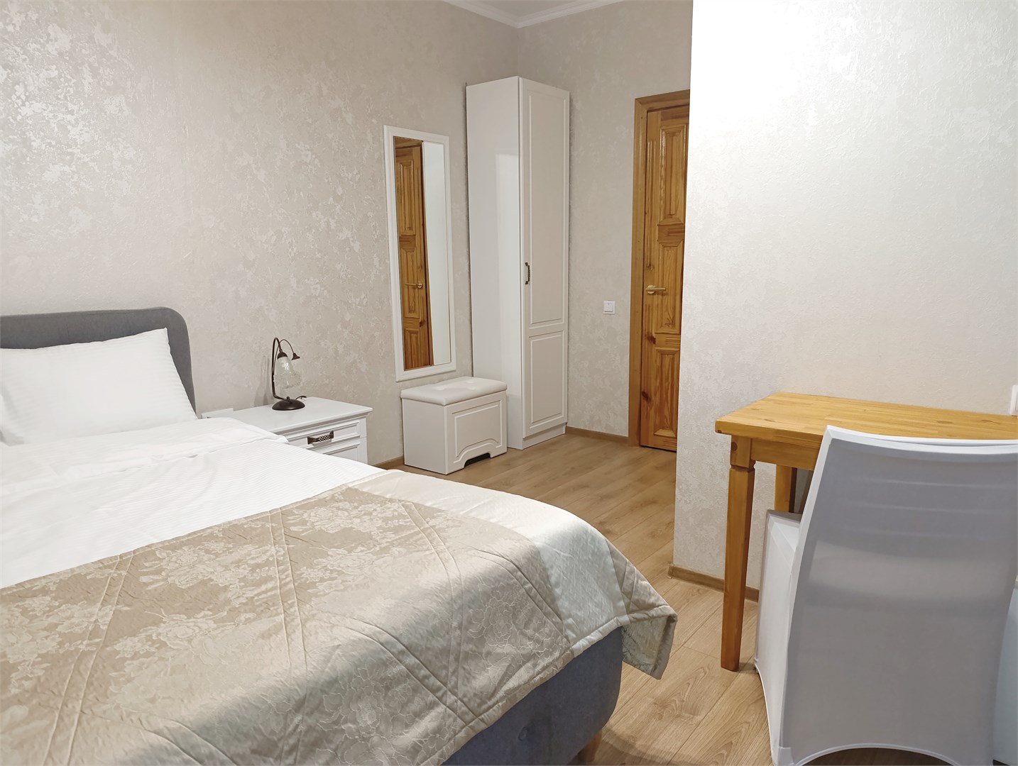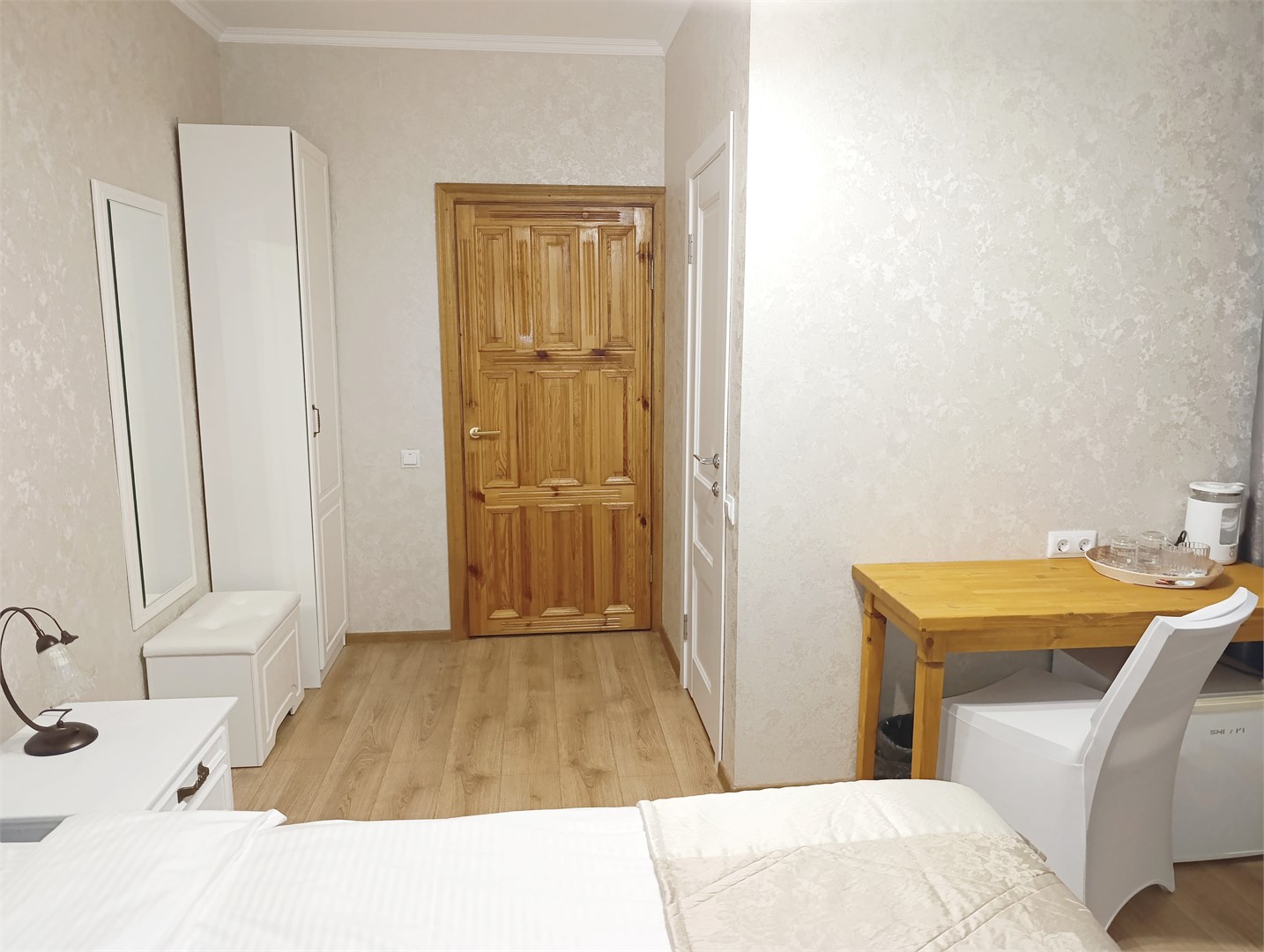 В номере: диван, зеркало, кровать двуспальная, стол, стулья, шкаф, кондиционер, мини-холодильник, телевизор ЖК, чайный набор посуды, электрочайник