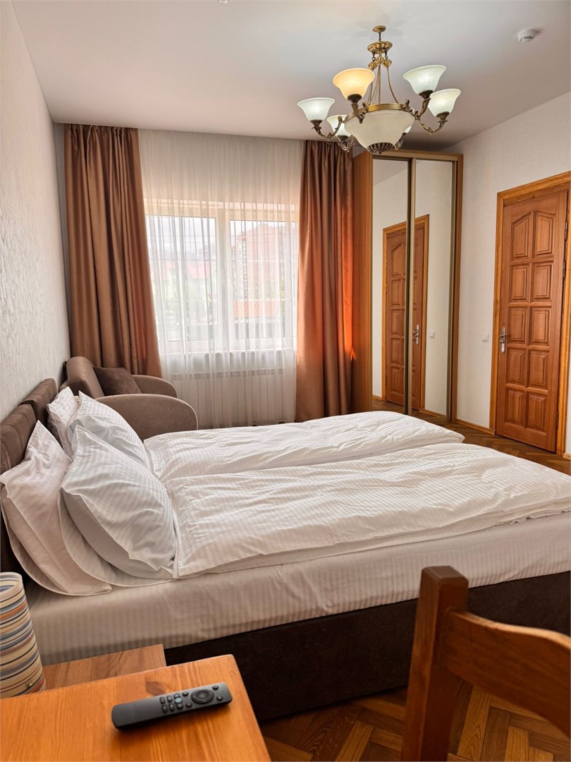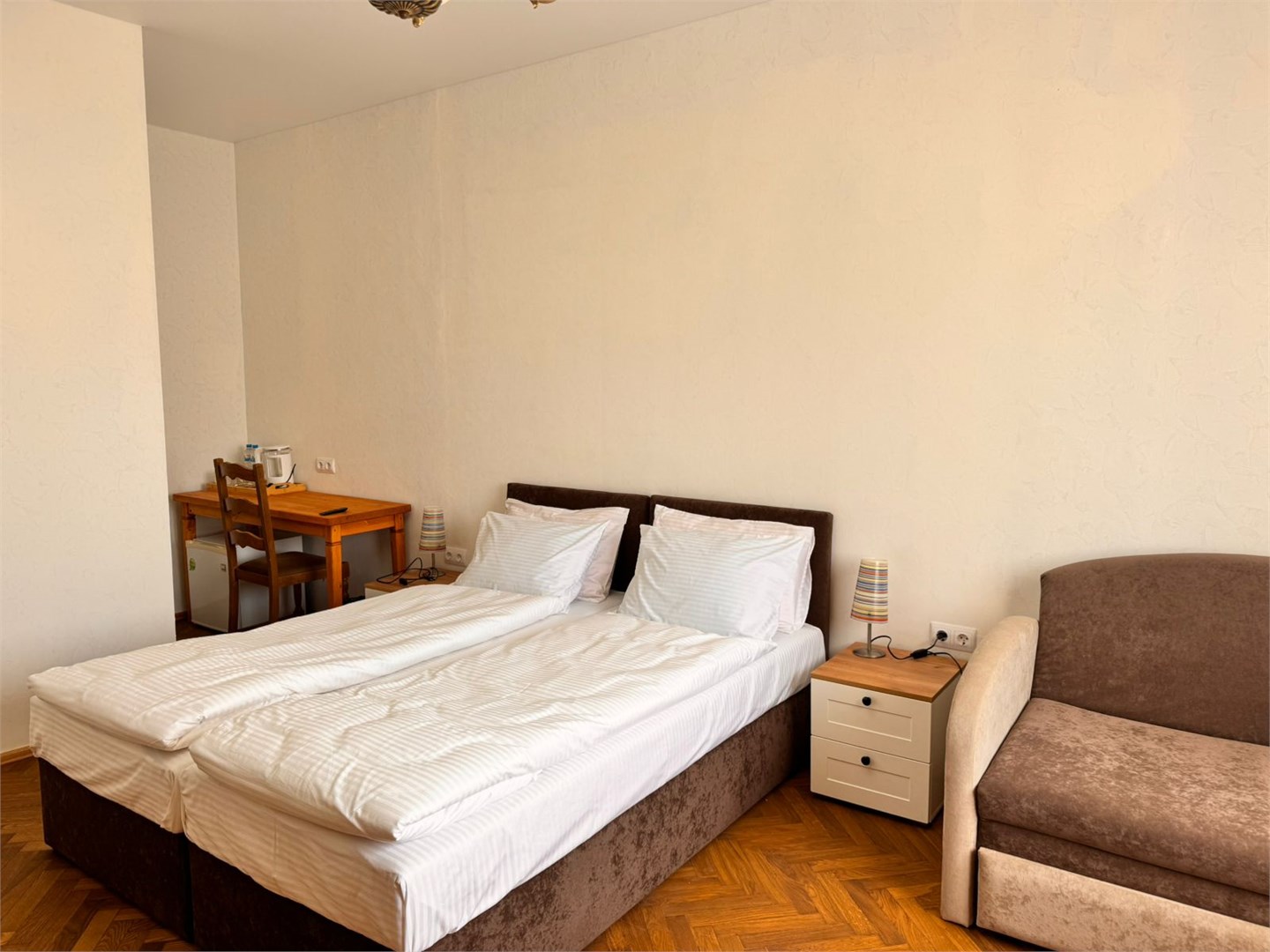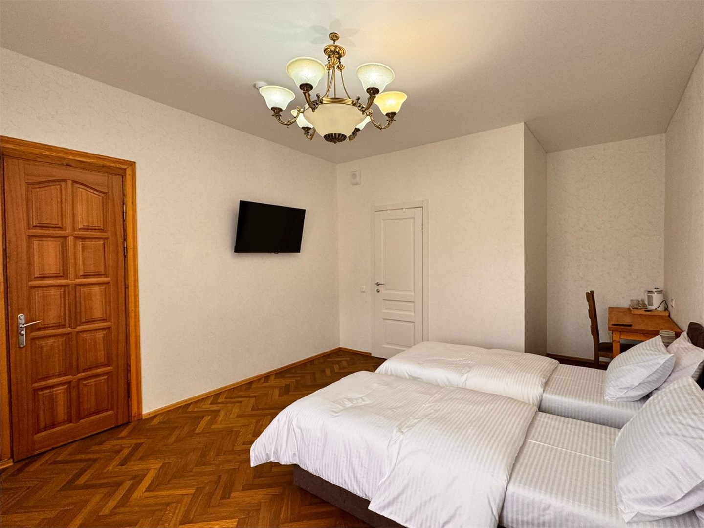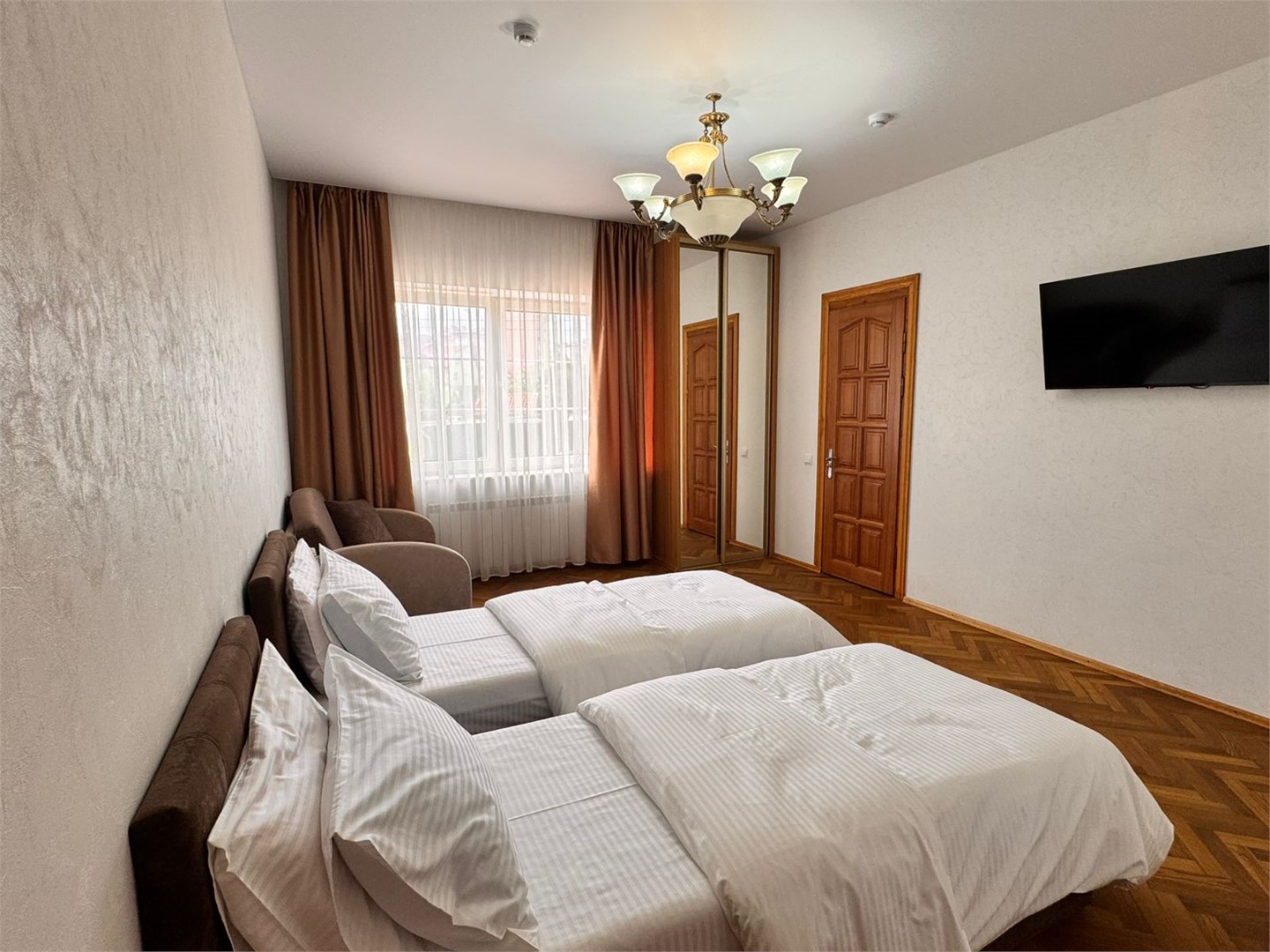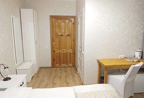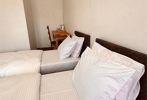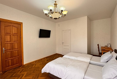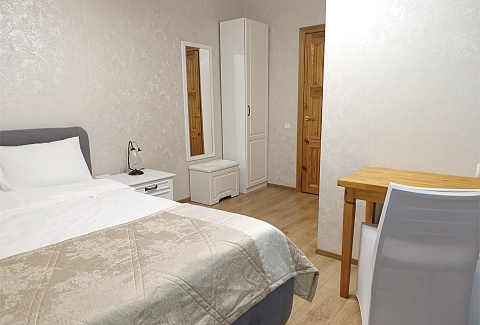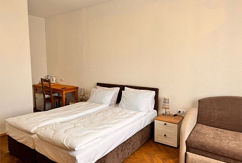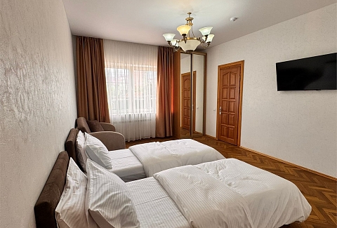 В номере: диван, зеркало, кровати односпальные /одна двуспальная кровать, стол, стул, шкаф, кондиционер, телефон, чайный набор посуды, электрочайник