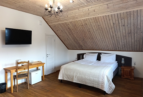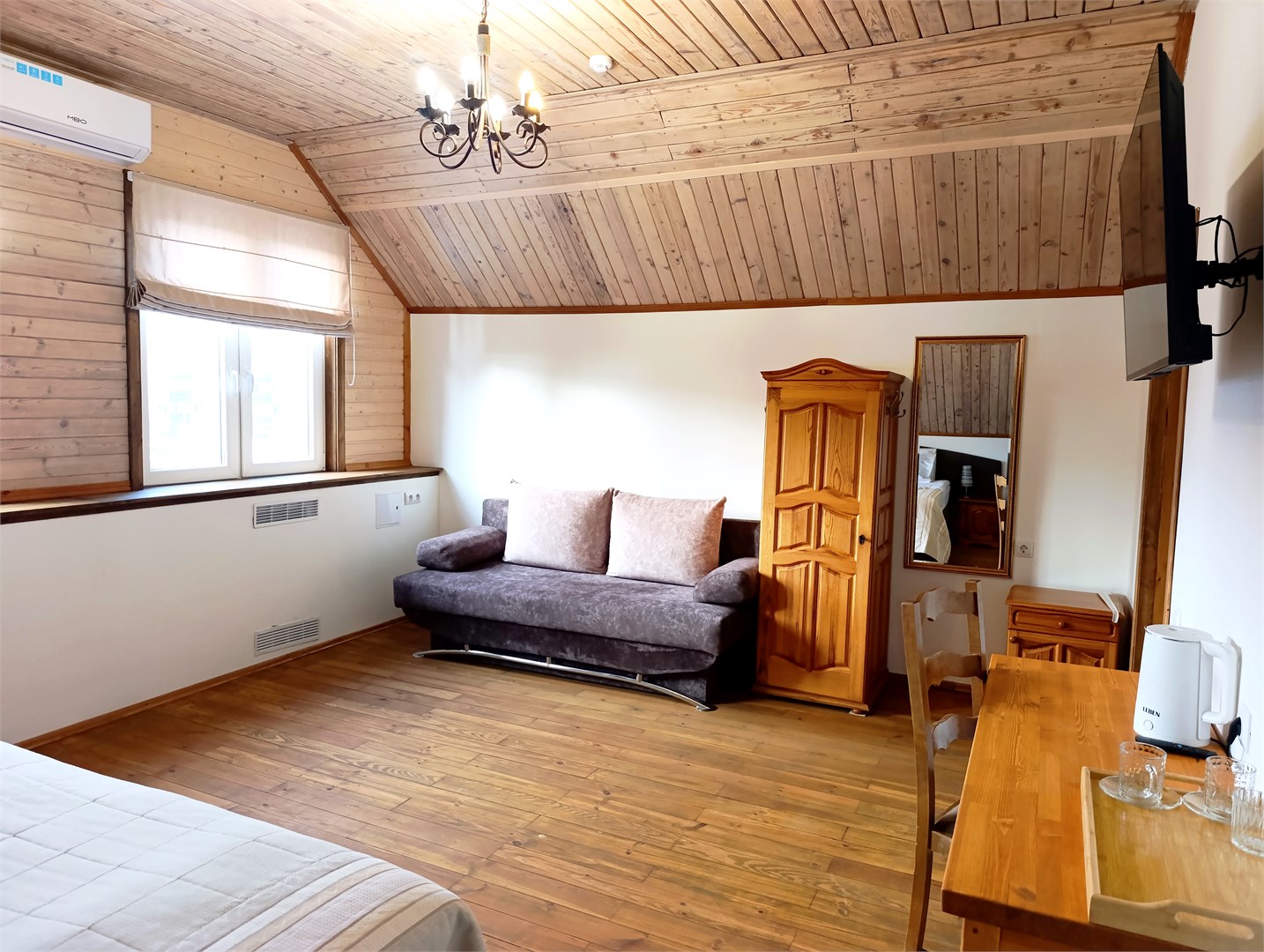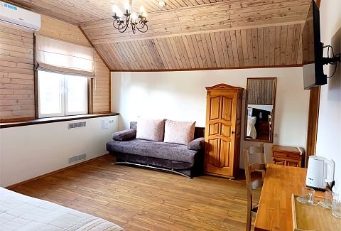 В номере: диван, кровать двуспальная, стол, стул, шкаф, кондиционер, мини-холодильник, телевизор ЖК, чайный набор посуды, электрочайник