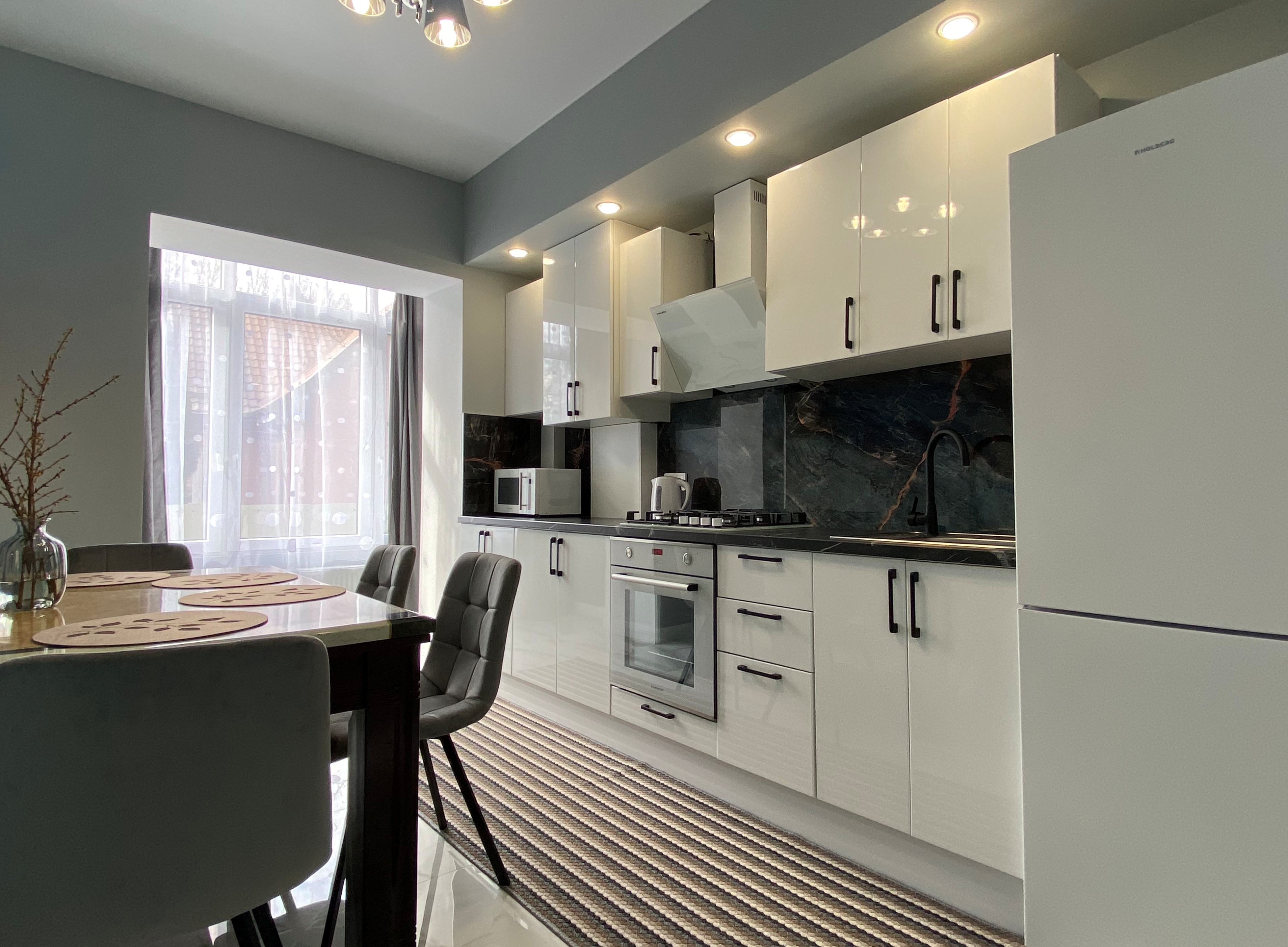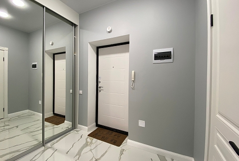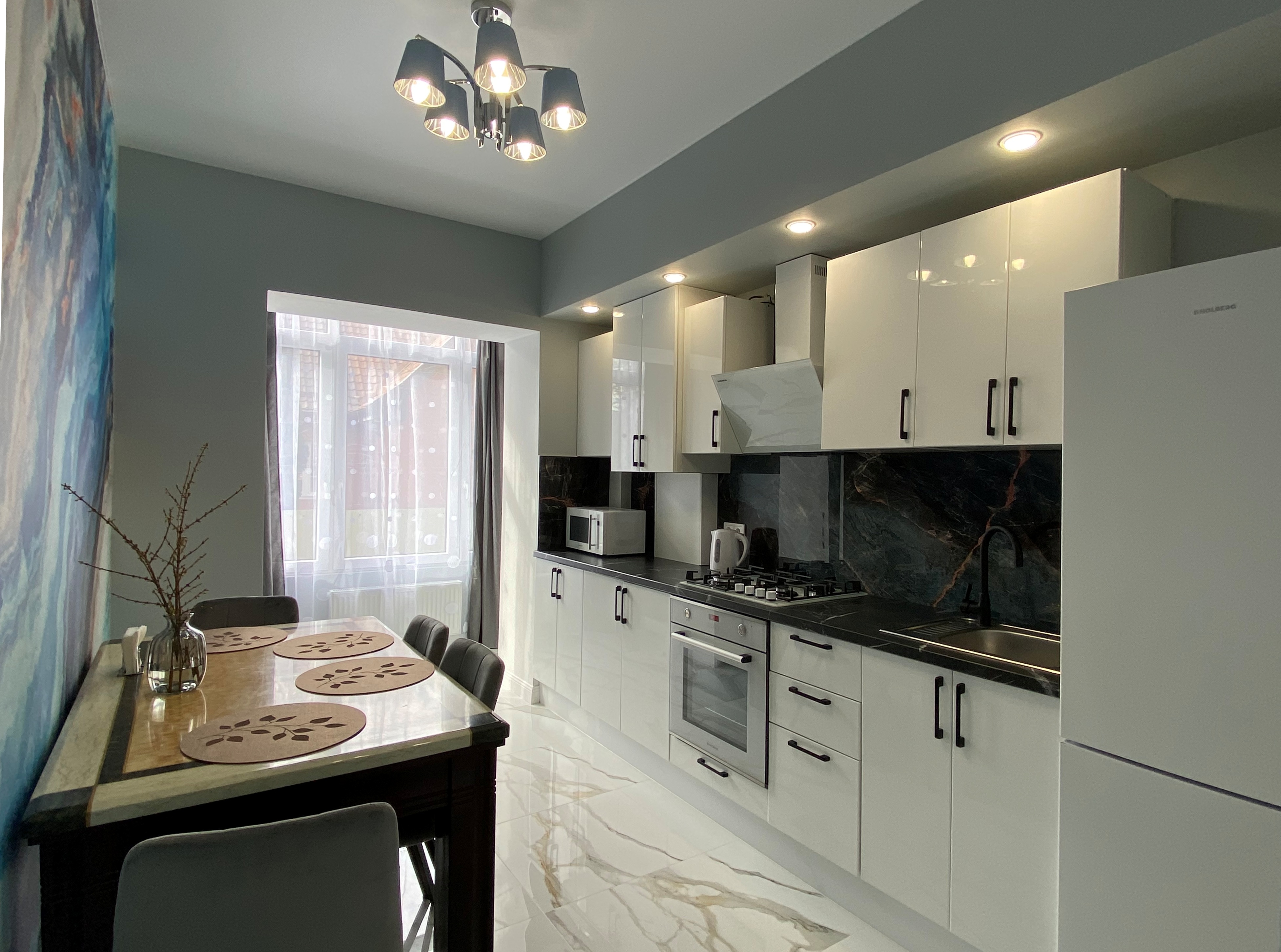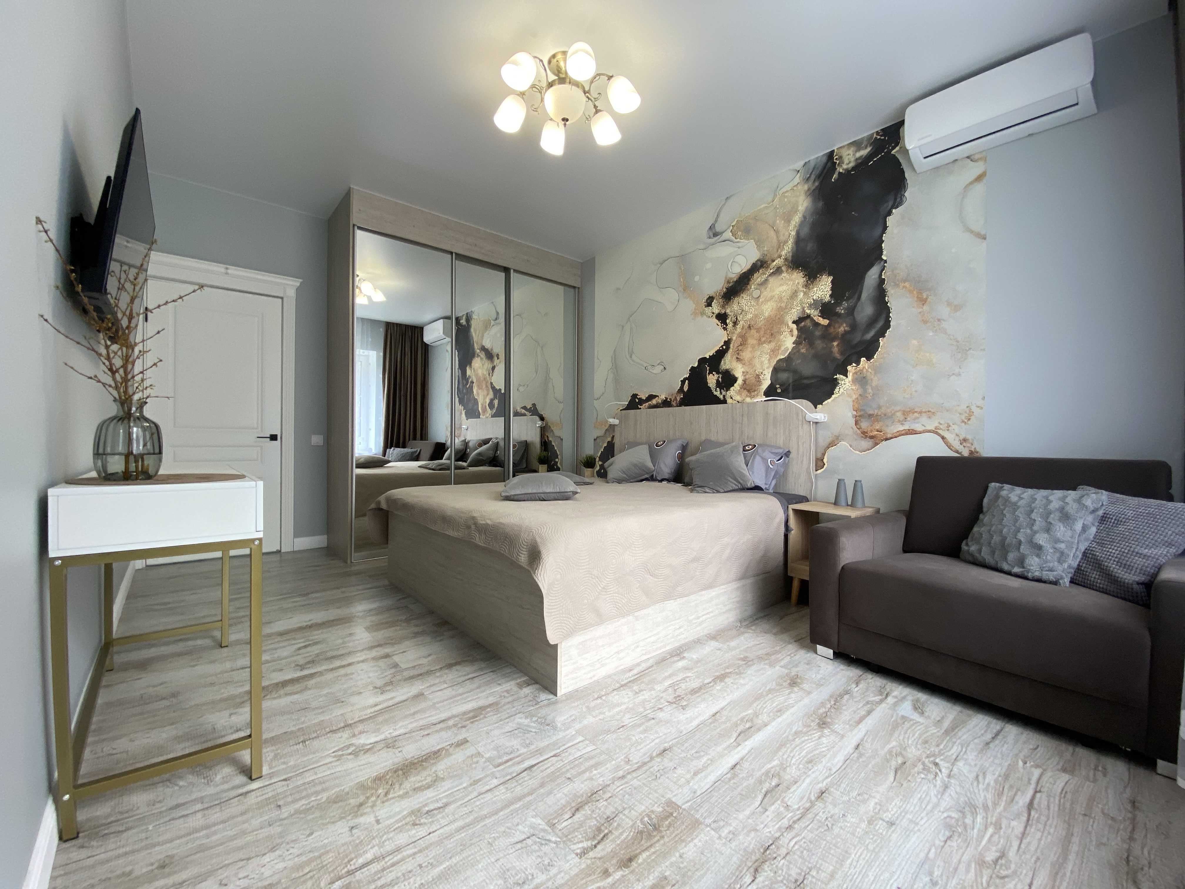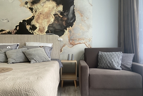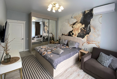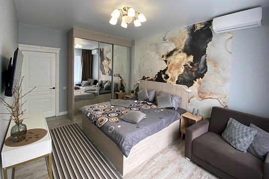 В номере: диван, зеркало, кровать двуспальная, прикроватные тумбочки, стол, стулья, шкаф, гладильная доска, духовой шкаф, кондиционер, микроволновая печь, набор посуды, плита электрическая, стиральная машина, сушилка для белья, телевизор, телевизор ЖК, утюг, холодильник, чайный набор посуды, электрочайник