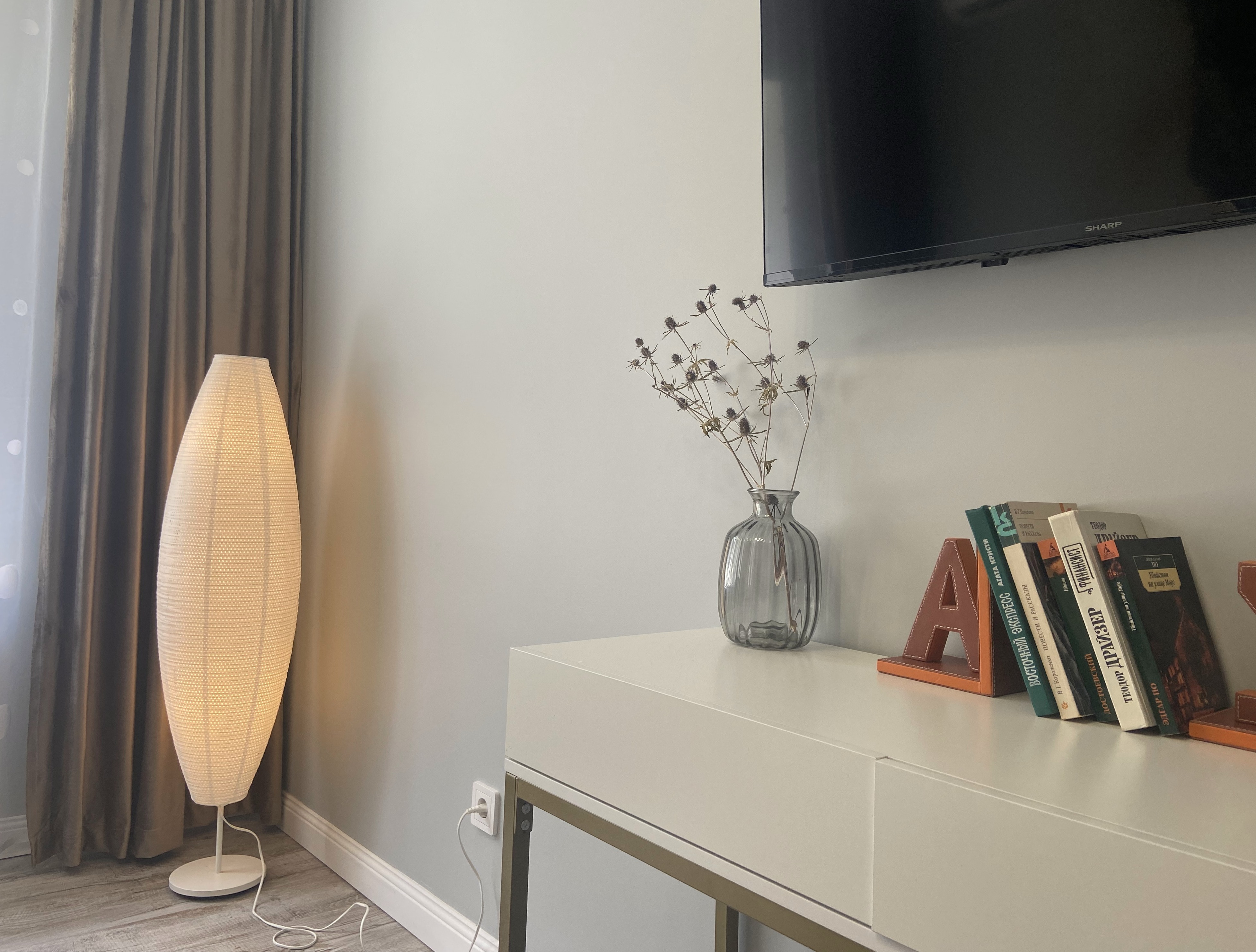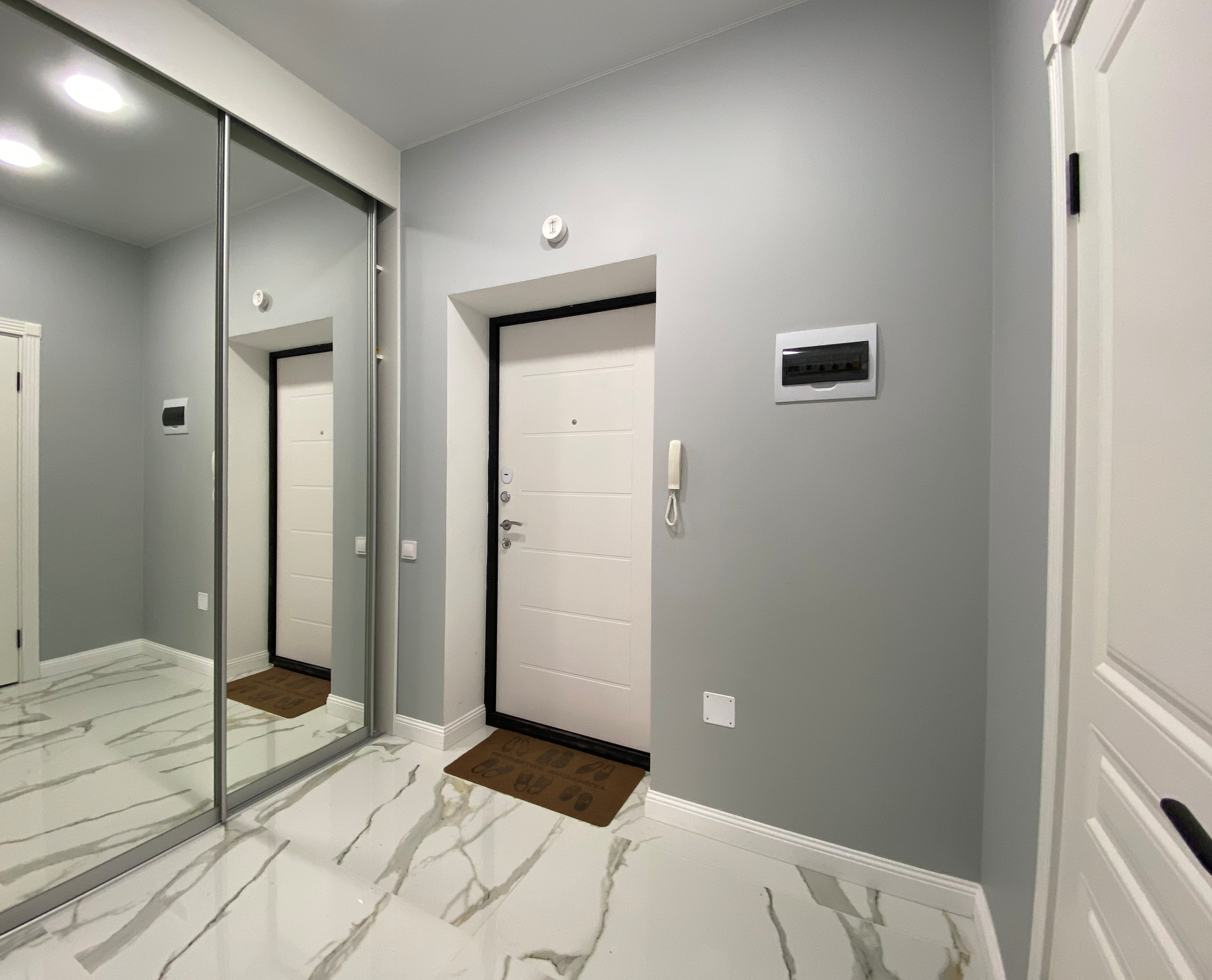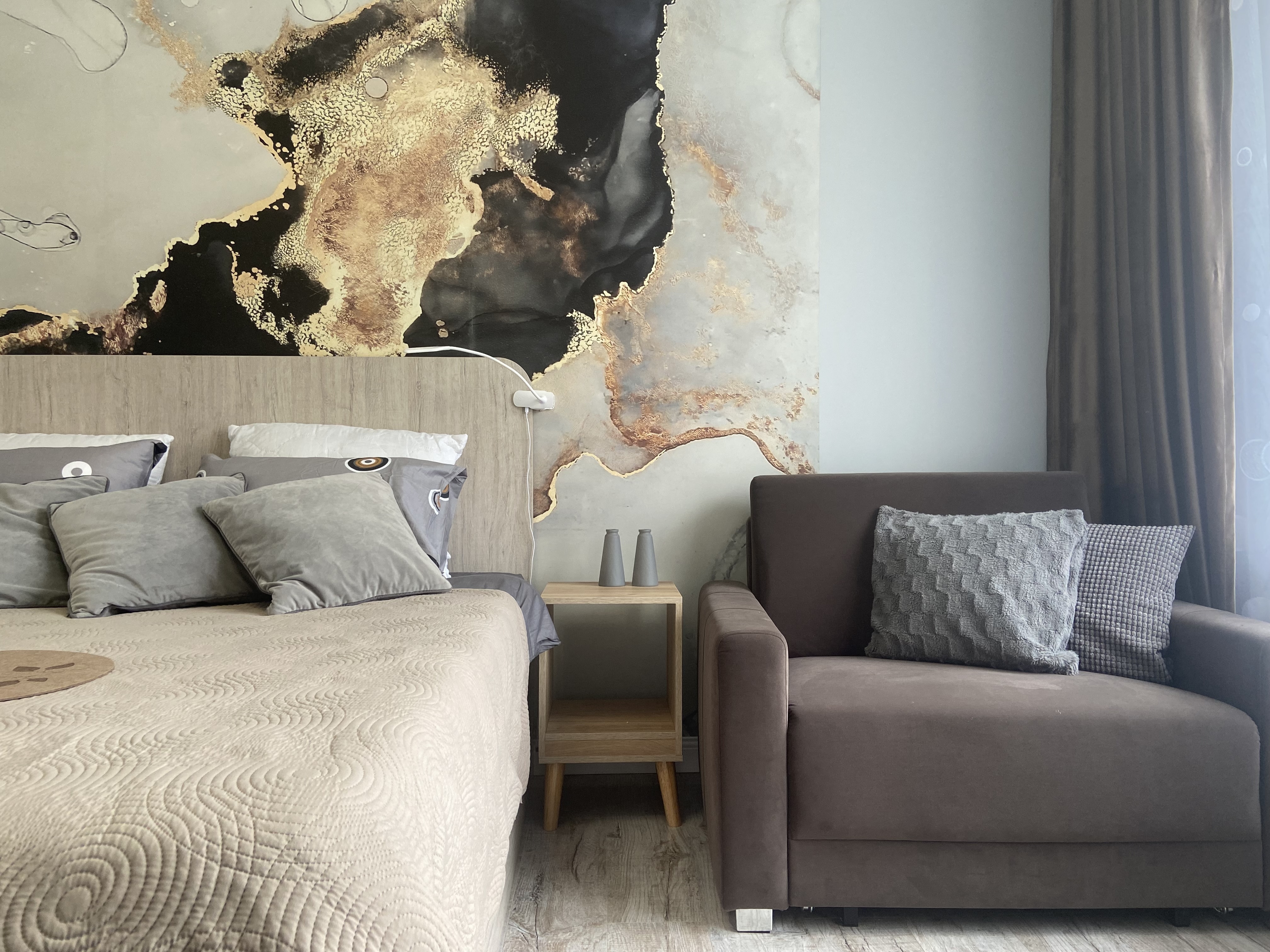 В номере: диван, зеркало, кровать двуспальная, прикроватные тумбочки, стол, стулья, шкаф, гладильная доска, духовой шкаф, кондиционер, микроволновая печь, набор посуды, плита электрическая, стиральная машина, сушилка для белья, телевизор, телевизор ЖК, утюг, холодильник, чайный набор посуды, электрочайник