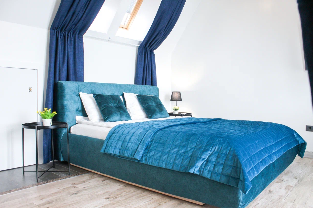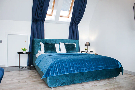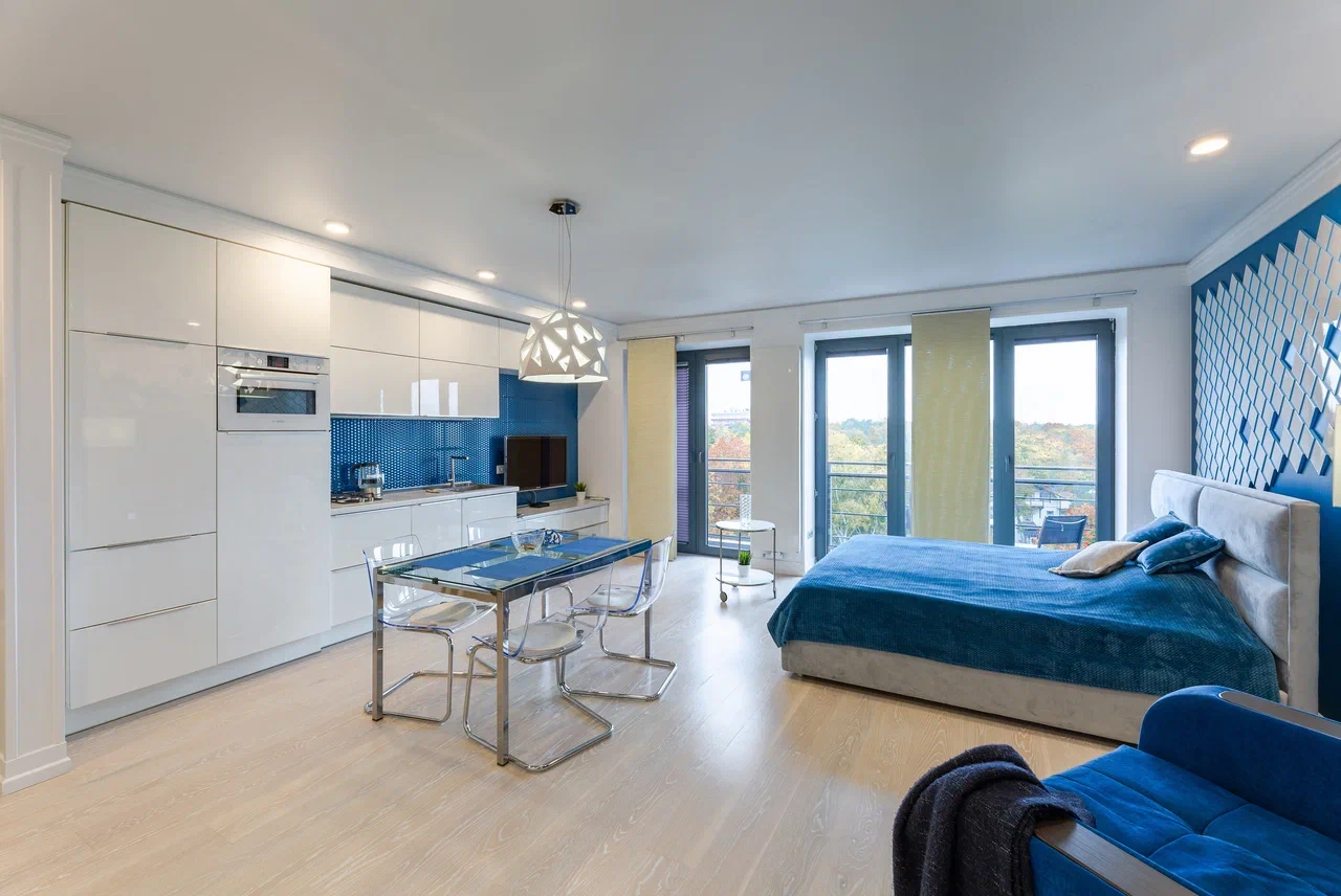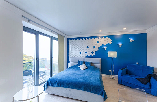 В номере: диван раскладной, зеркало, кресло-кровать, кровать двуспальная, кухонная мебель, прикроватные тумбочки, стол, столик журнальный, стулья, шкаф, гладильная доска, кондиционер, микроволновая печь, набор посуды, плита электрическая, посудомоечная машина, стиральная машина, телевизор ЖК, утюг, холодильник, электрочайник