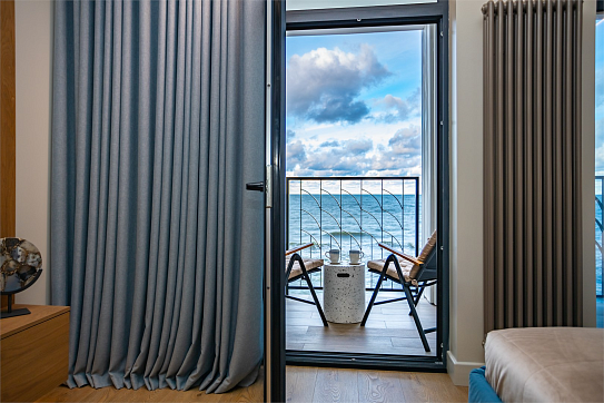 В номере: диван, кровать двуспальная, прикроватные тумбочки, стол, стулья, шкаф, кондиционер, микроволновая печь, набор посуды, плита электрическая, стиральная машина, сушилка для белья, телевизор ЖК, утюг, холодильник, чайный набор посуды, электрочайник