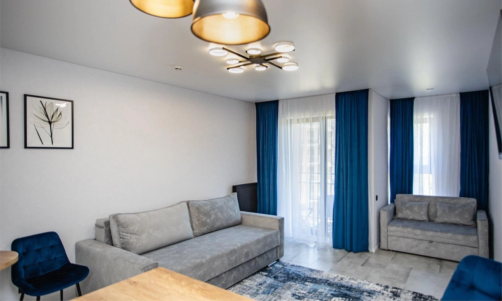 В номере: гардеробная, диван, зеркало, кровать двуспальная, стол, стулья, шкаф, гладильная доска, духовой шкаф, кондиционер, микроволновая печь, набор посуды, плита электрическая, стиральная машина, сушилка для белья, телевизор ЖК, утюг, холодильник, чайный набор посуды, электрочайник