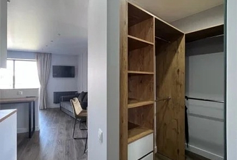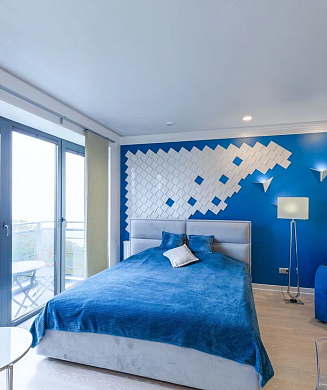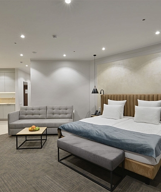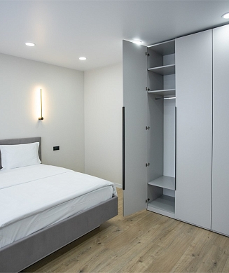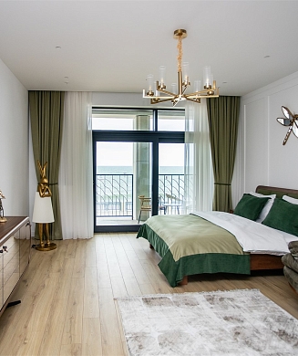В номере: гардеробная, диван, зеркало, кровать двуспальная, стол, стулья, шкаф, гладильная доска, духовой шкаф, кондиционер, микроволновая печь, набор посуды, плита электрическая, стиральная машина, сушилка для белья, телевизор ЖК, утюг, холодильник, чайный набор посуды, электрочайник