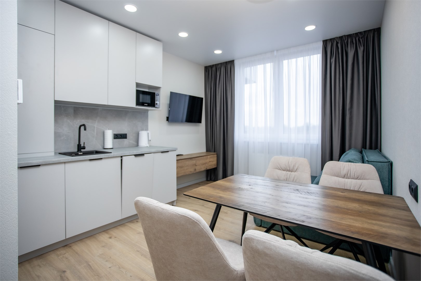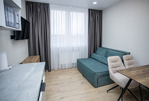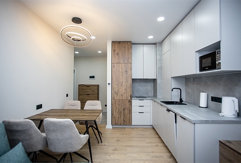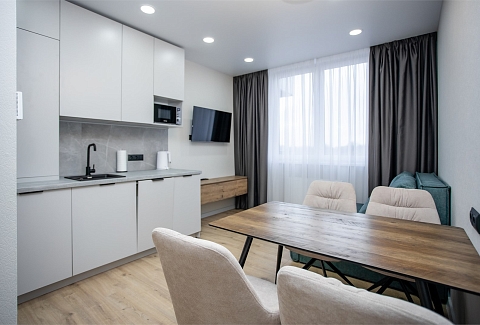 Экономия бюджета — стоимость проживания выгоднее, чем в шумных курортных зонах Комфорт, который делает проживание приятным: собственное парковочное место — гарантированное место для автомобиля под окнами. Бесконтактное заселение — получайте код доступа в удобное время, без ожидания. Продуманное пространство для жизни: просторная спальня с кроватью Queen-size и системой хранения — место для отдыха и хранения вещей. Современная кухня-гостиная с техникой премиум-класса (встроенный холодильник, посудомоечная машина, индукционная плита) . Полный набор посуды — готовьте с удовольствием, как дома. Зона отдыха с диваном-трансформером, Smart-TV и высокоскоростным Wi-Fi.