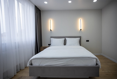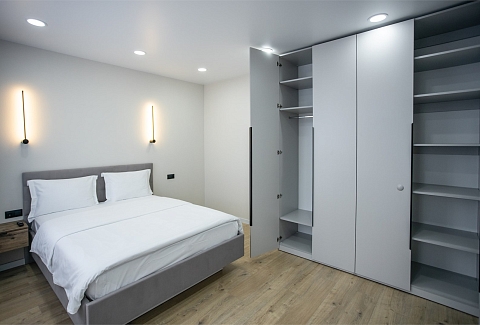 В номере: вешалка, диван, зеркало, кровать двуспальная, прикроватные тумбочки, стол, стулья, шкаф, гладильная доска, духовой шкаф, кондиционер, микроволновая печь, набор посуды, плита электрическая, стиральная машина, сушилка для белья, телевизор ЖК, утюг, холодильник, чайный набор посуды, электрочайник