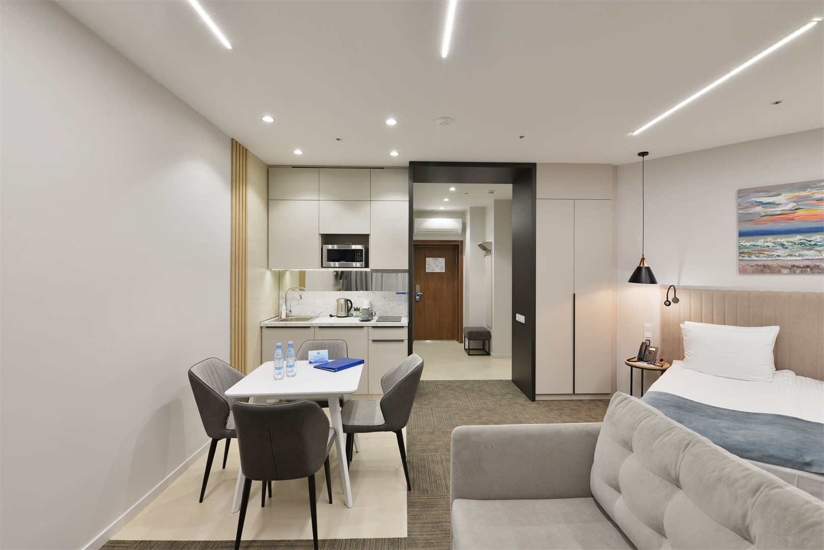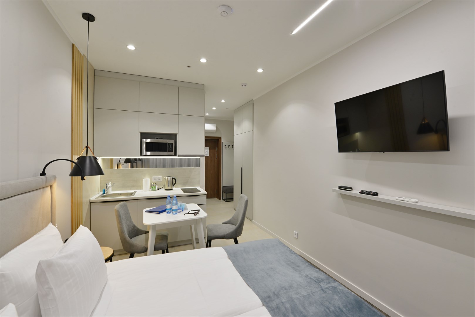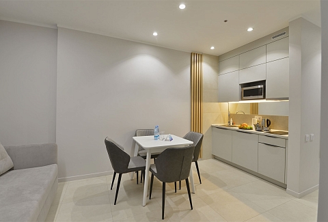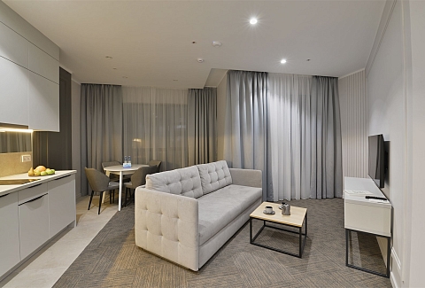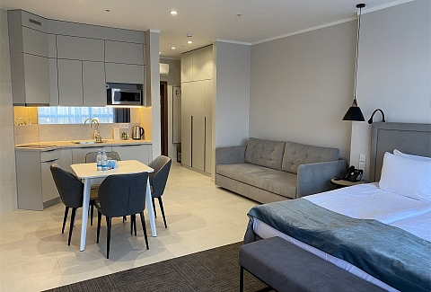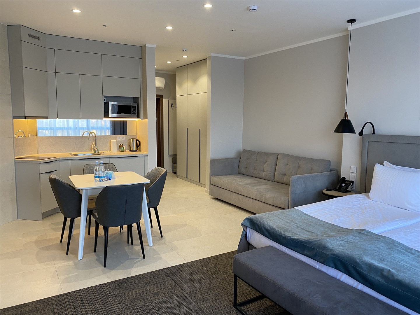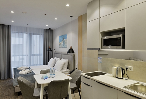 В номере: вешалка, гардеробная, диван раскладной, зеркало, кресло-кровать, кровати односпальные /одна двуспальная кровать, кухонная мебель, прикроватные тумбочки, стол, стол для компьютера, стулья, гладильная доска, кондиционер, микроволновая печь, мини-холодильник, набор посуды, плита электрическая, сейф, телевизор ЖК, телефон, утюг, холодильник, электрочайник