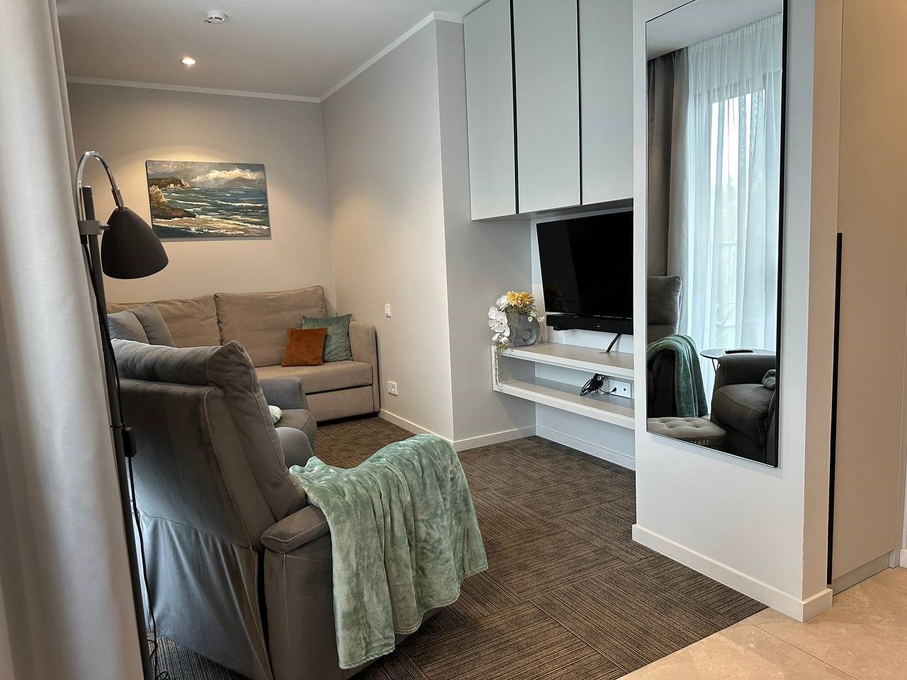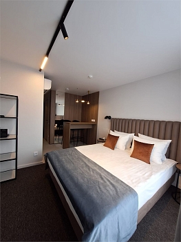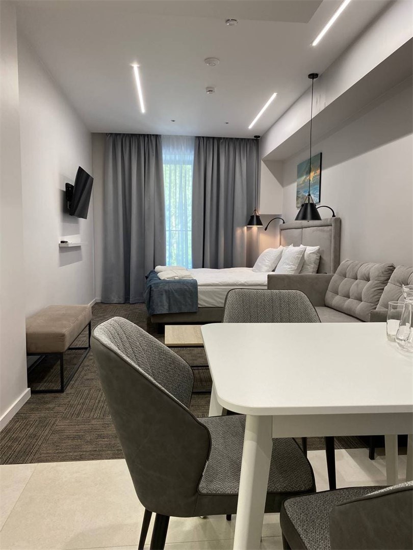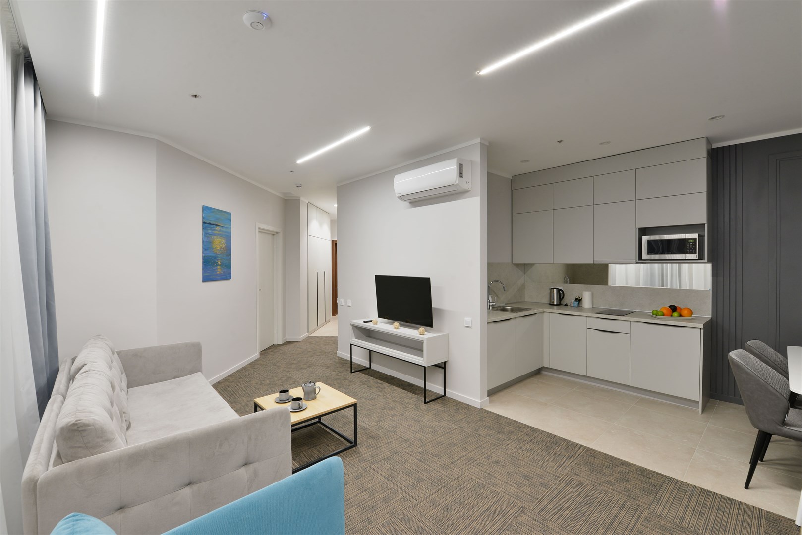 В номере: вешалка, гардеробная, диван раскладной, зеркало, кресло-кровать, кровати односпальные /одна двуспальная кровать, кухонная мебель, прикроватные тумбочки, стол, стол для компьютера, стулья, гладильная доска, кондиционер, микроволновая печь, мини-холодильник, набор посуды, плита электрическая, сейф, телевизор ЖК, телефон, утюг, холодильник, электрочайник