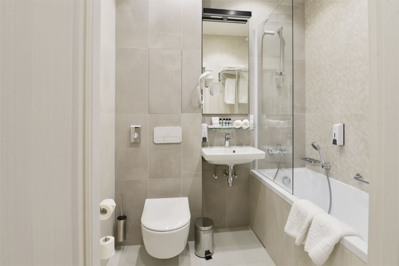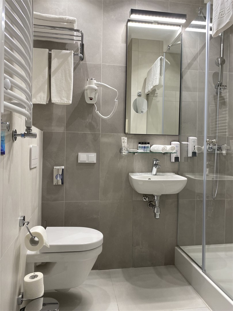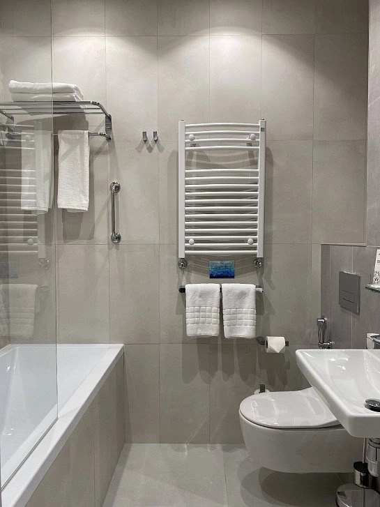 Санузел: с ванной или душевой кабиной, тапочки, туалетные принадлежности, фен, халат