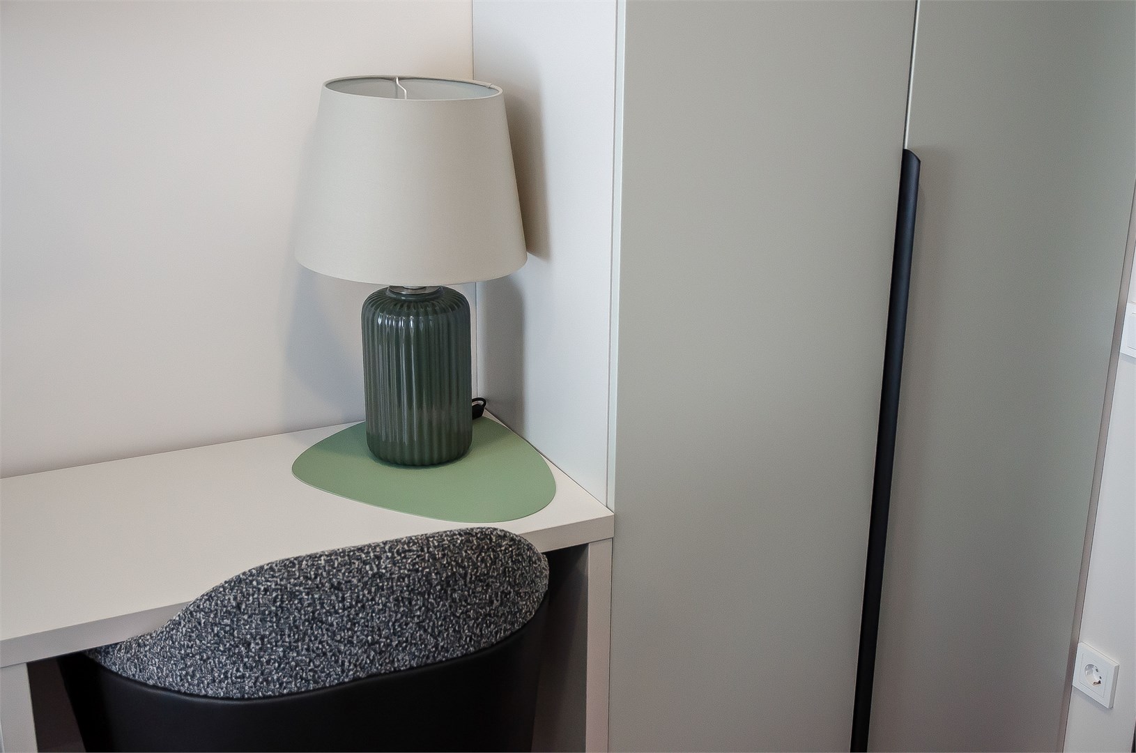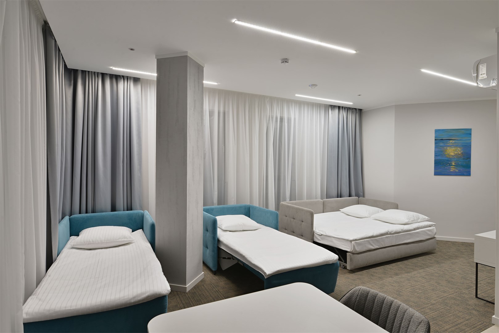 В номере: вешалка, диван, зеркало, кровати односпальные, кровать двуспальная, прикроватные тумбочки, стол, стулья, шкаф, гладильная доска, кондиционер, микроволновая печь, мини-холодильник, набор посуды, плита электрическая, посудомоечная машина, сейф, стиральная машина, телевизор ЖК, утюг, чайный набор посуды, электрочайник
