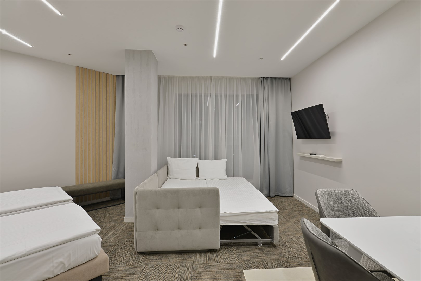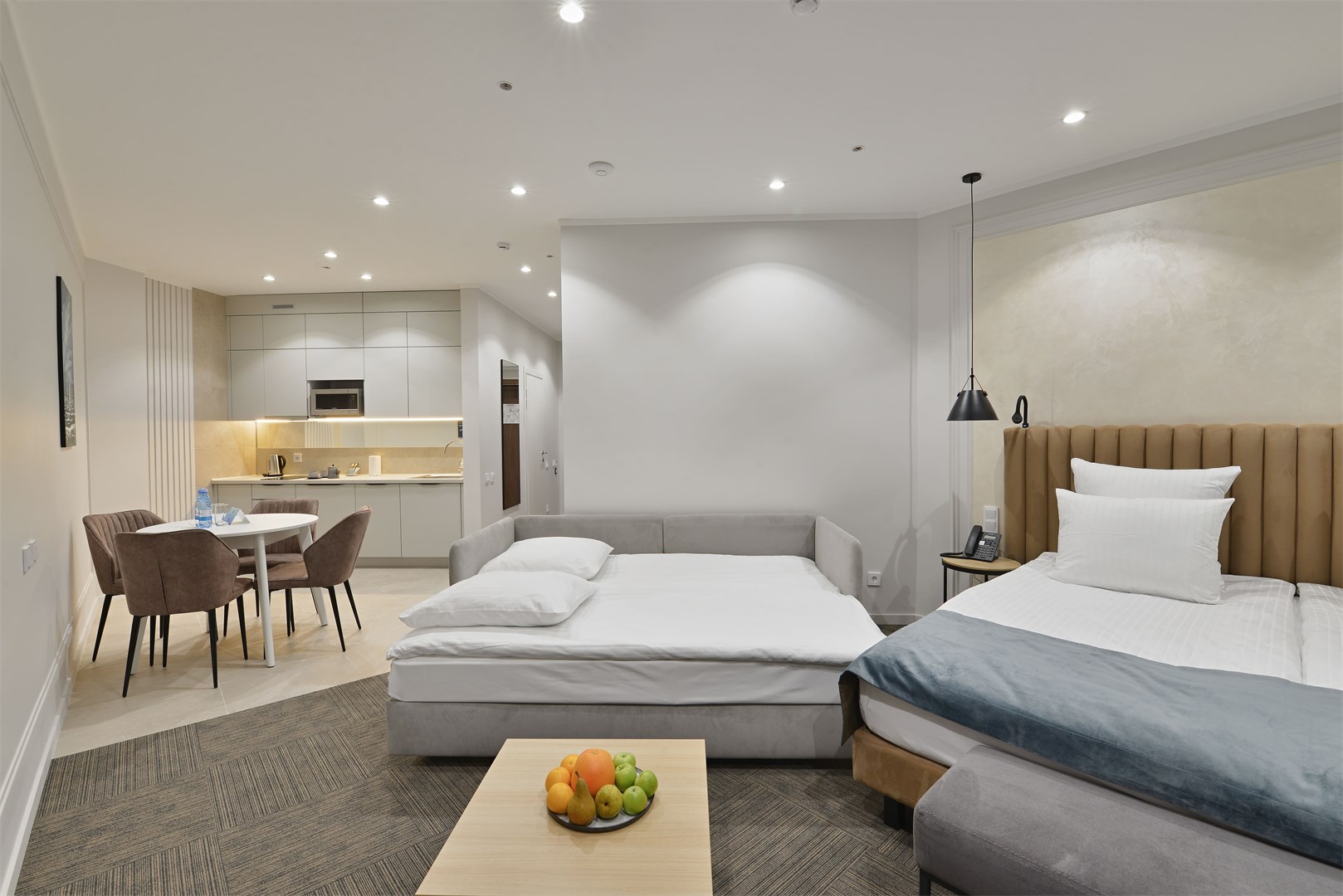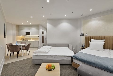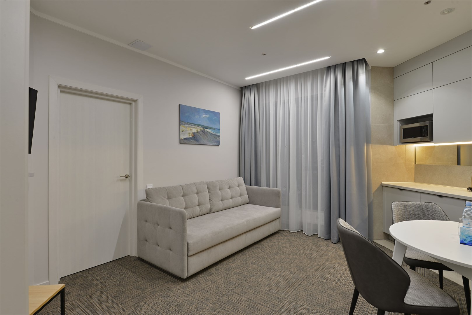 В номере: вешалка, диван раскладной, зеркало, кресло-кровать, кровати односпальные /одна двуспальная кровать, кухонная мебель, прикроватные тумбочки, стол, столик журнальный, стулья, шкаф-купе, гладильная доска, кондиционер, микроволновая печь, мини-холодильник, набор посуды, плита электрическая, сейф, телевизор ЖК, телефон, утюг, холодильник, электрочайник