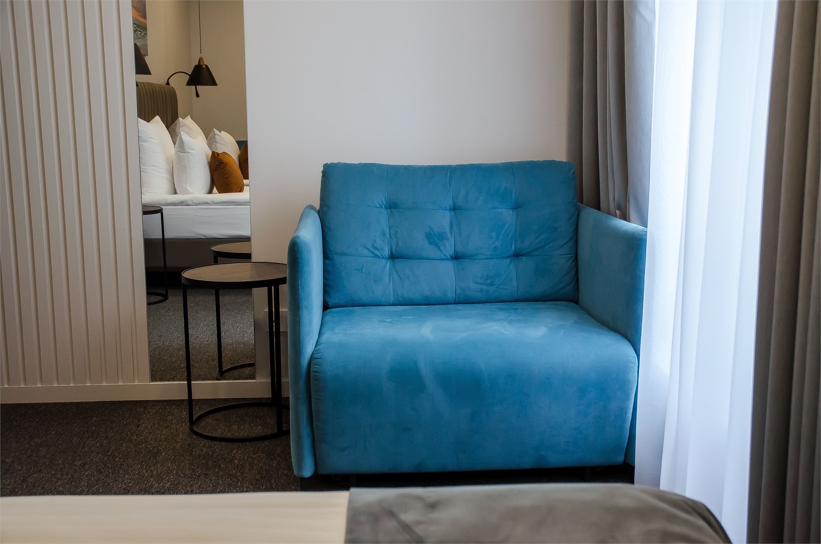 В номере: вешалка, диван, зеркало, кресла, кровати односпальные /одна двуспальная кровать, прикроватные тумбочки, стол, стулья, шкаф, гладильная доска, кондиционер, микроволновая печь, набор посуды, плита электрическая, сейф, телевизор ЖК, телефон, утюг, холодильник, чайный набор посуды, электрочайник