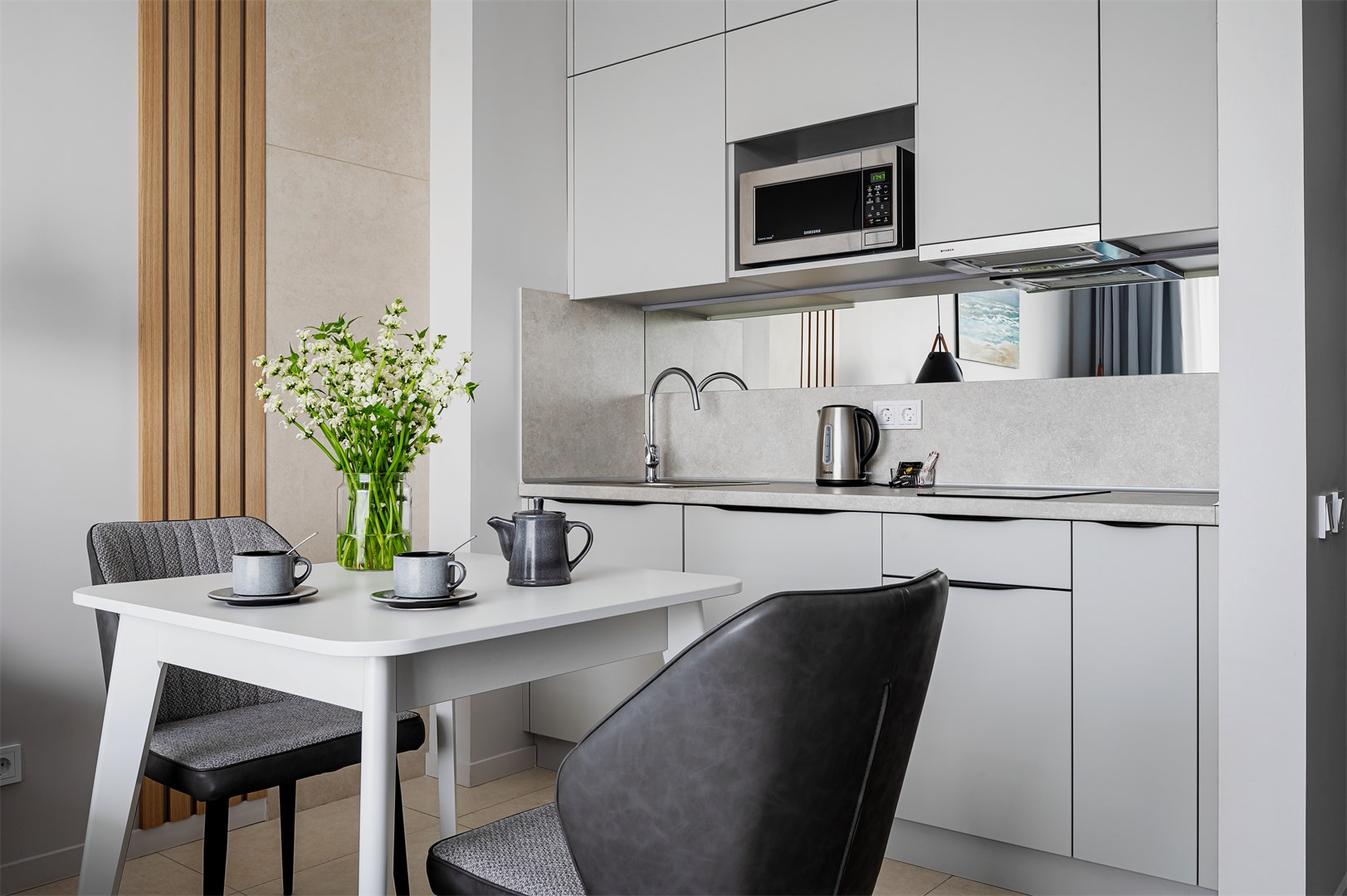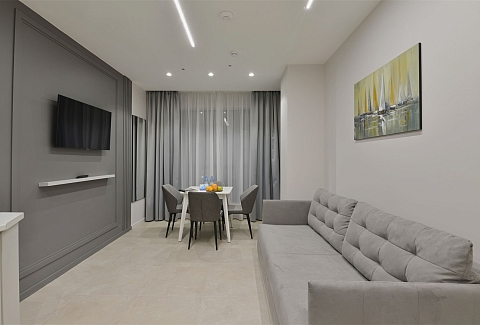 В номере: вешалка, диван раскладной, зеркало, кресло-кровать, кровати односпальные /одна двуспальная кровать, кухонная мебель, прикроватные тумбочки, стол, столик журнальный, стулья, шкаф-купе, гладильная доска, кондиционер, микроволновая печь, мини-холодильник, набор посуды, плита электрическая, посудомоечная машина, телевизор ЖК, телефон, утюг, холодильник, электрочайник