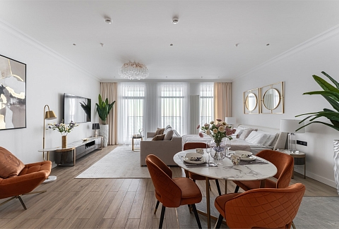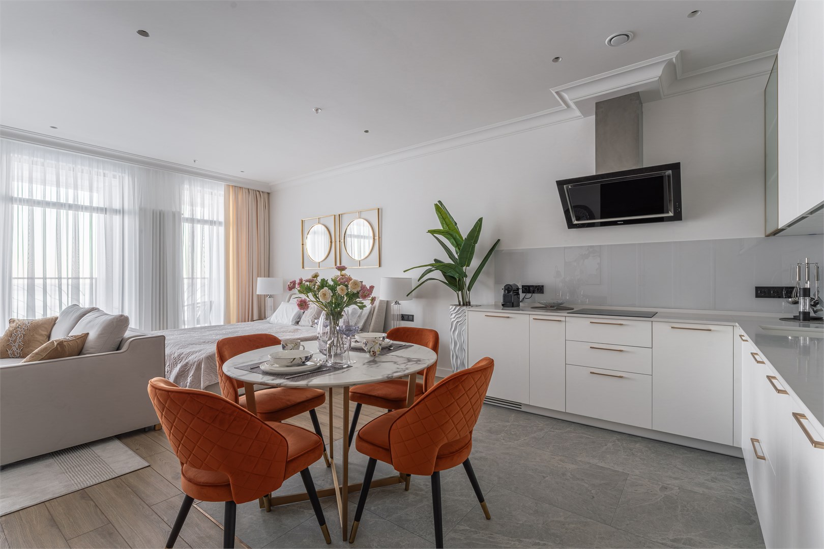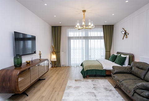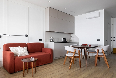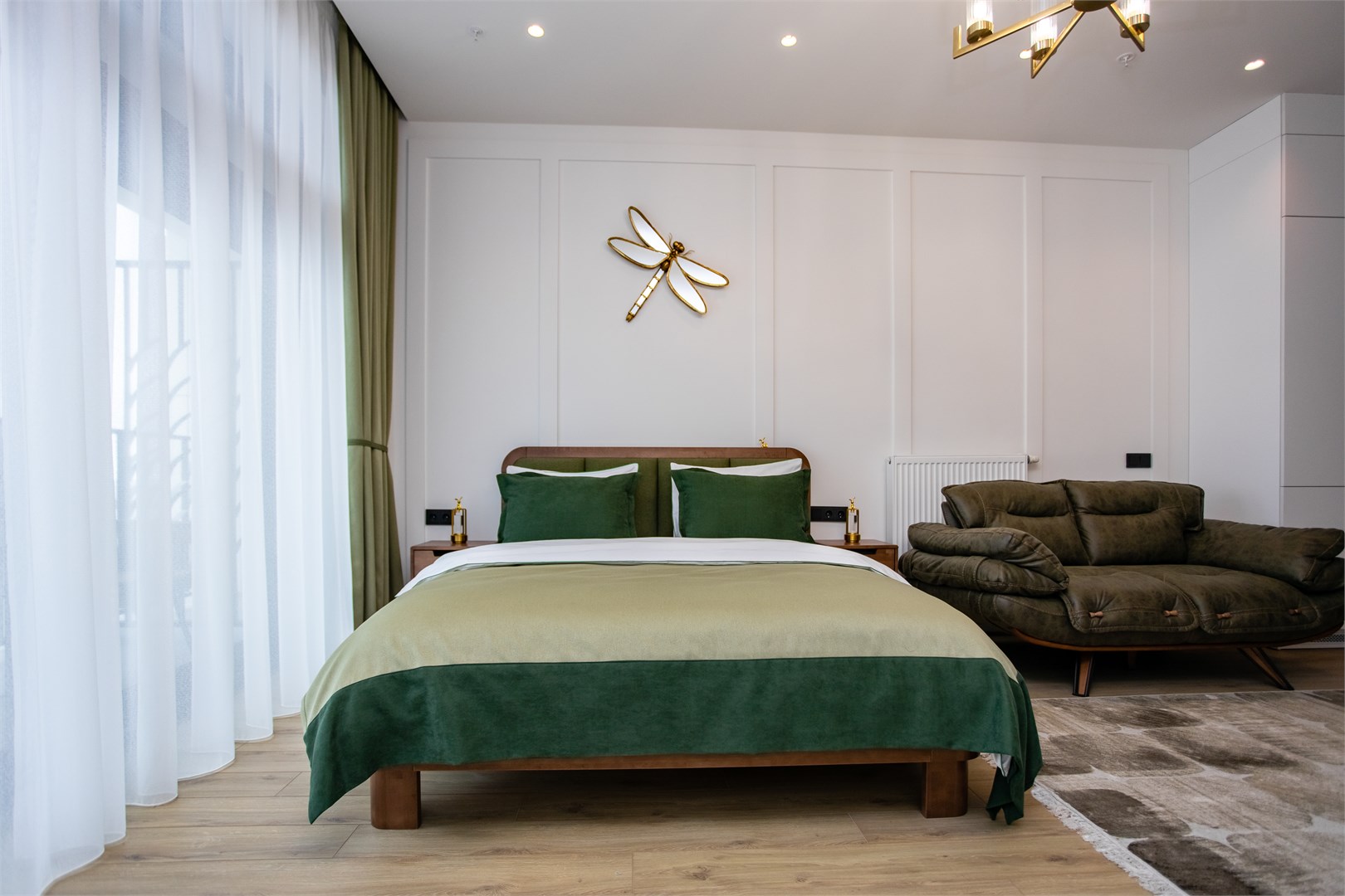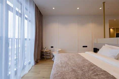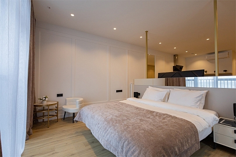 В номере: диван, зеркало, кресло, кровать двуспальная, стол, стулья, шкаф, гладильная доска, кондиционер, кофемашина, микроволновая печь, набор посуды, плита, телевизор ЖК, утюг, холодильник, чайный набор посуды, электрочайник