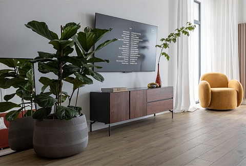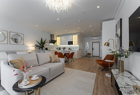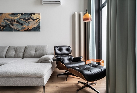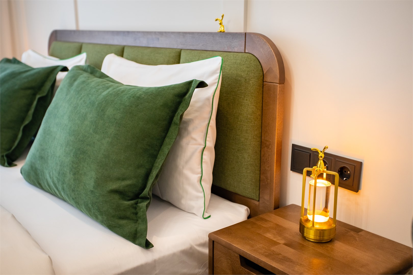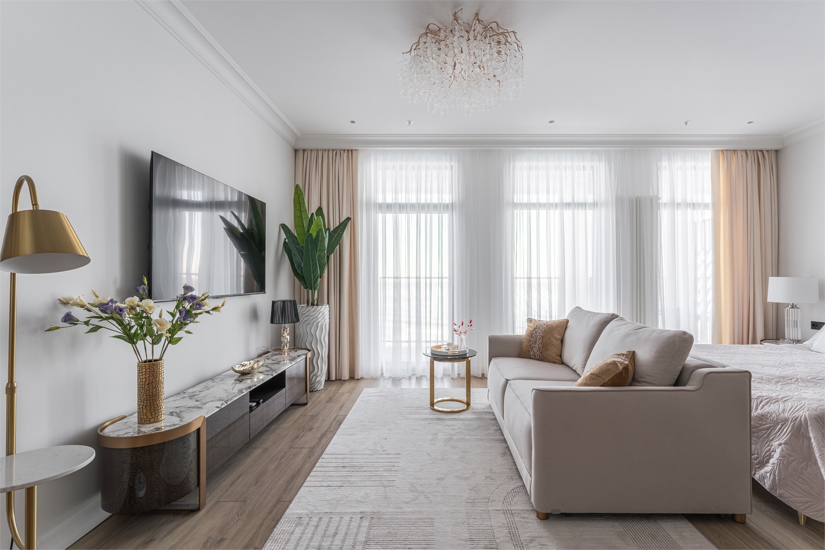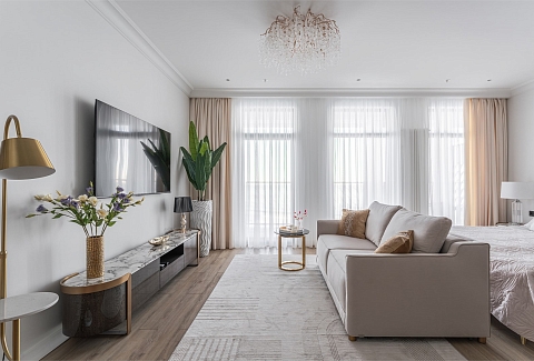 В номере: диван, зеркало, кресло, кровать двуспальная, стол, стулья, шкаф, гладильная доска, кондиционер, кофемашина, микроволновая печь, набор посуды, плита, телевизор ЖК, утюг, холодильник, чайный набор посуды, электрочайник