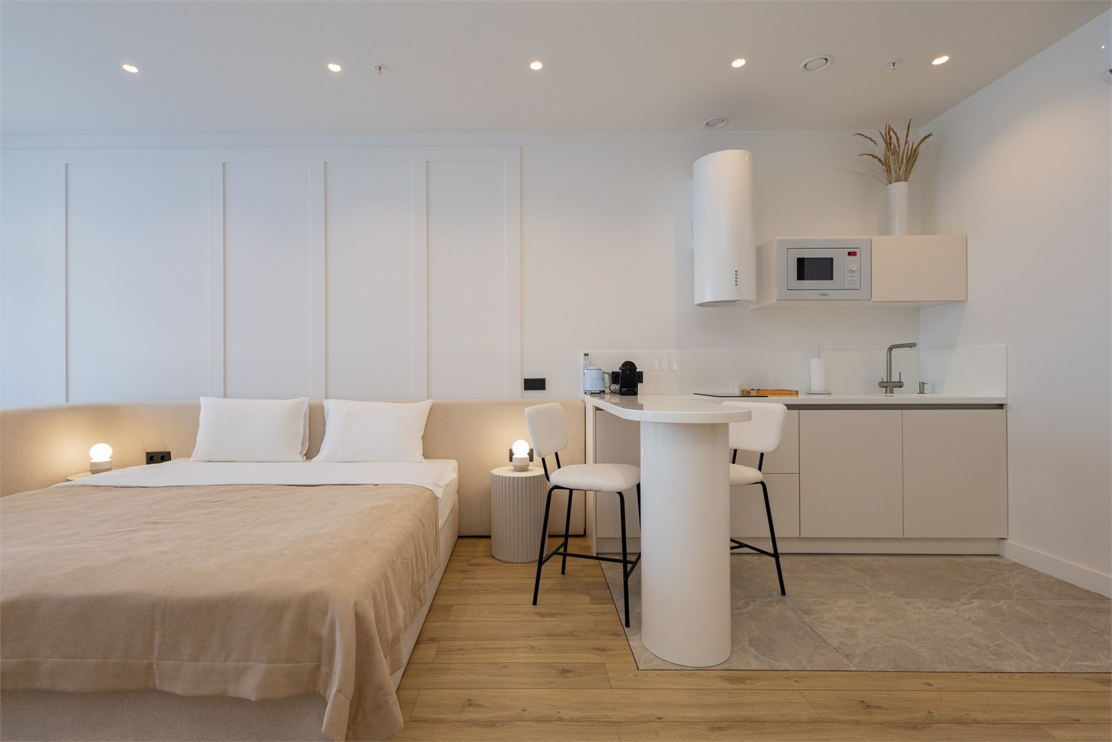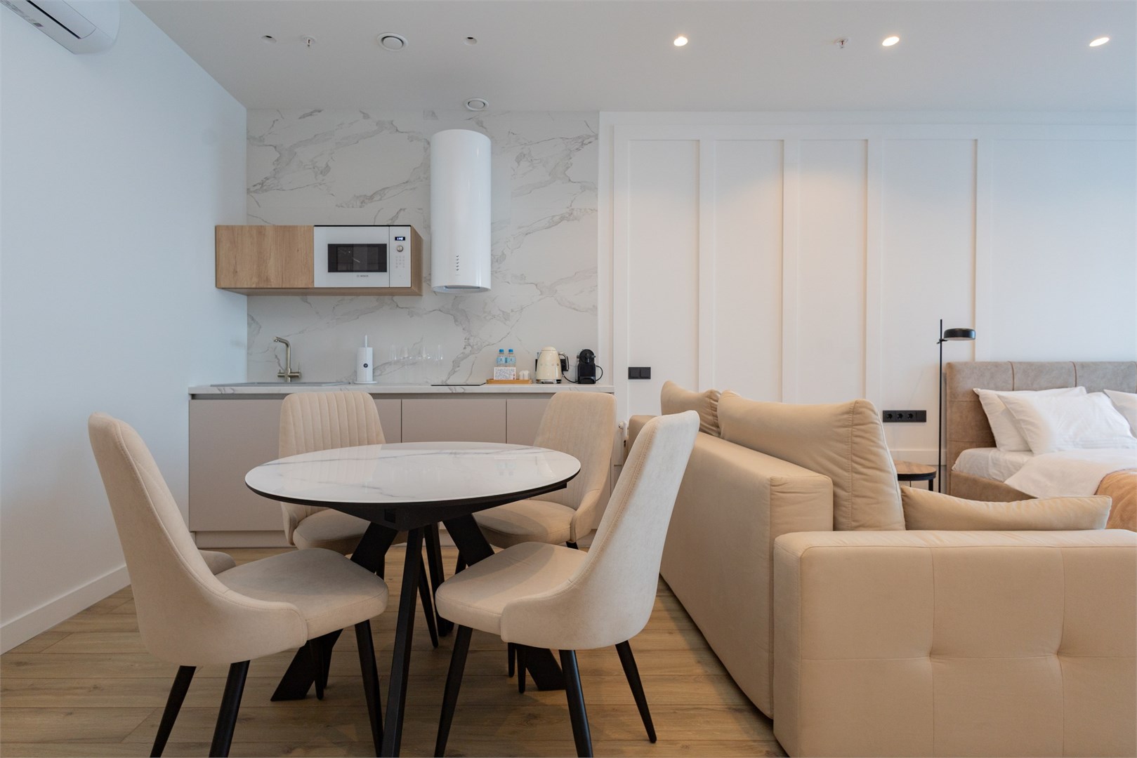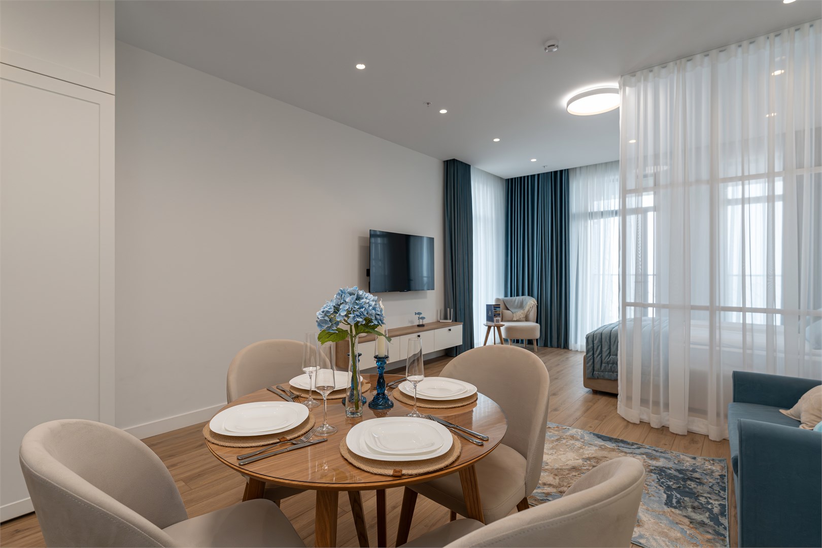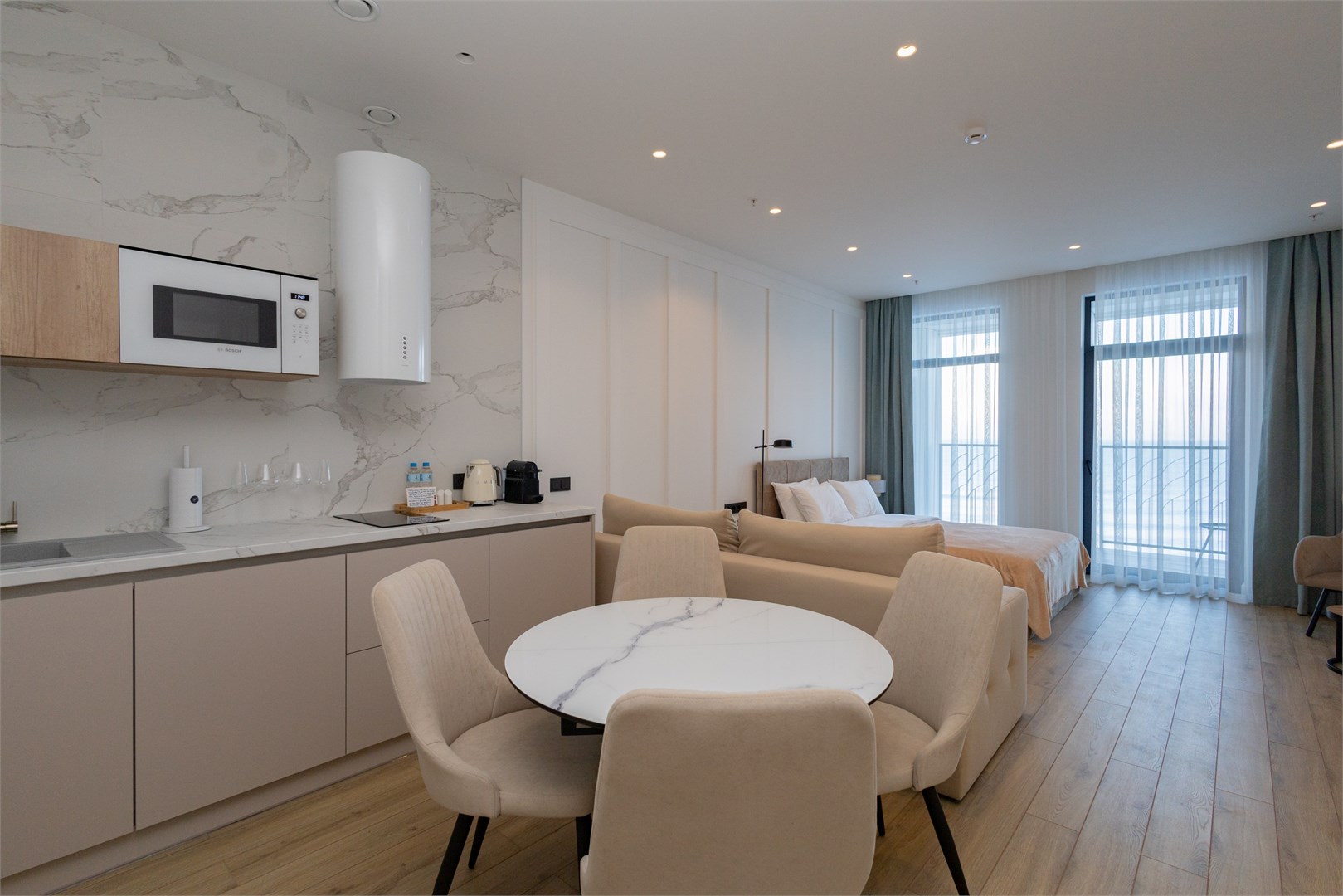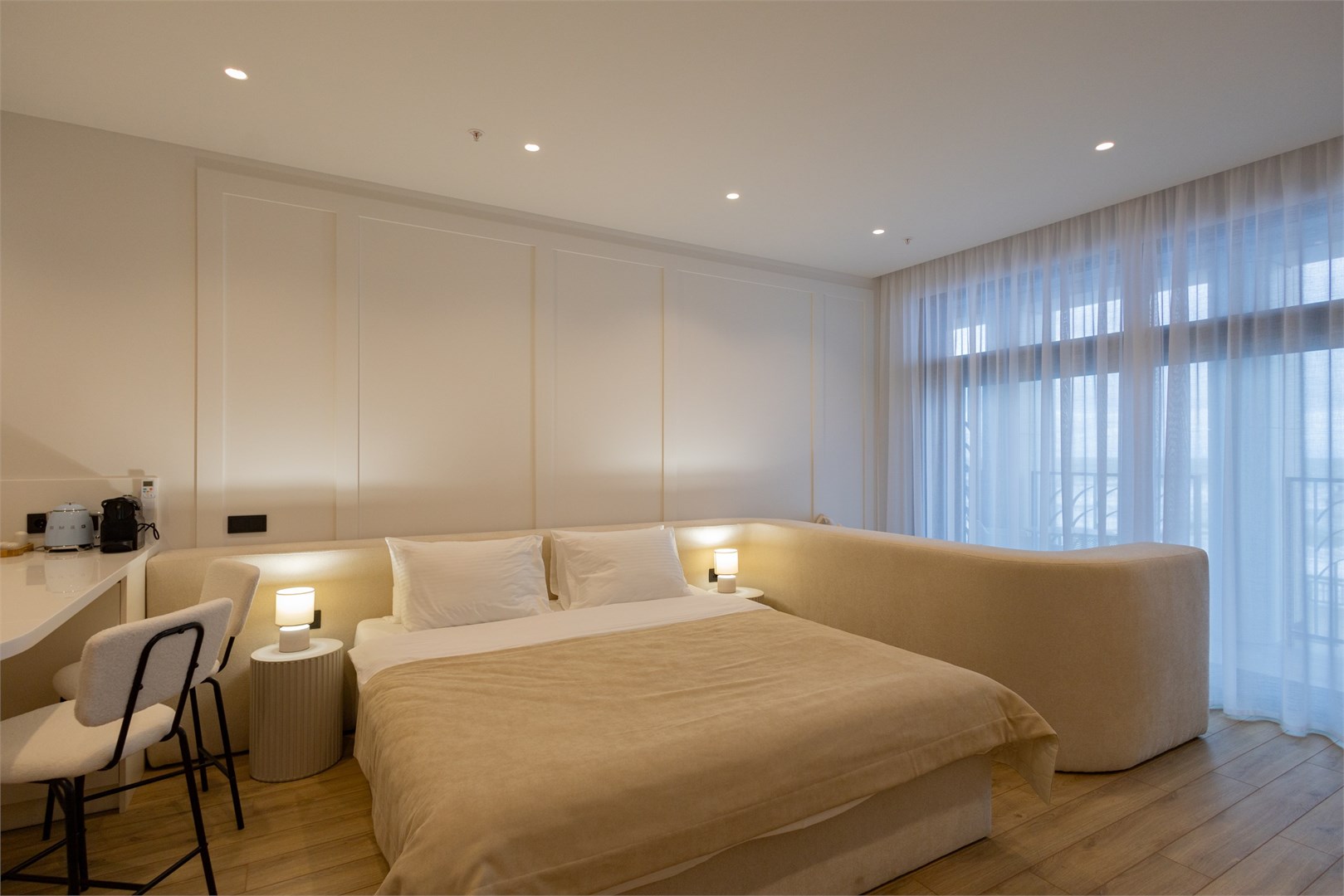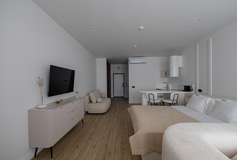В каждом номере предусмотрена собственная кухня с полным набором посуды, что даёт свободу в организации питания. Оснащение включает тихий кондиционер, стиральную машину, кофемашину, современную технику, а также санузел с феном, свежими полотенцами и гигиеническими принадлежностями. К приятным деталям можно отнести ортопедические матрасы, качественное постельное бельё, бесплатный скоростной Wi-Fi и телевизор. Для особого комфорта доступен сервис заказа еды из ресторанов прямо в номер.На территории отеля можно воспользоваться дополнительными услугами: заказ такси, уборка и любые другие удобства по запросу. Благодаря продуманной инфраструктуре здесь легко совмещать отдых и работу.Это пространство, созданное для тех, кто ценит вид на море, тишину и независимость. Атмосфера располагает к расслабленному отдыху, при этом остаётся функциональной для деловых поездок. Апартаменты одинаково подойдут парам, семьям с детьми и тем, кто приехал работать у воды.