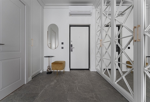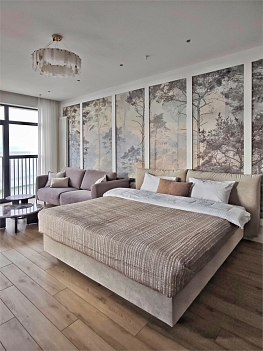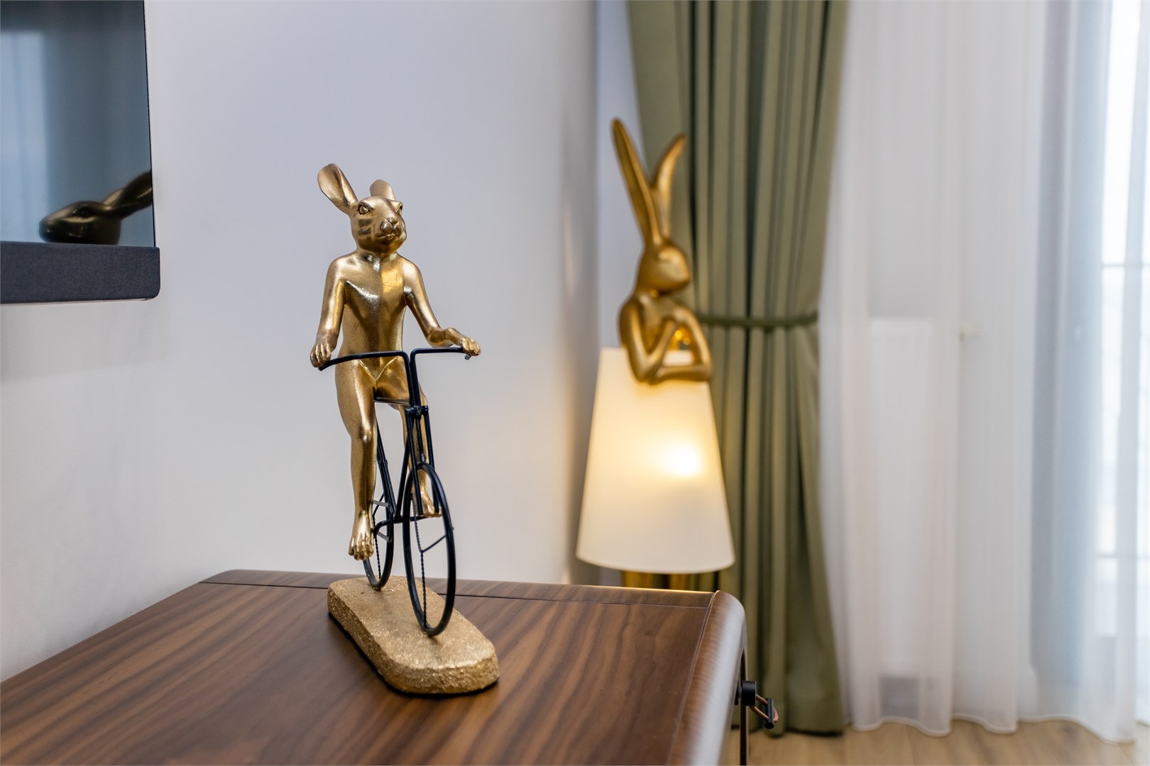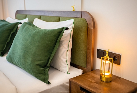В номере: диван, зеркало, кровать двуспальная, стол, стулья, шкаф, гладильная доска, кондиционер, кофемашина, микроволновая печь, набор посуды, телевизор ЖК, утюг, холодильник, чайный набор посуды, электрочайник