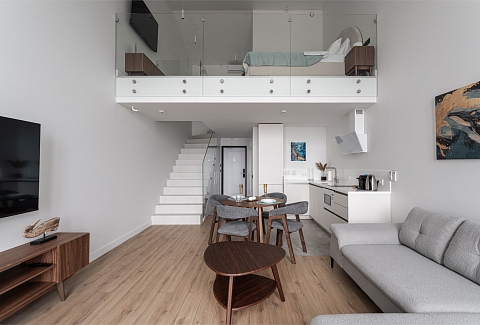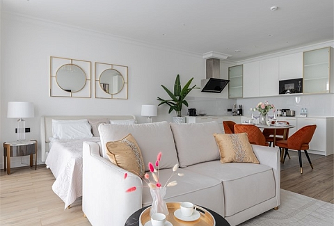 В номере: диван, зеркало, кровать двуспальная, стол, стулья, шкаф, гладильная доска, кондиционер, кофемашина, микроволновая печь, набор посуды, плита, телевизор ЖК, чайный набор посуды, электрочайник