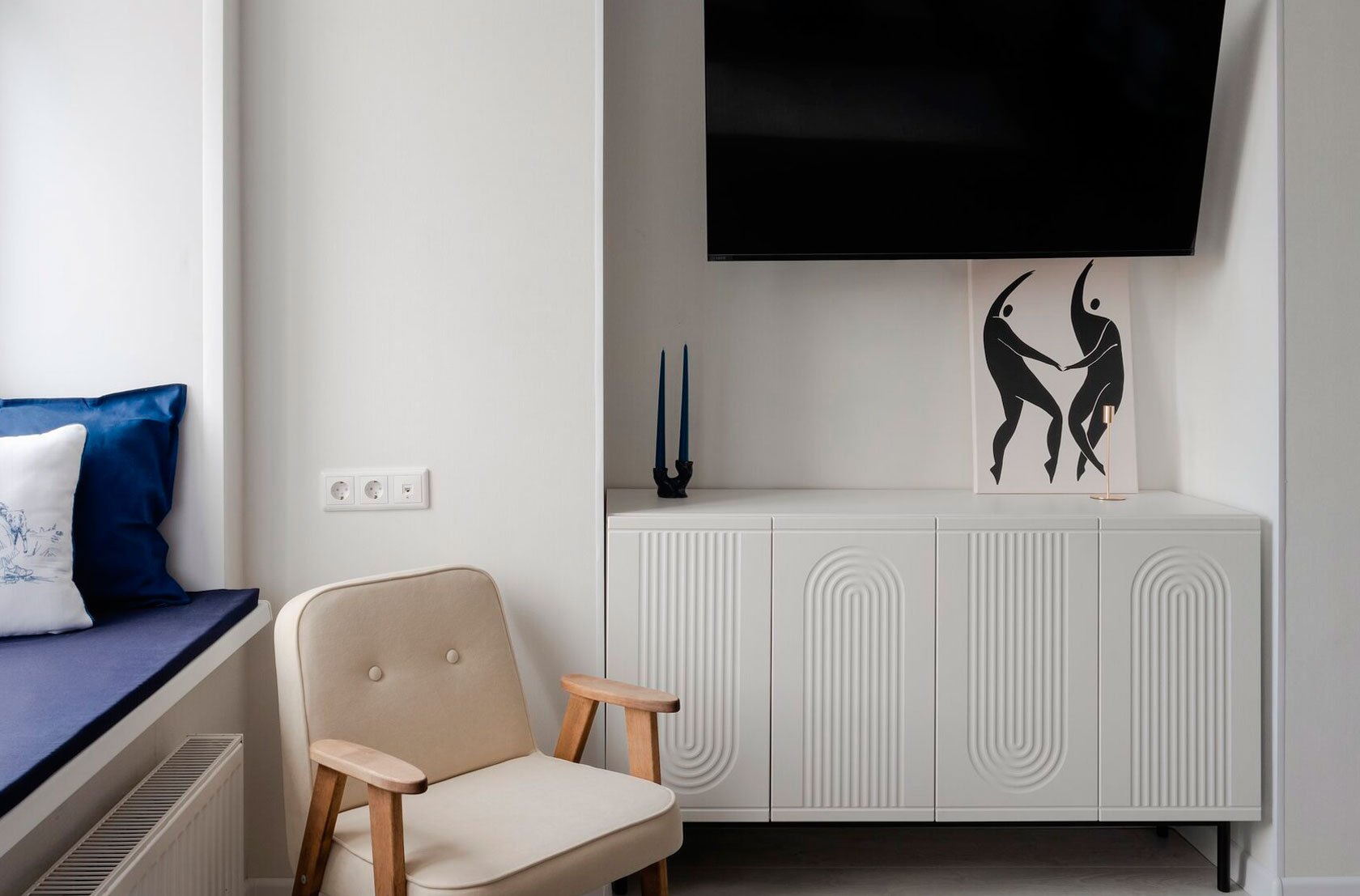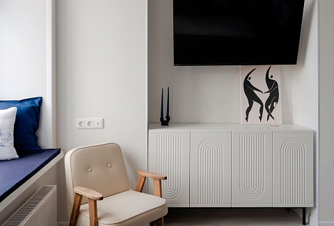 В номере: вешалка, зеркало, кресло, кровать двуспальная, стол, стулья, шкаф, микроволновая печь, мини-холодильник, набор посуды, плита электрическая, стиральная машина, телевизор, электрочайник