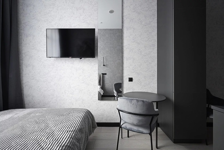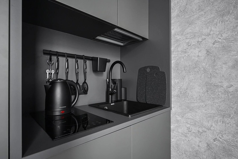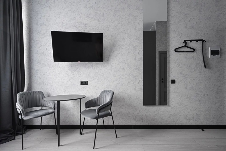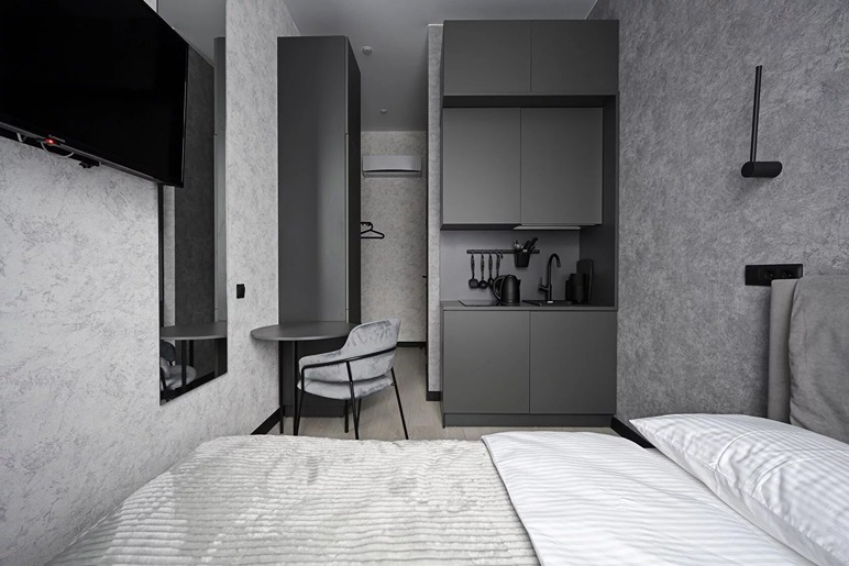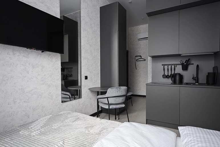 В номере: вешалка, зеркало, кровать двуспальная, стол, стулья, шкаф, кондиционер, микроволновая печь, мини-холодильник, набор посуды, плита электрическая, стиральная машина, телевизор, электрочайник