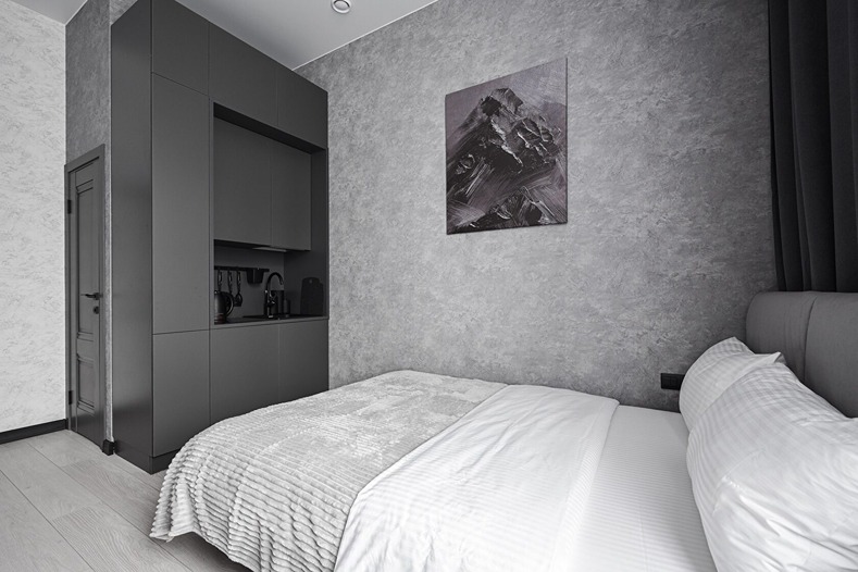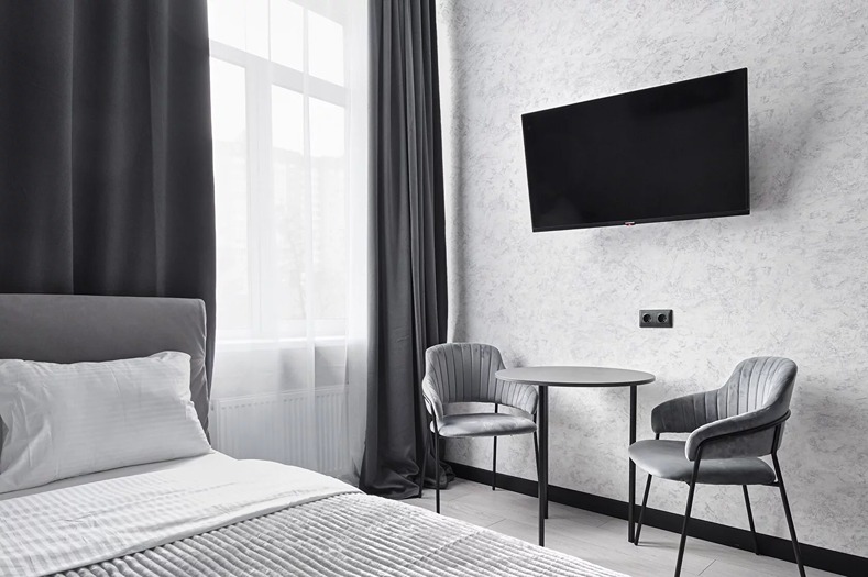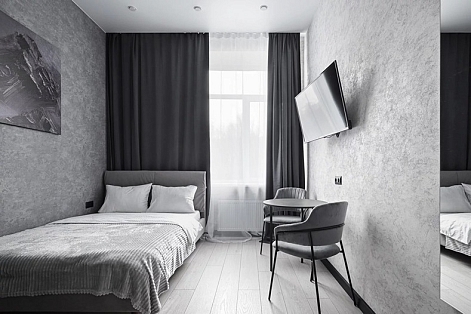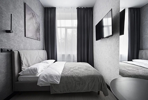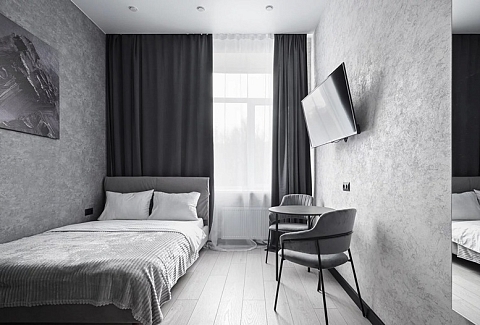 В номере: вешалка, диван, зеркало, кровать двуспальная, стол, стулья, шкаф, кондиционер, микроволновая печь, мини-холодильник, набор посуды, плита электрическая, стиральная машина, телевизор, электрочайник
